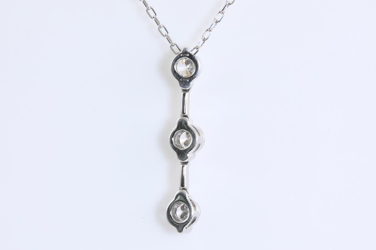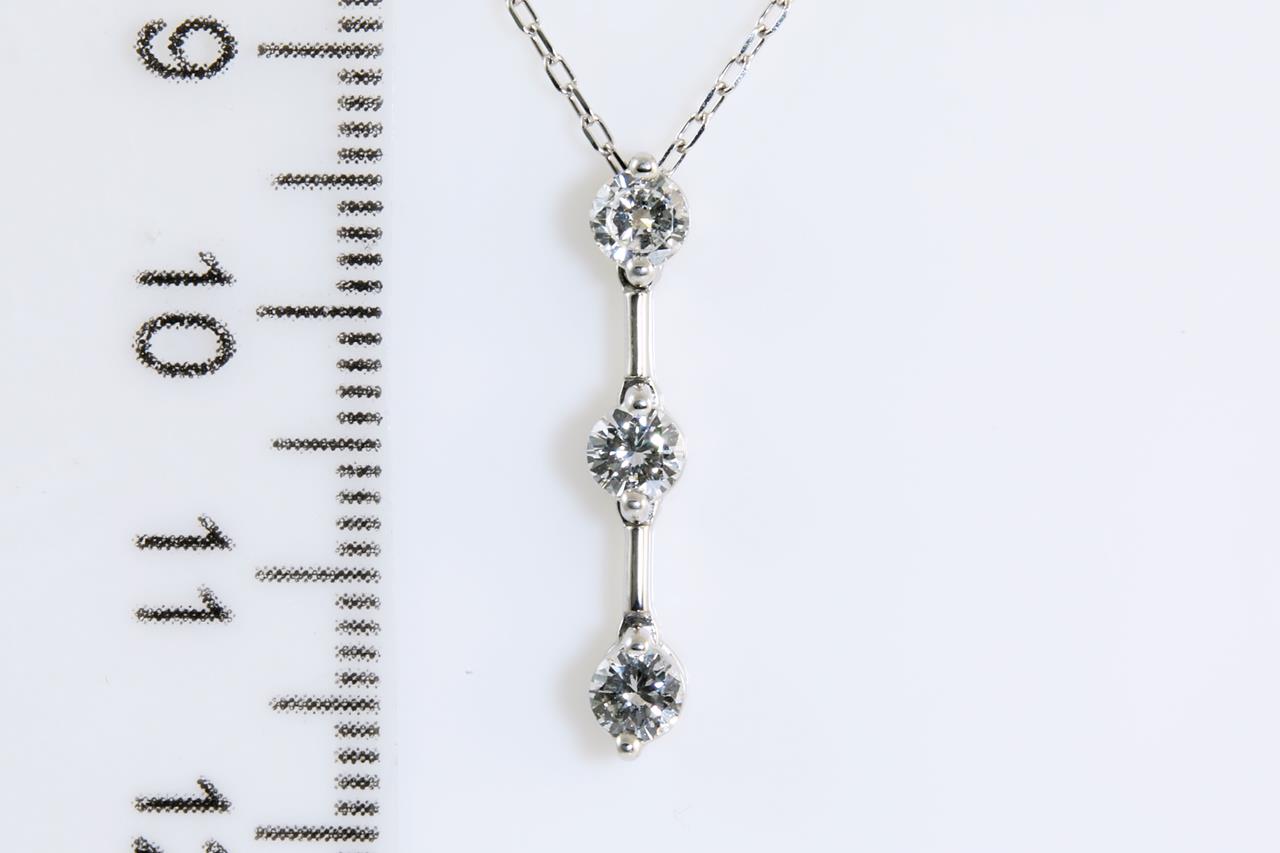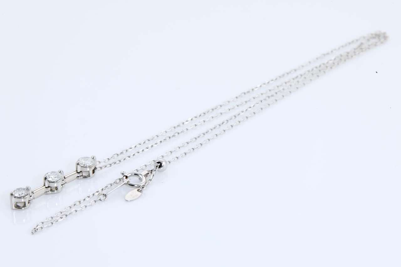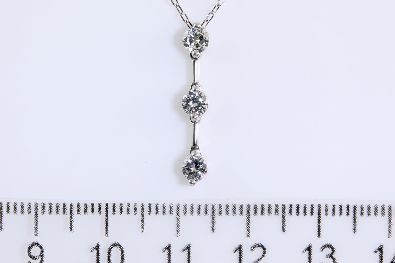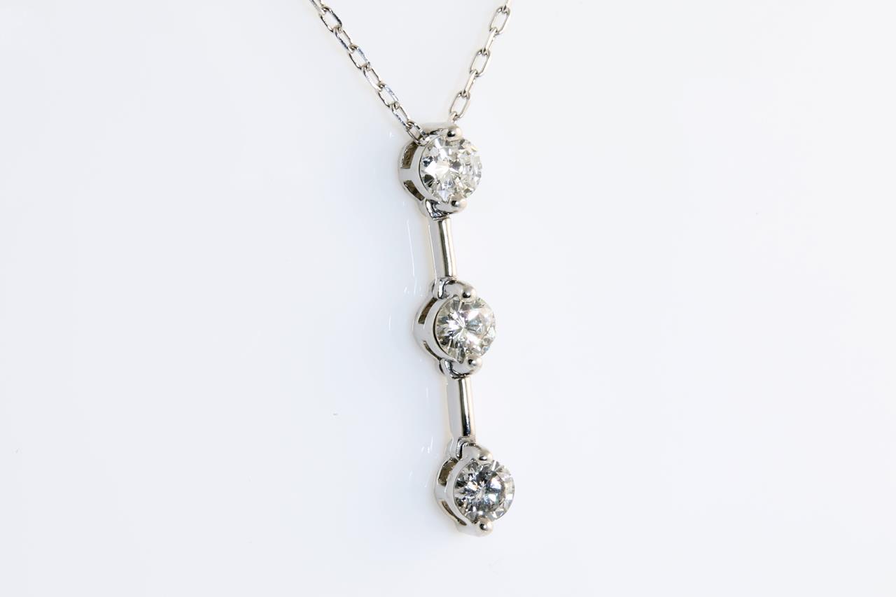 Diamond pendant with 3 round Diamonds totalling 0.50cts (Estimated grading: H-I SI). Platinum with 18ct white gold adjustble 44cm 18ct white gold chain. Weight: 3.1g (Pre-owned)