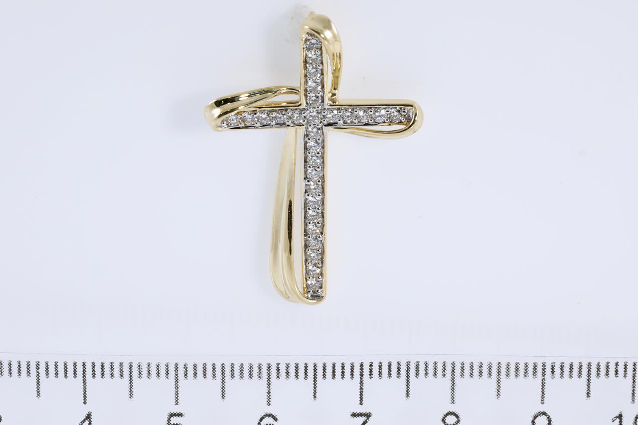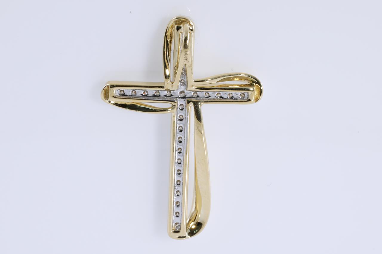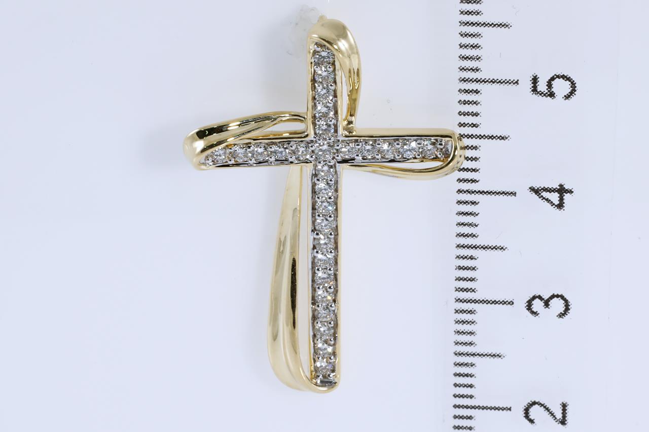 Diamond cross pendant with round Diamonds totalling 0.50cts (Estimated grading: H SI). 14ct yellow gold, no chain provided. Weight: 3.2g (New).