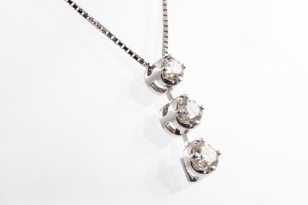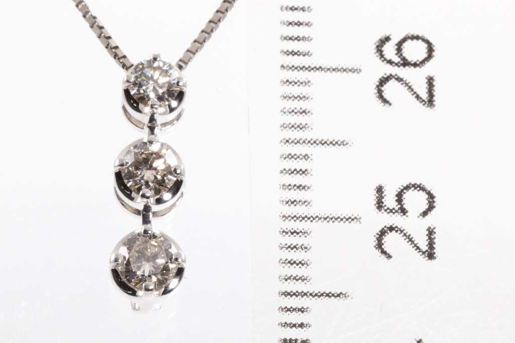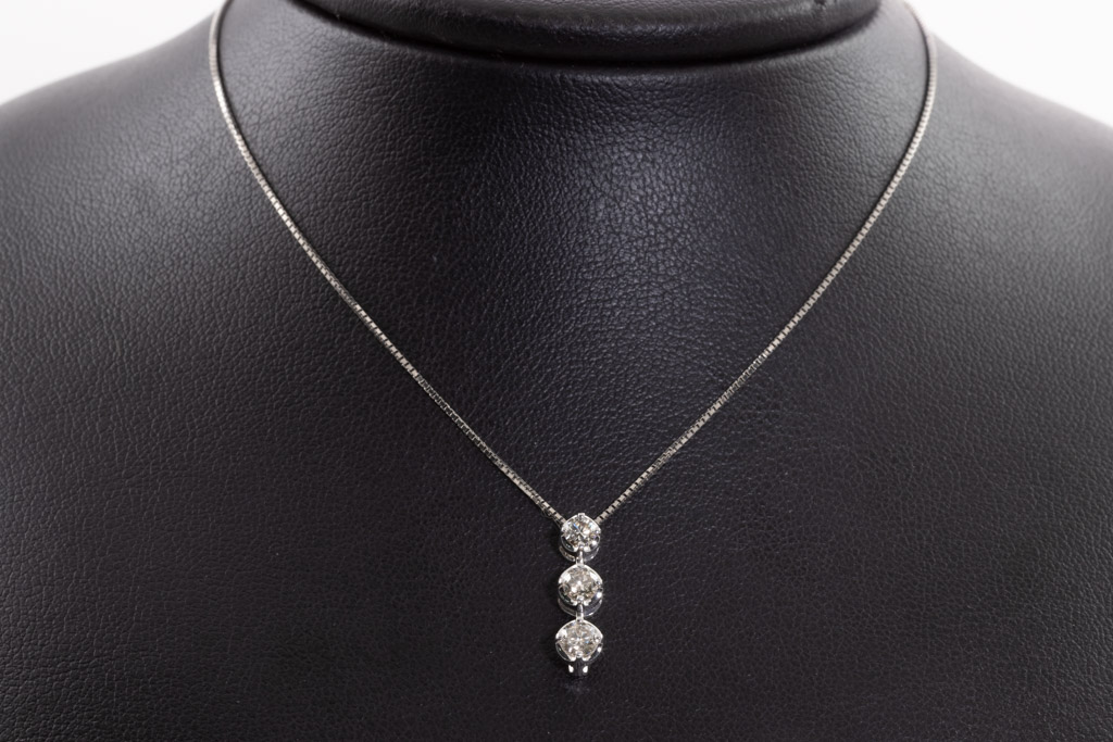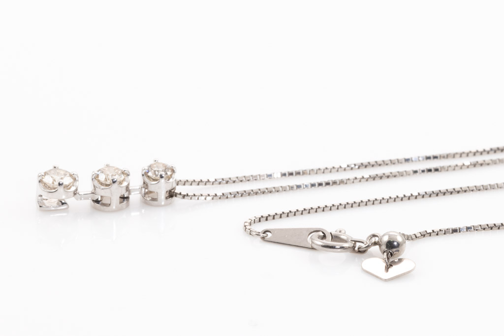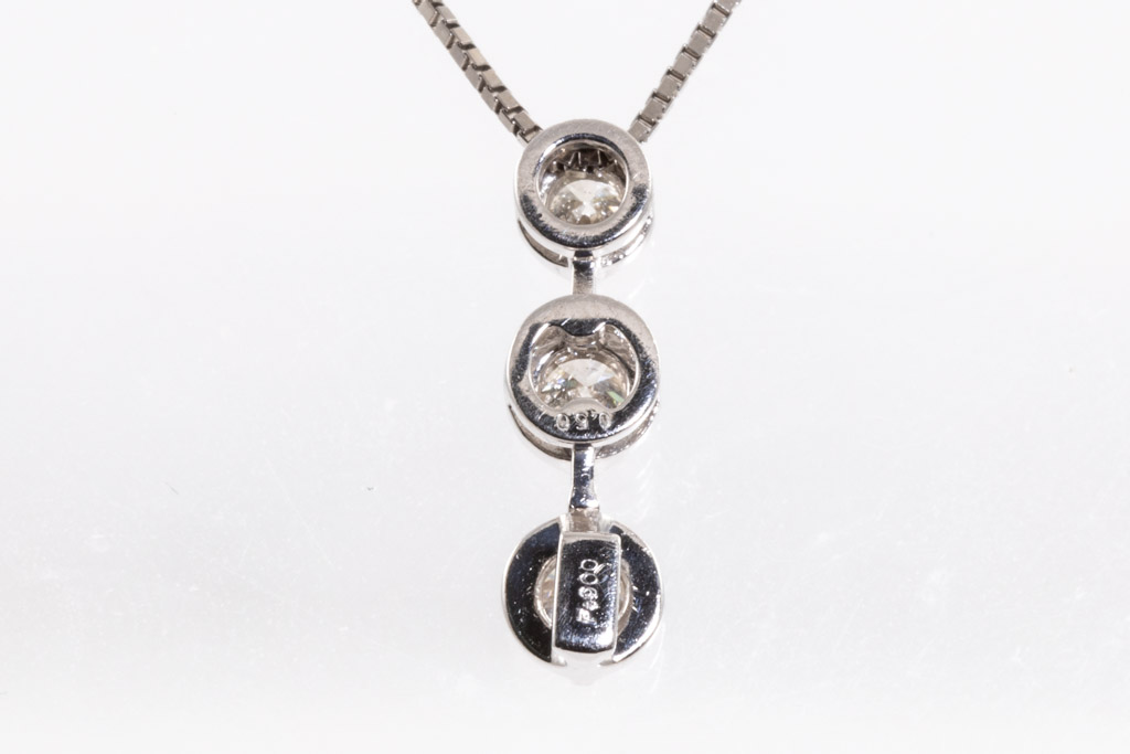 Diamond drop pendant with 3 round Diamonds totalling 0.50cts (Estimated grading: K SI). Platinum with platinum 45cm adjustable chain. Weight: 3.7g. (Pre-owned)