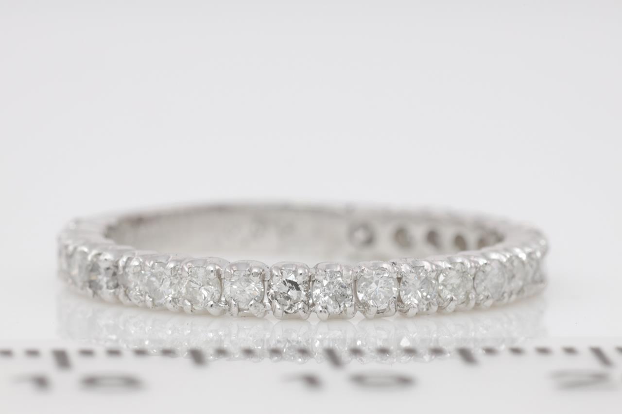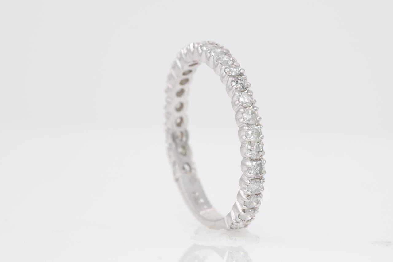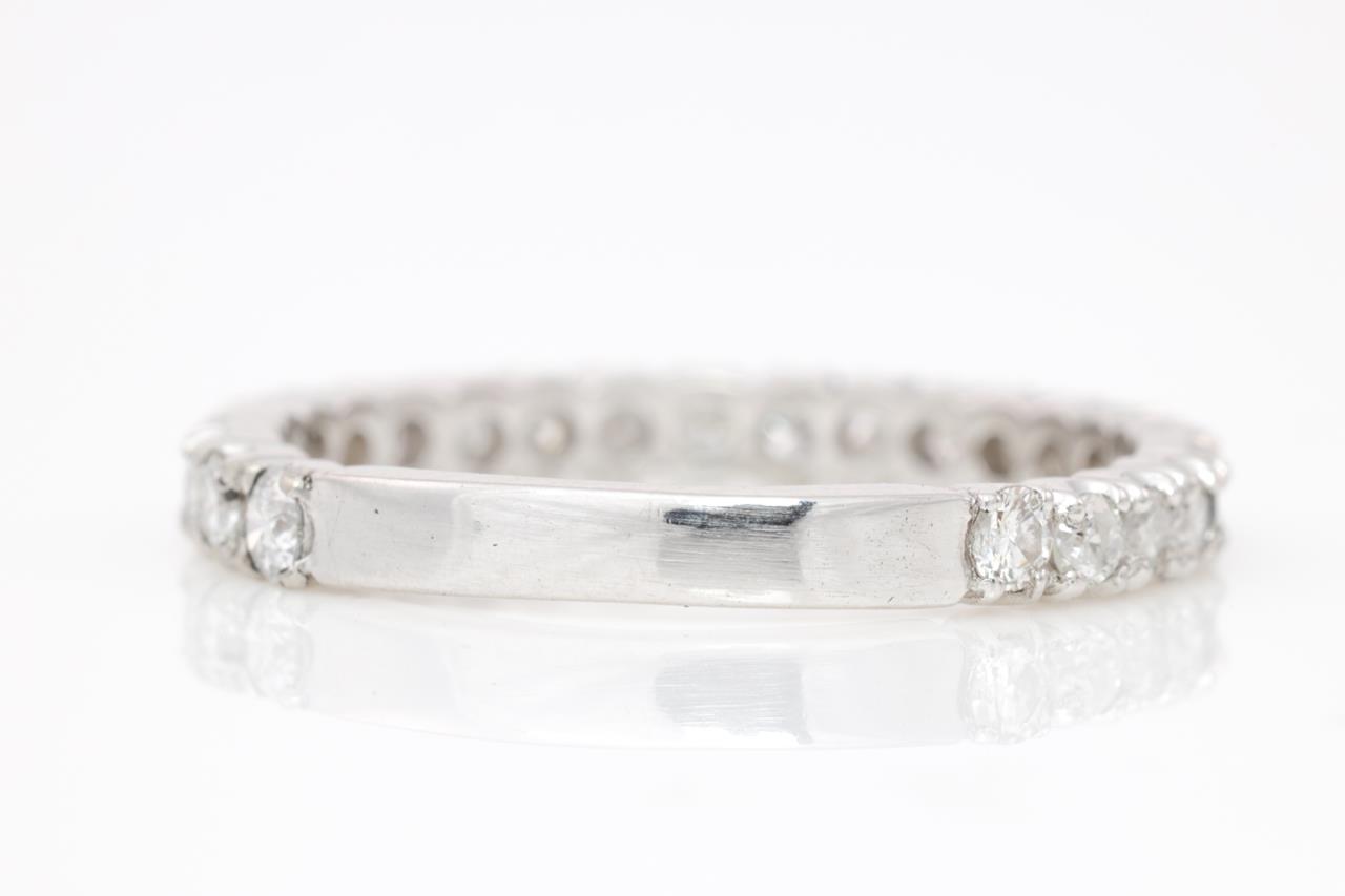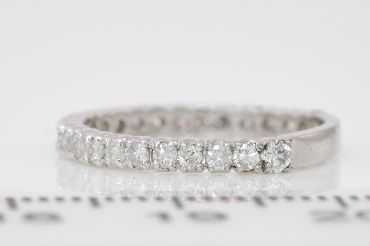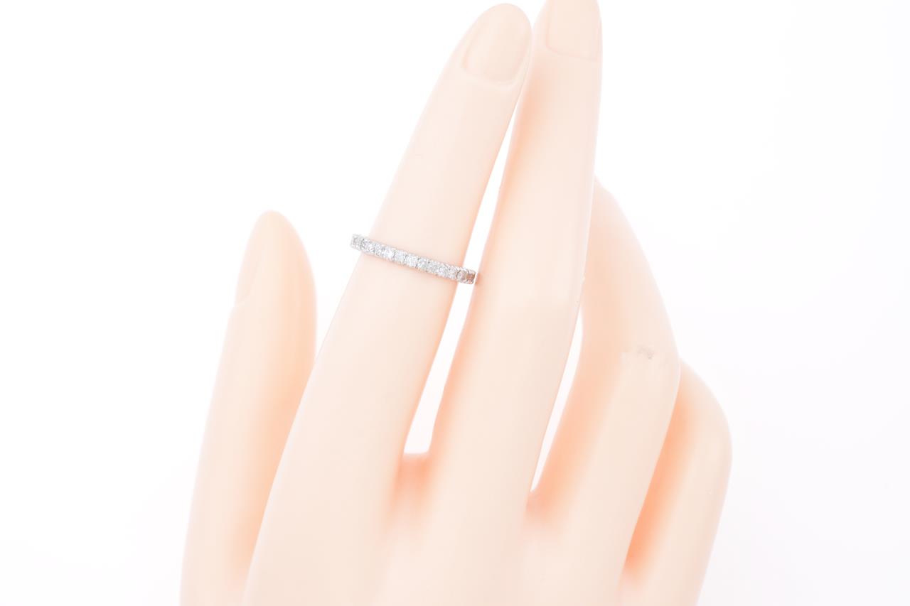 Diamond Eternity Ring with round Diamonds totalling 0.50cts (Estimated grading: G-H P1-2). Platinum. Ring size J. Weight: 2.1g (Pre-owned)