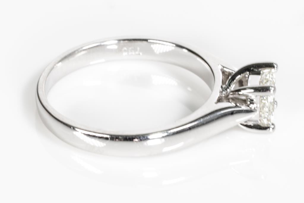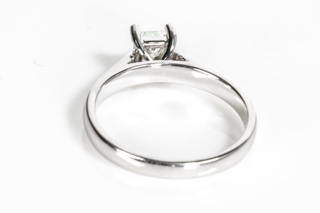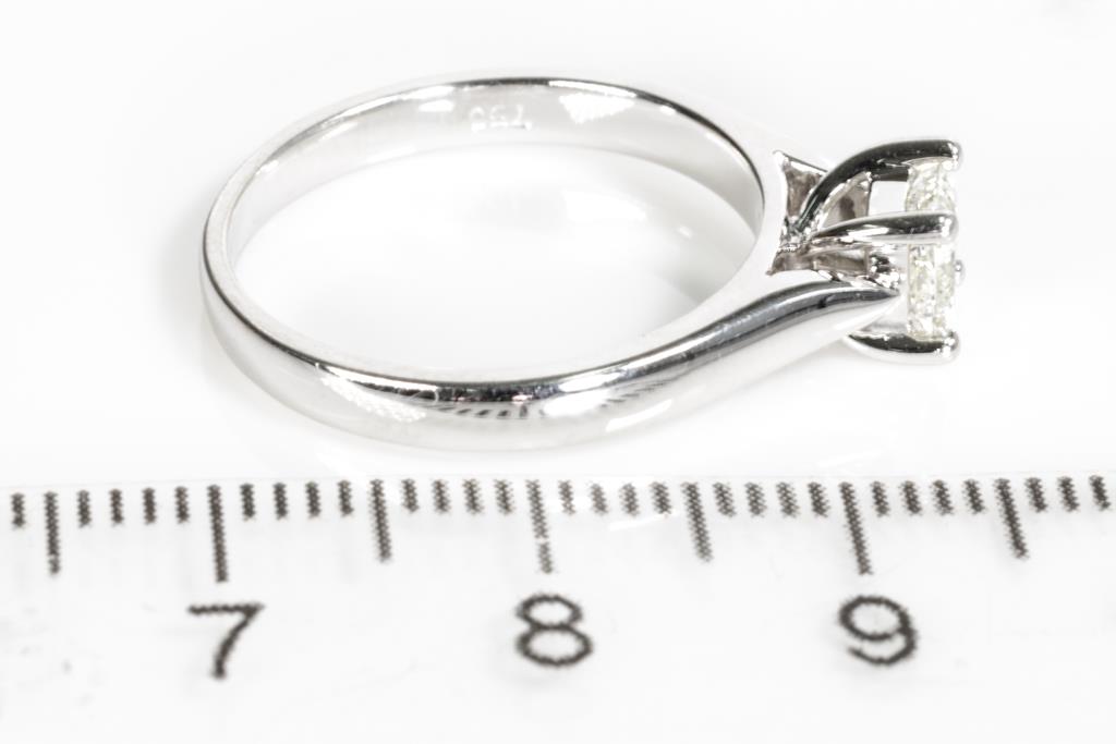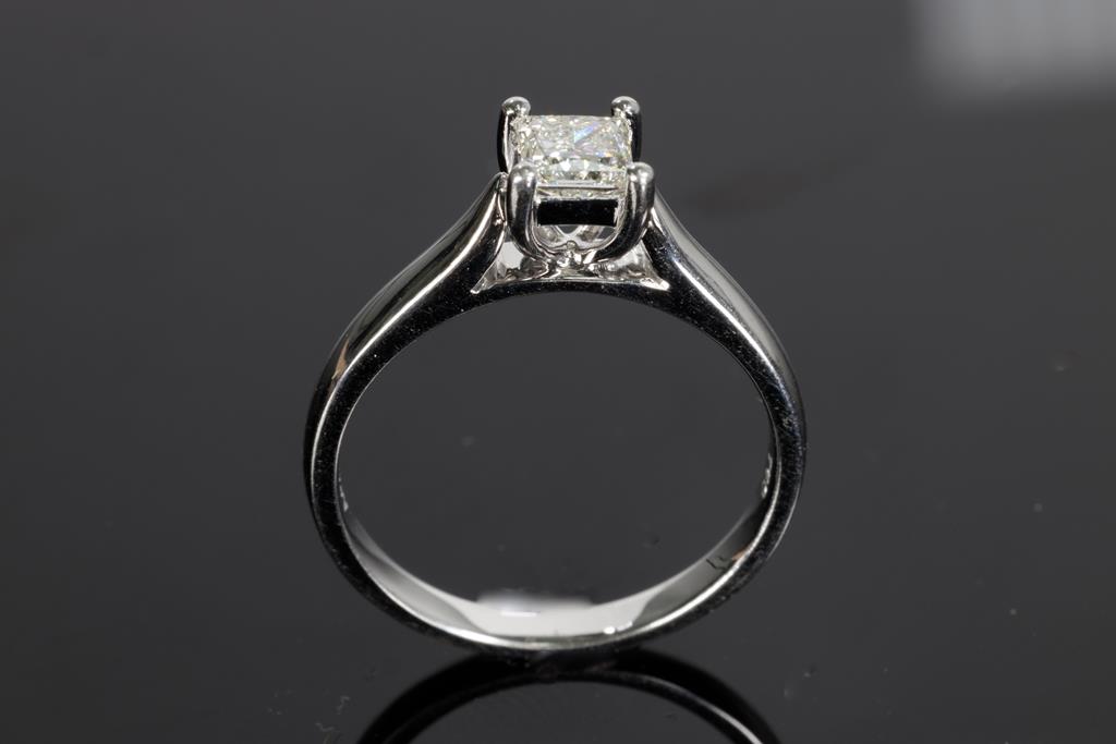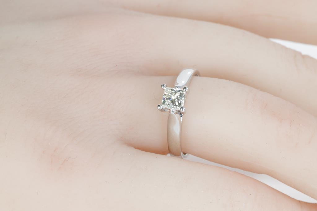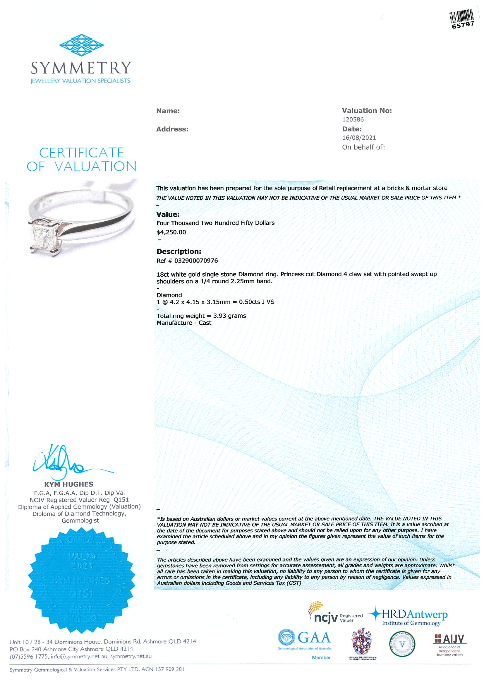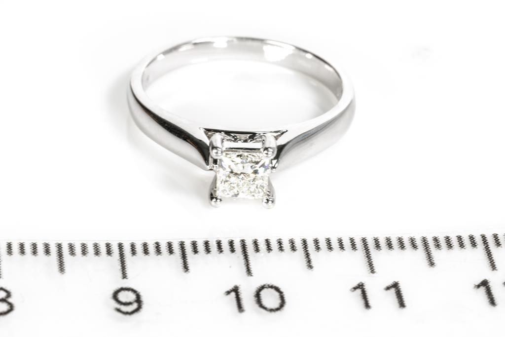 Diamond Solitaire Ring with princess cut Diamond of 0.50ct (Estimated grading J VS). 18ct white gold. Ring size N. Weight 3.9g. With Valuation. (Pre-owned)
