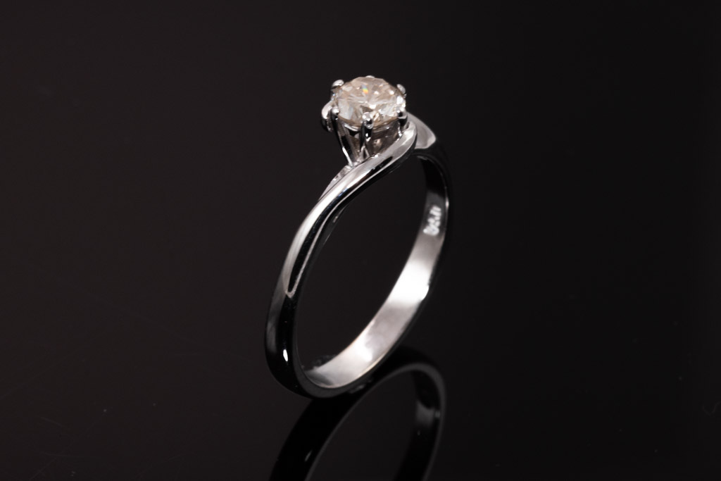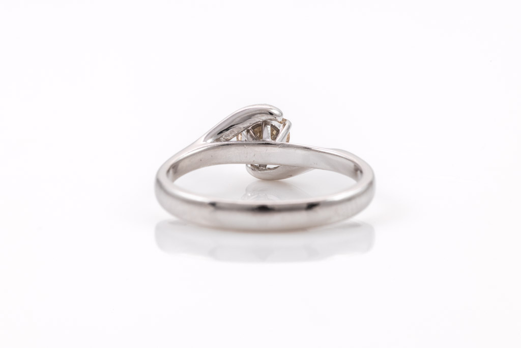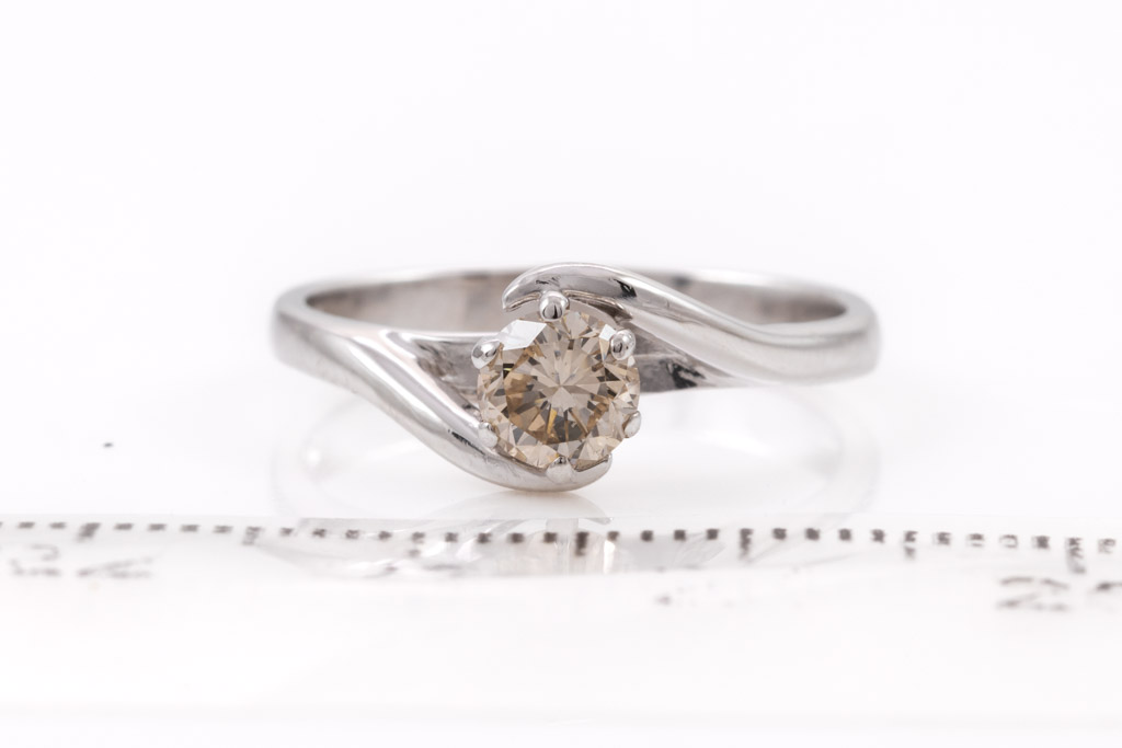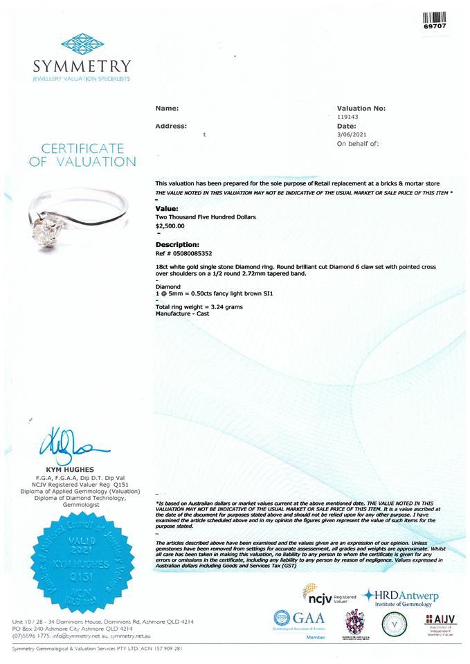 Diamond Ring with round Diamond of approximately 0.50ct (Estimated grading: light brown SI1). 18ct white gold. Ring size L 1/2. Weight 3.2g. With Valuation. (Pre-owned)