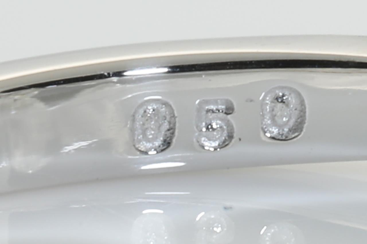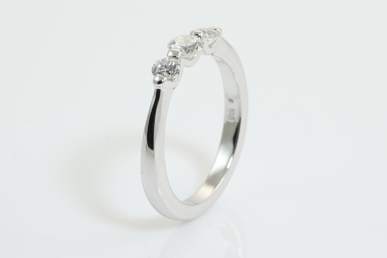 Diamond ring with 3 round Diamonds totalling 0.50cts (Estimated grading: H-I SI). 18ct white gold. Ring size L 1/2 - cannot be resized up, down with ring clip. Weight: 3.8g (Pre-owned)
