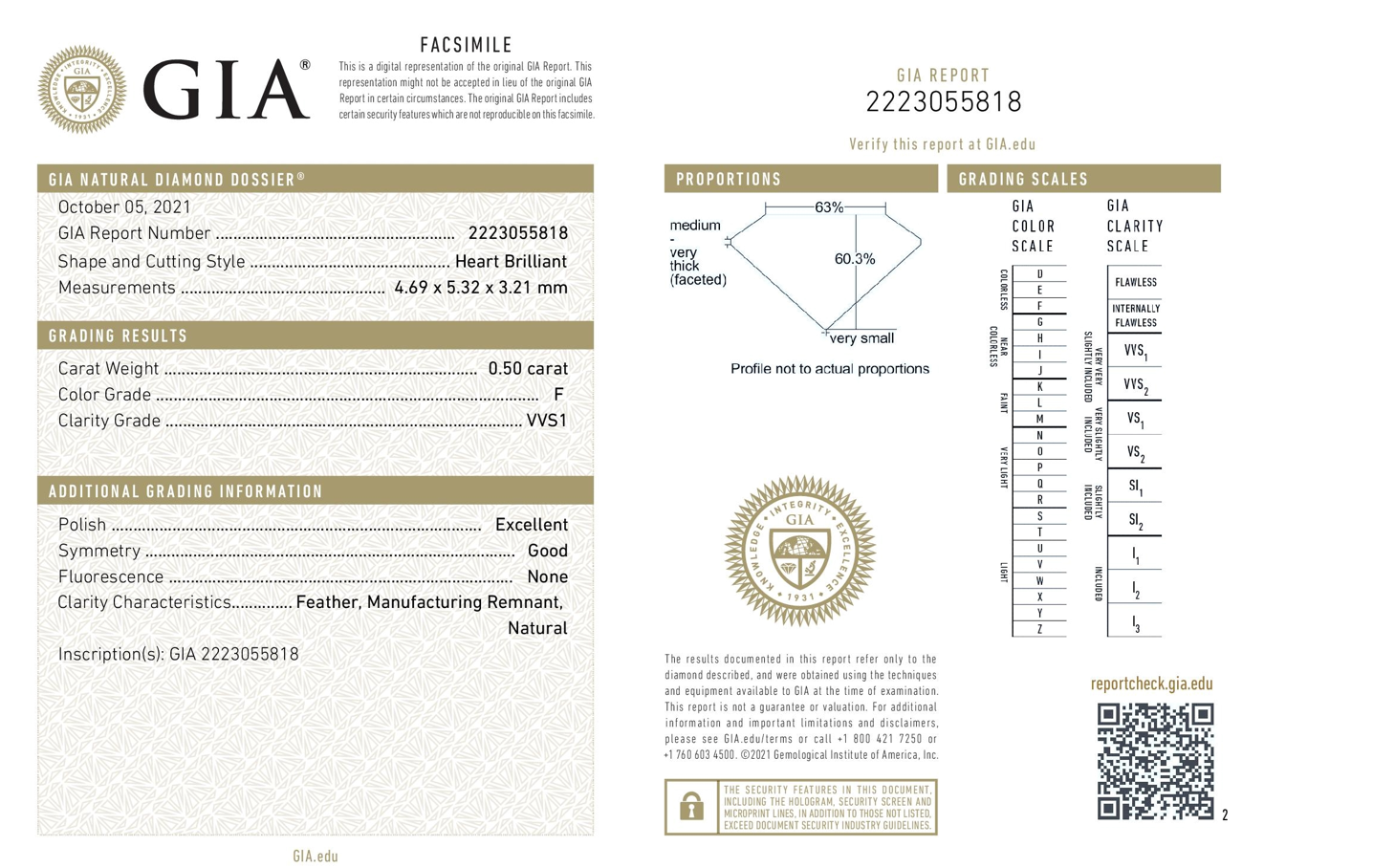 A loose heart shaped Diamond of 0.50ct (With GIA summary report graded as F VVS1#2223055818