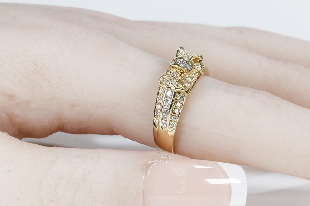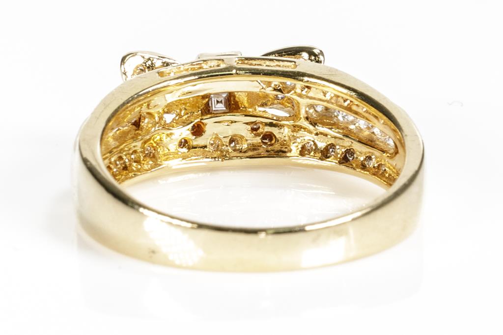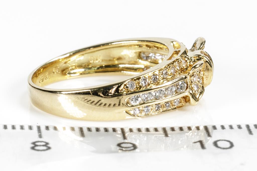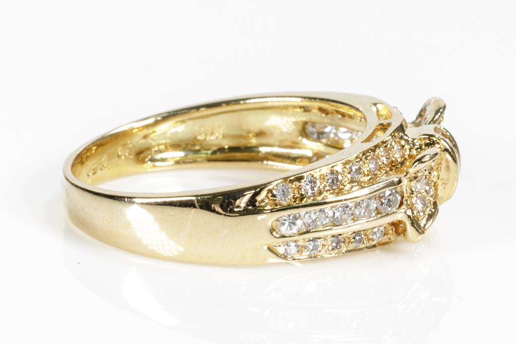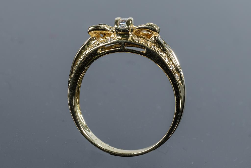 Ponte Vecchio bow design Diamond ring with round & carre cut Diamonds totalling 0.50cts (Estimated grading: F-G VS-SI). 18ct yellow gold. Ring size L1/2. Weight: 4g. (Pre-owned)