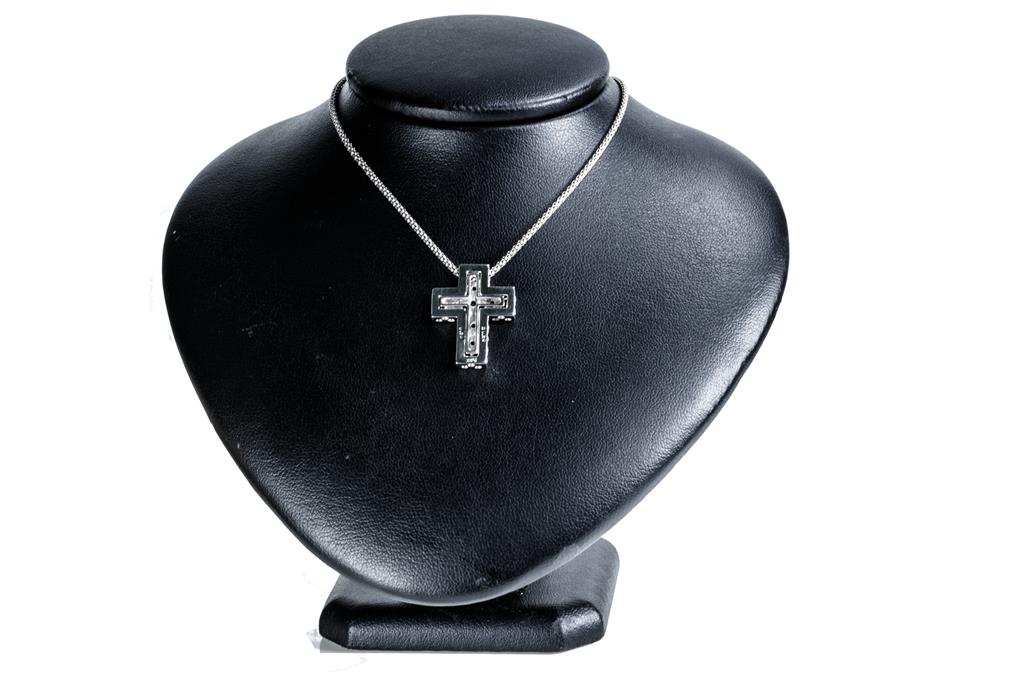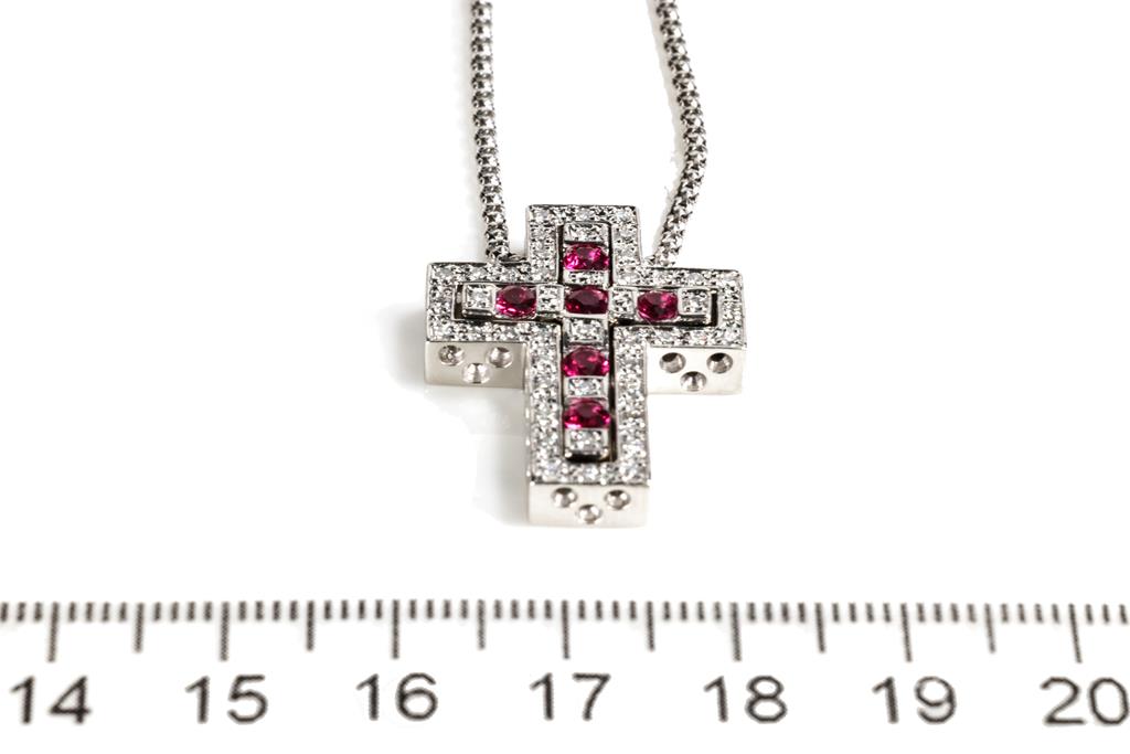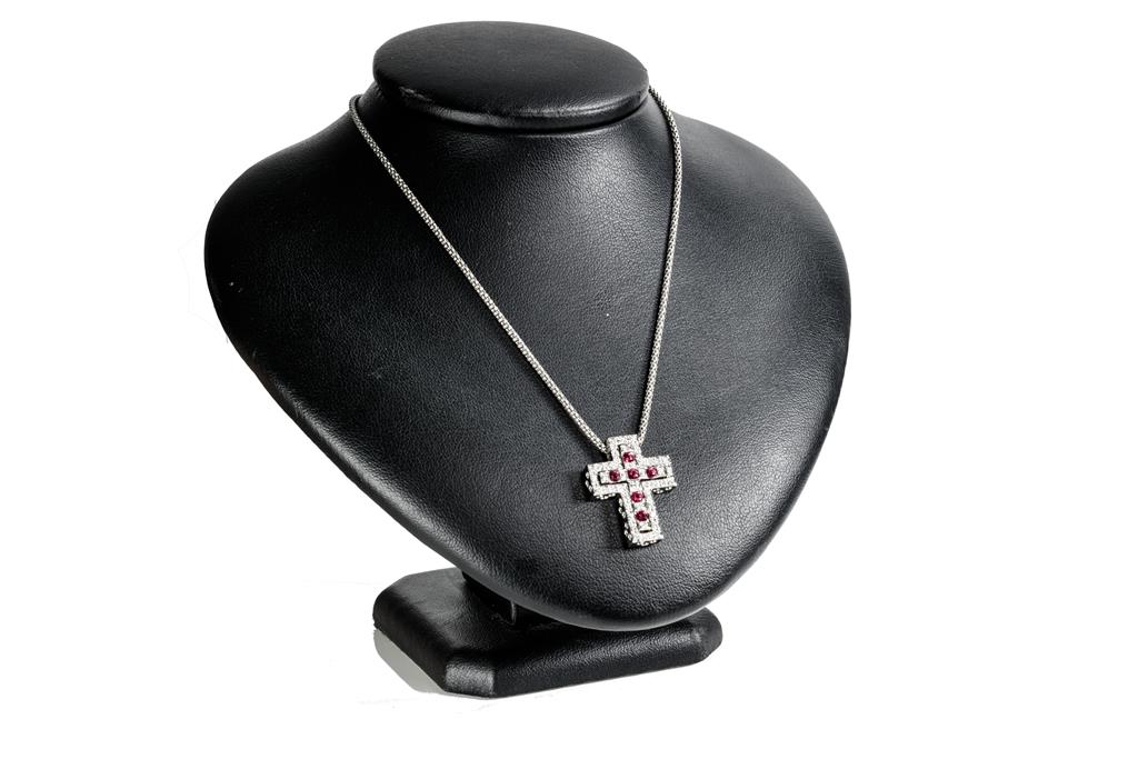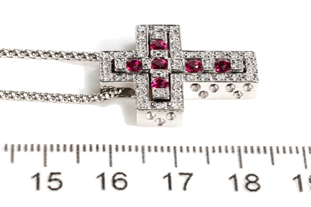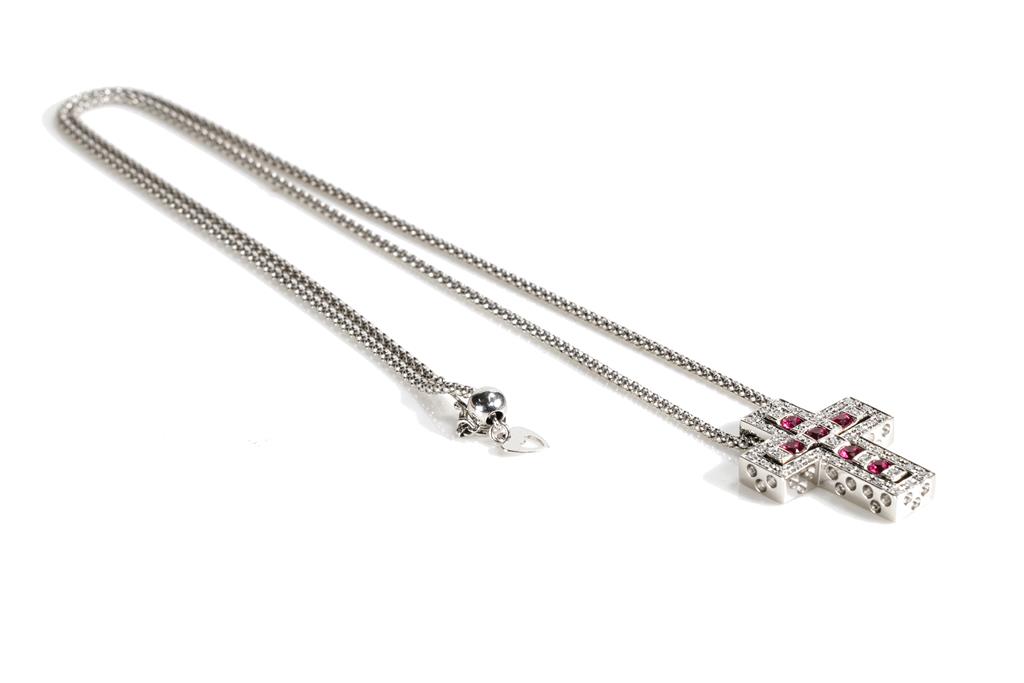 Ruby and Diamond pendant with 6 round Rubies totalling 0.60cts and Diamonds totalling 0.28cts. Platinum with platinum adjustable chain. Length: 50cm. Weight: 20.2g. (Pre-owned)