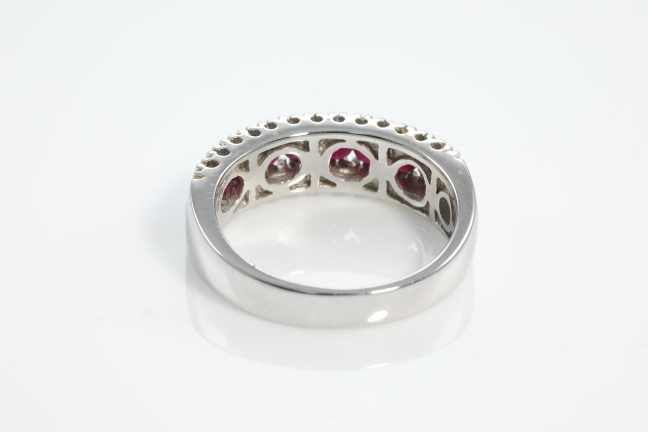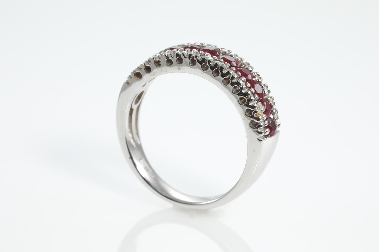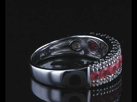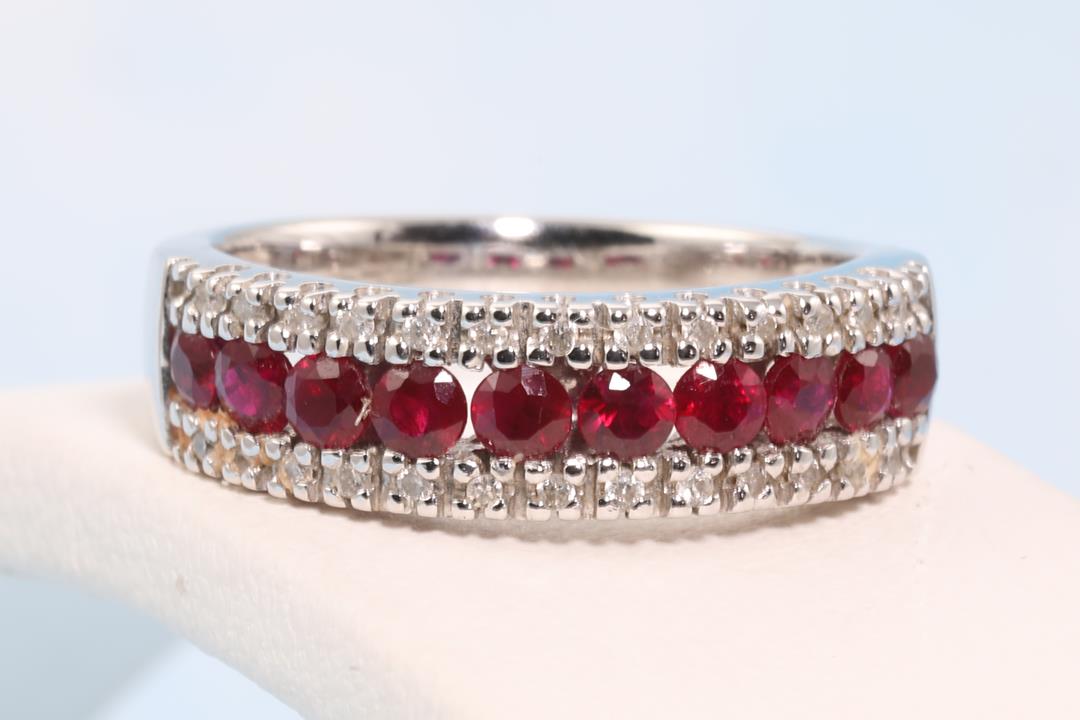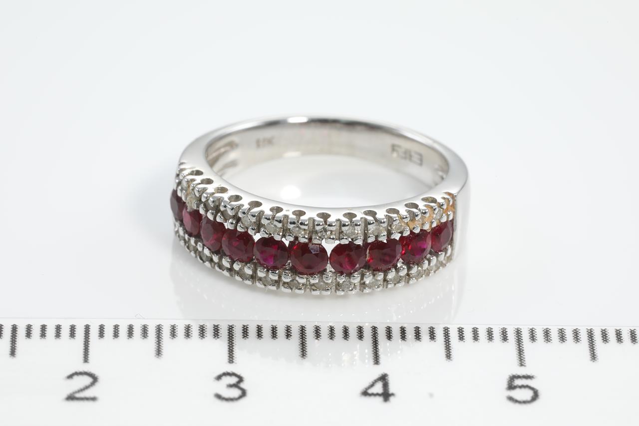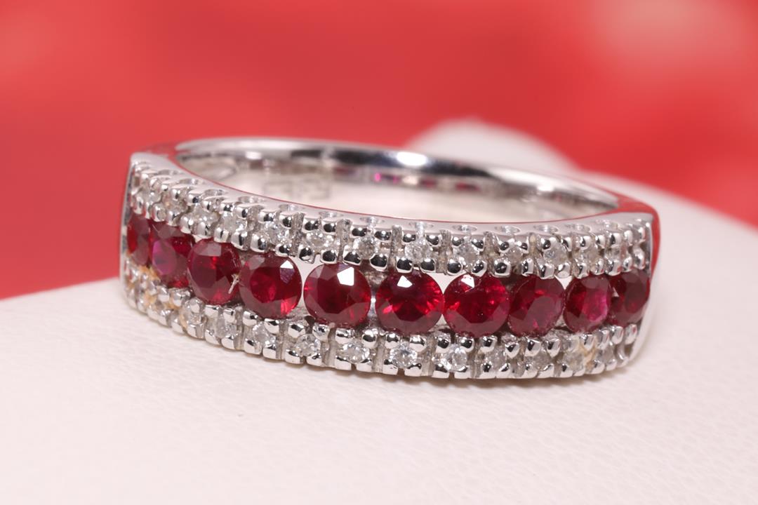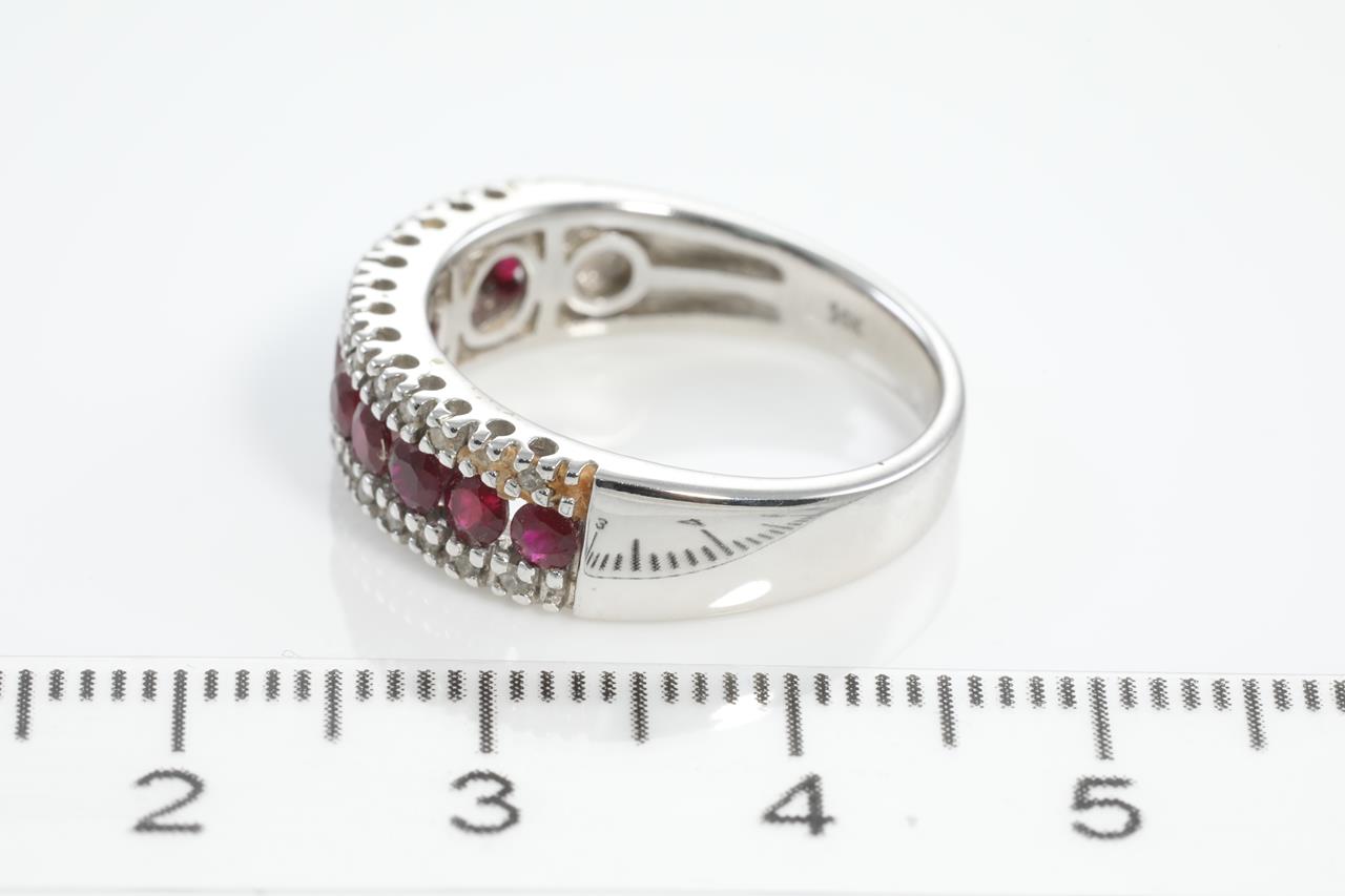 Ruby and Diamond ring with round Rubies totalling 0.50cts and Diamonds totalling 0.15cts. 14ct white gold. Ring size N. Weight: 5.2g (As New)