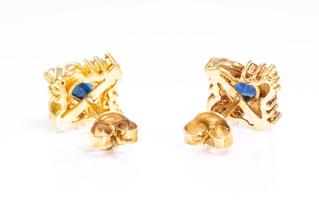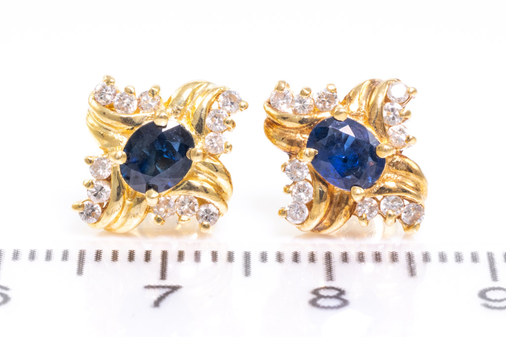 Sapphire and Diamond earrings with 2 oval blue Sapphires totalling 0.50cts and round Diamonds totalling 0.12cts. 18ct yellow gold. Weight: 3.6g. (Pre-owned)