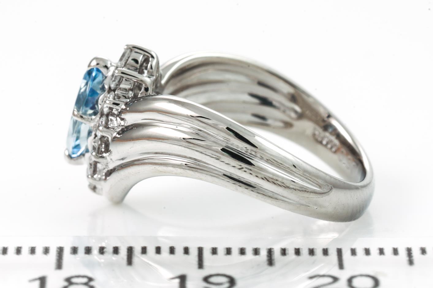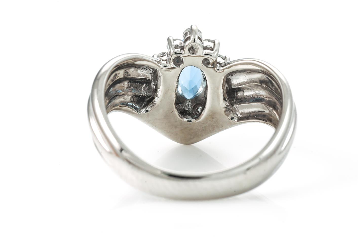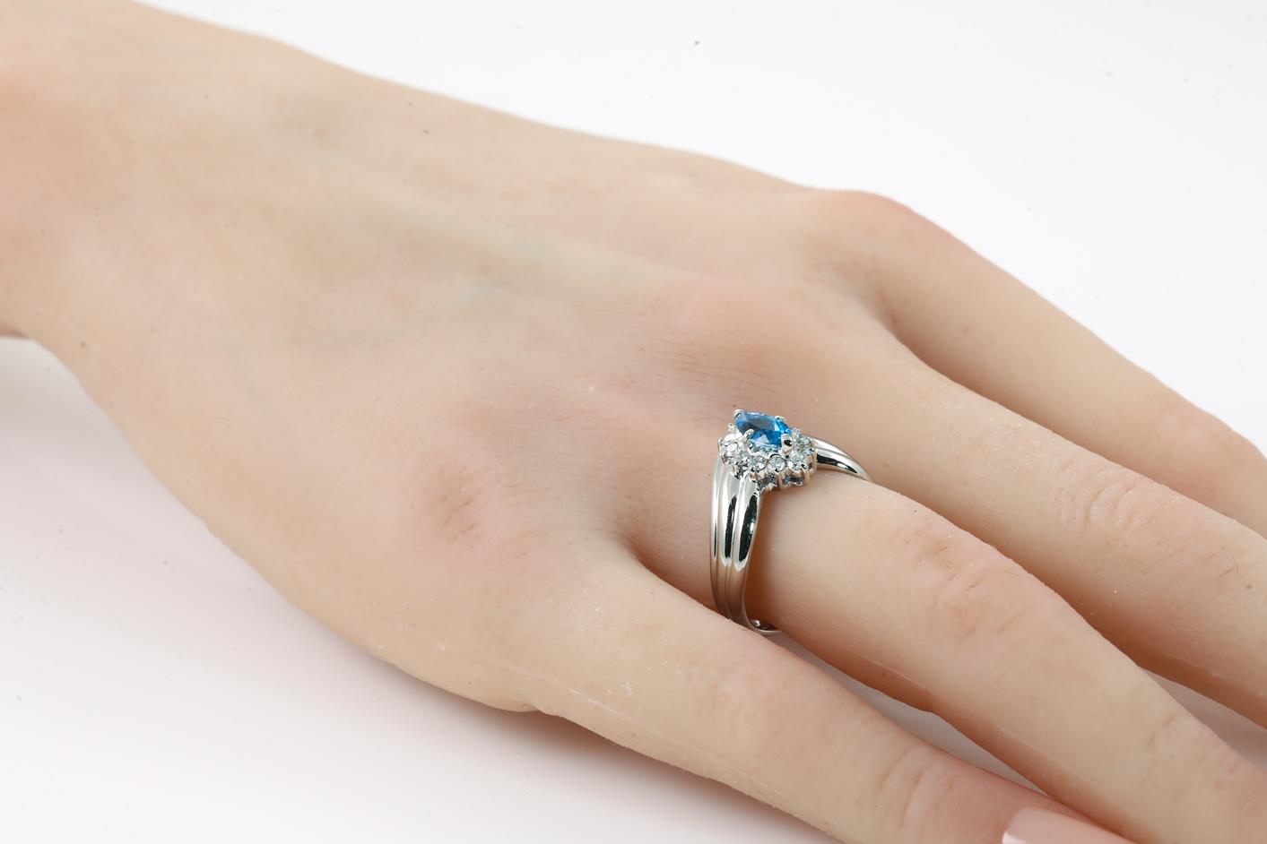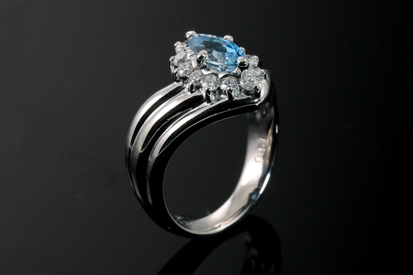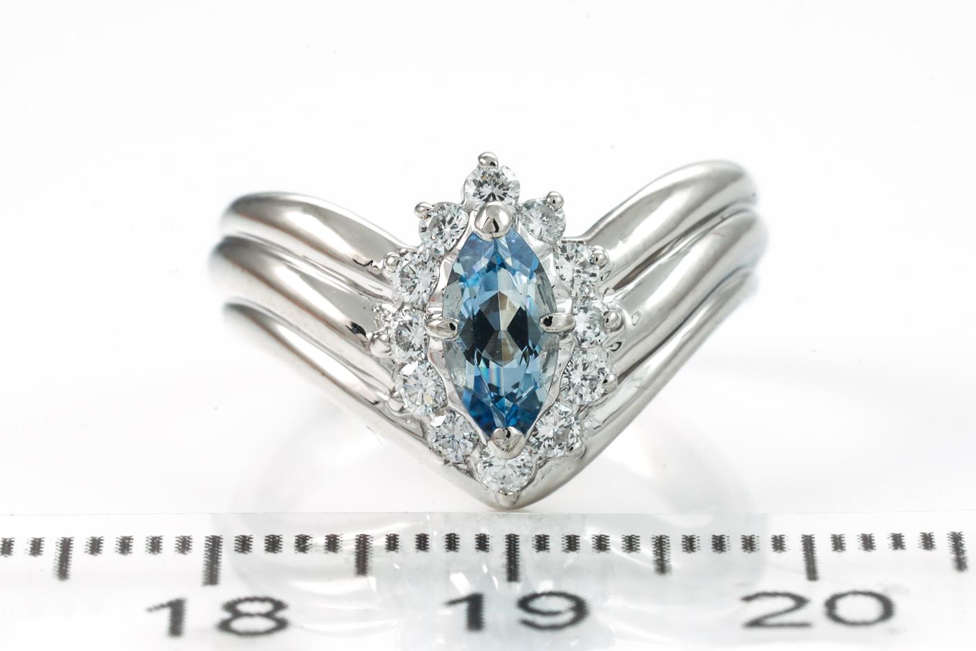 Aquamarine and Diamond ring with a marquise cut Aquamarine of 0.51ct and round Diamonds totalling 0.30cts (Estimated grading: G-H SI-P1). Platinum. Ring size L. Weight: 7.5g. (Pre-owned)