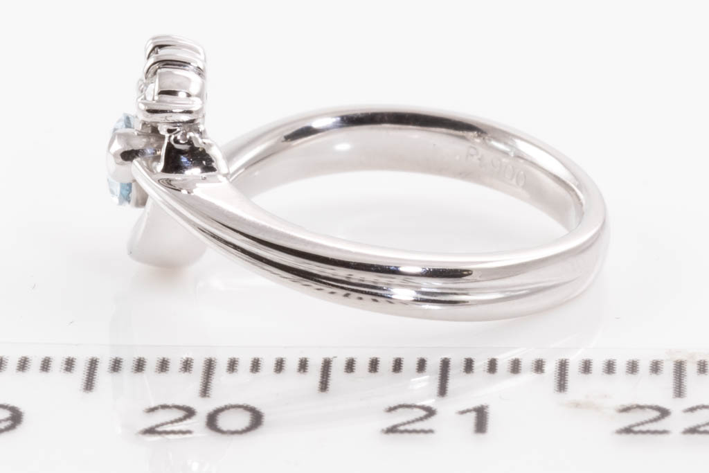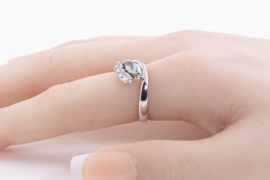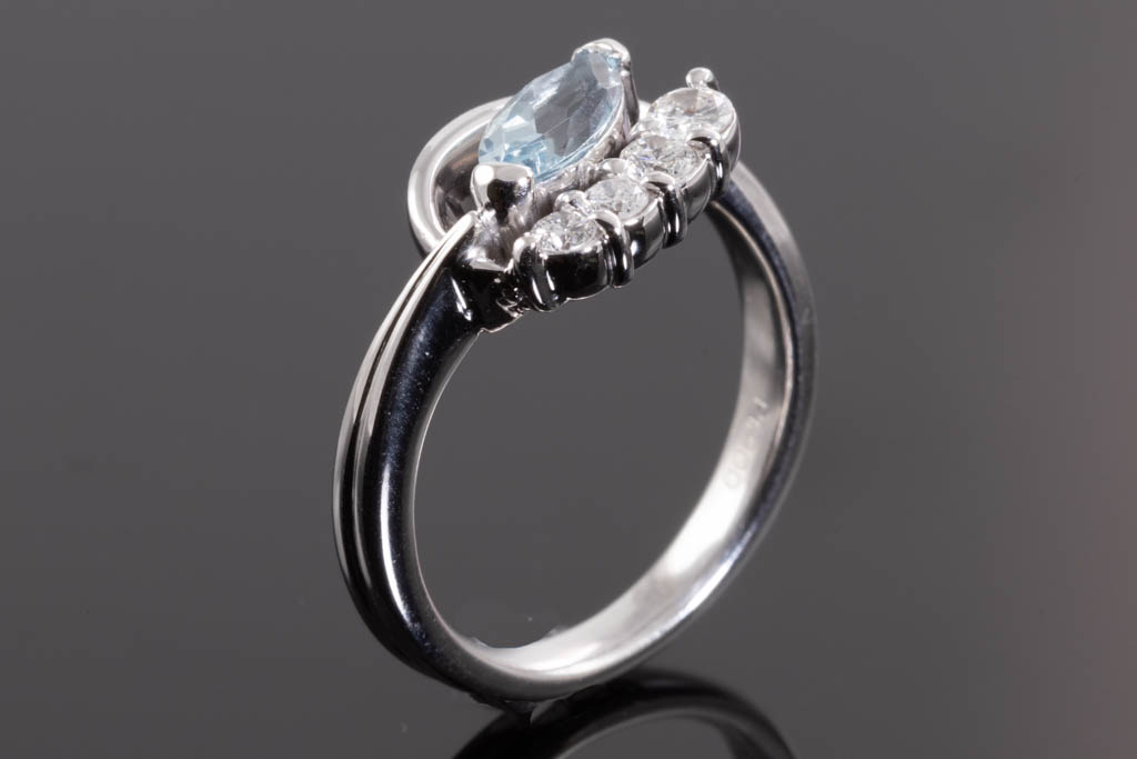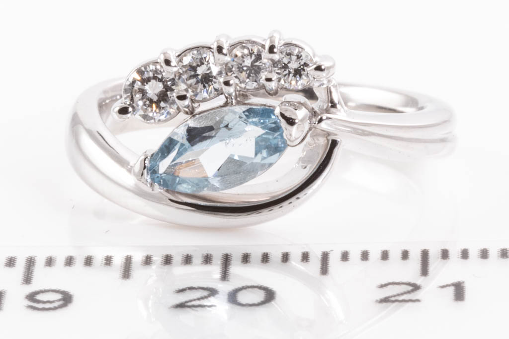 Aquamarine and Diamond ring with marquise cut Aquamarine of 0.52ct and 4 round Diamonds totalling 0.24cts. Platinum. Ring size: L. Weight: 7.9g (Pre-owned)