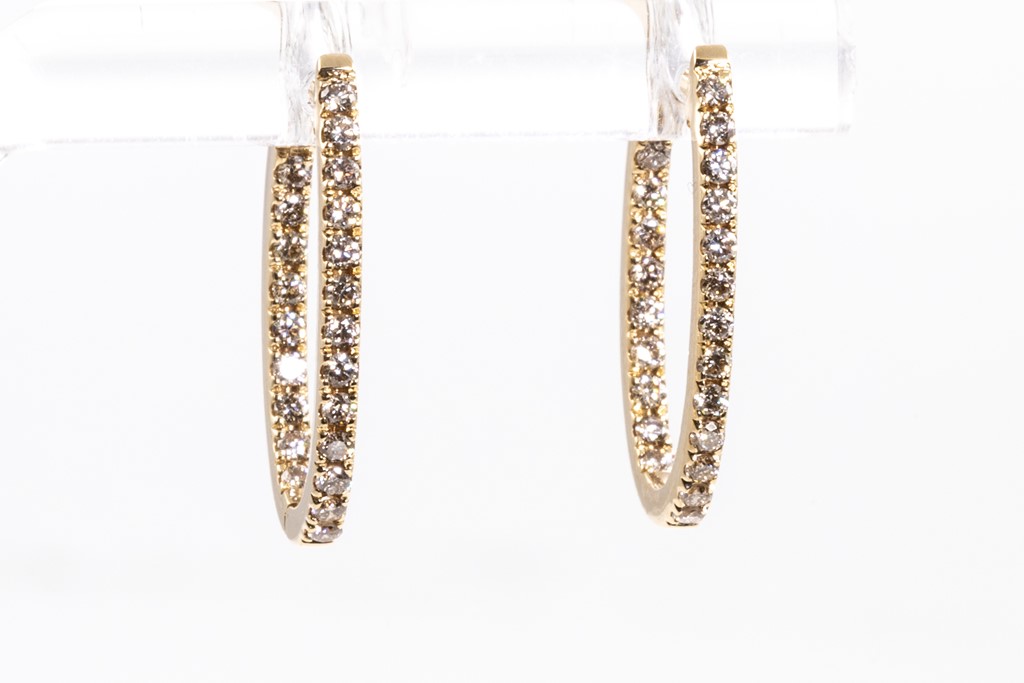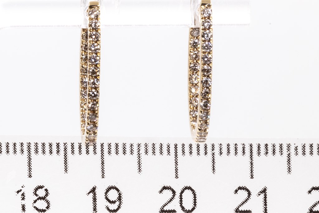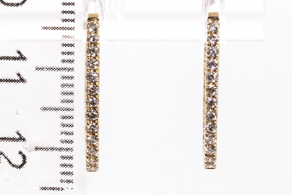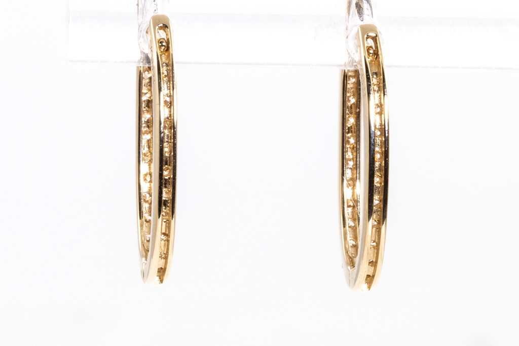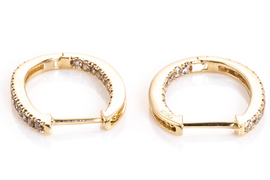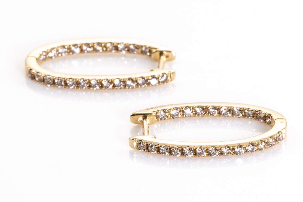 Diamond hoop earrings with round Diamonds totalling 0.52cts (Estimated grading: M-N SI). 18ct yellow gold. Weight: 2.5g. (Pre-owned)
