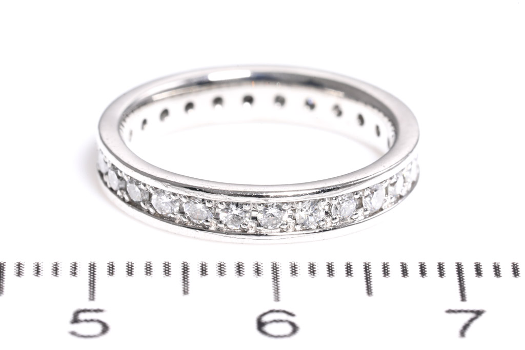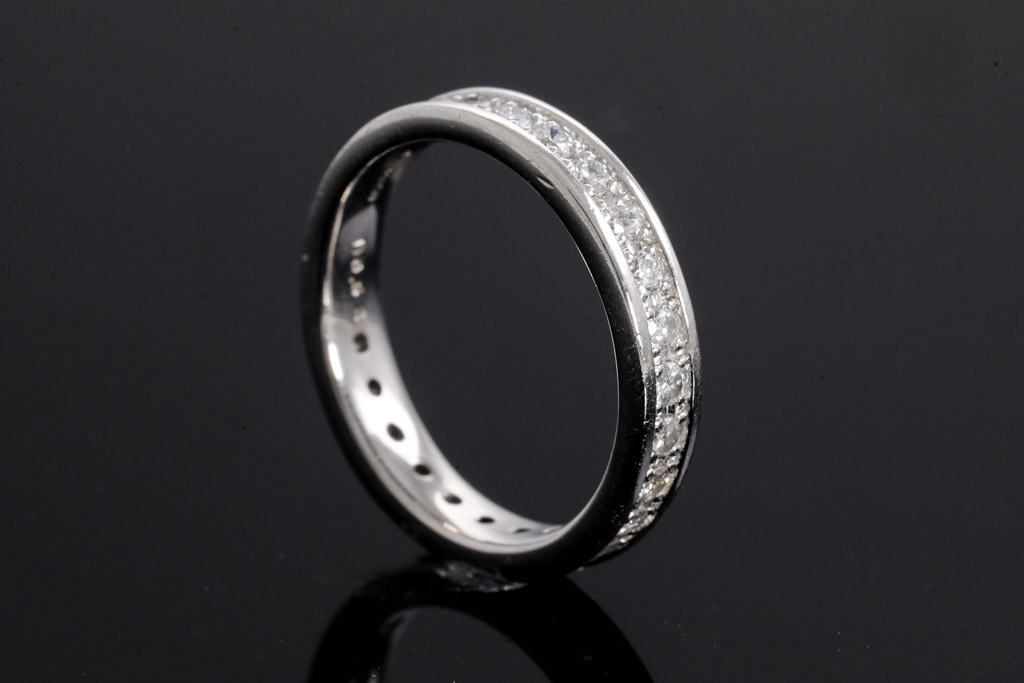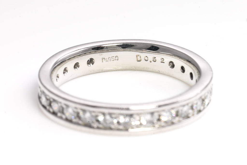 Diamond full eternity ring with round Diamonds totalling 0.52cts (Estimated grading: H P1). Platinum. Ring size I - ring resizing is not recommended. Weight: 4.2g. (Pre-owned)