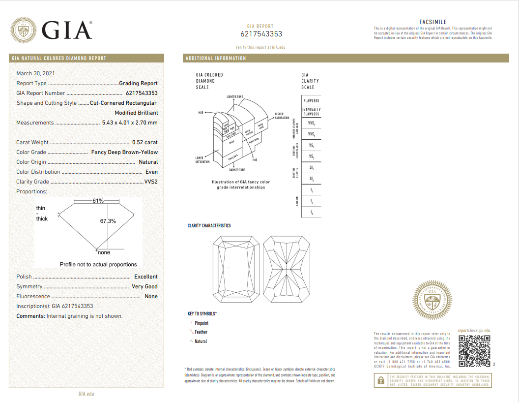 A loose Radiant cut Diamond of 0.52ct (with GIA report graded as Natural Fancy Deep Brown Yellow Even VVS2 #6217543353). (New)