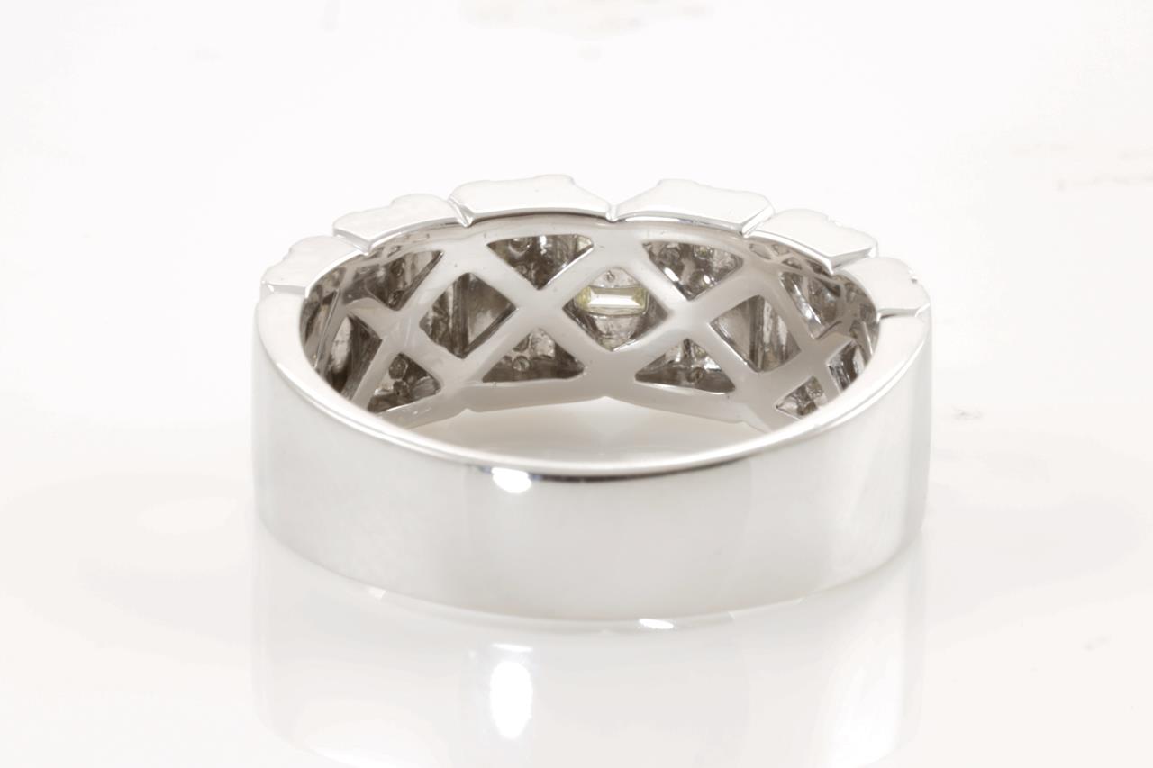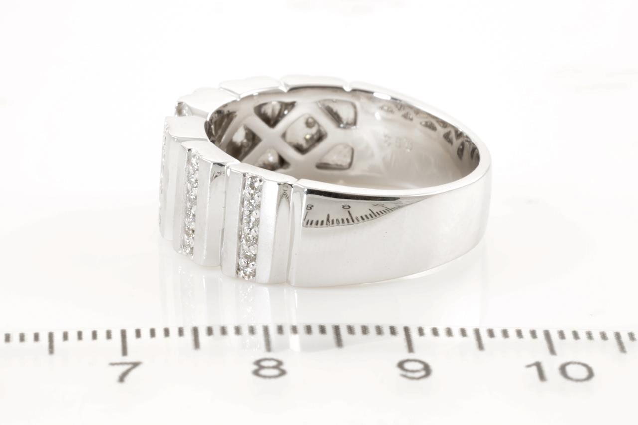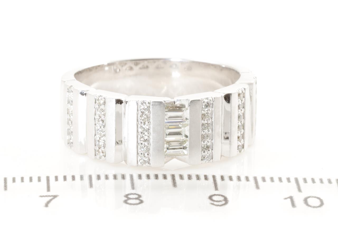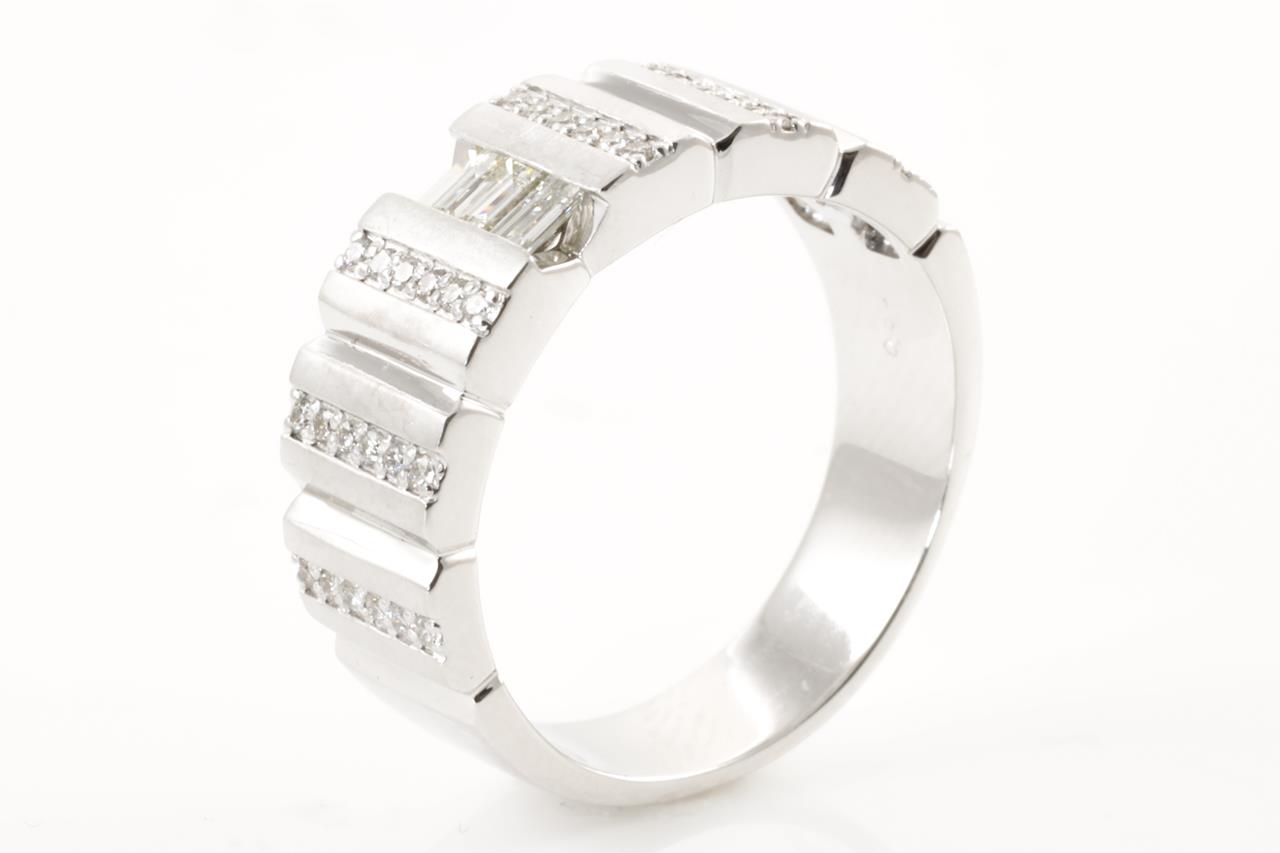 Mens ring with round (Estimated grading: H SI-P1) & 3 baguette cut (Estimated grading: J VS) Diamonds totalling 0.52cts). Platinum. Ring size V - ring resizing is not recommended. Weight: 16.3g. (Pre-owned)