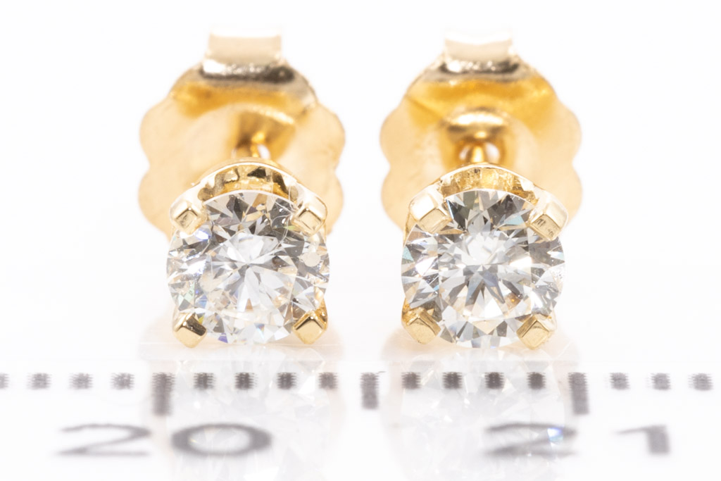 Diamond stud earrings with 2 round Diamonds totalling 0.52cts (Estimated grading: J P1). 18ct yellow gold. Weight: 1.0g. (New)