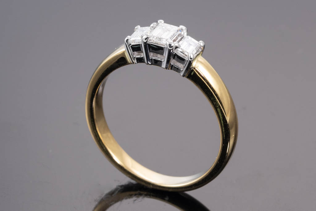Diamond trilogy ring with 3 emerald cut Diamonds totalling 0.52cts (Estimated grading: F-G VS1). 18ct yellow and white gold. Ring size K. Weight: 3.8g. With Certificate of Sale. (Pre-owned)