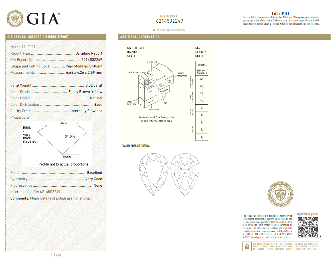 A loose Pear Shape Diamond of 0.52ct (with GIA report graded as Natural Fancy Brown-Yellow Even Internally Flawless #6214502249). (New)