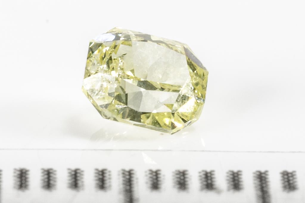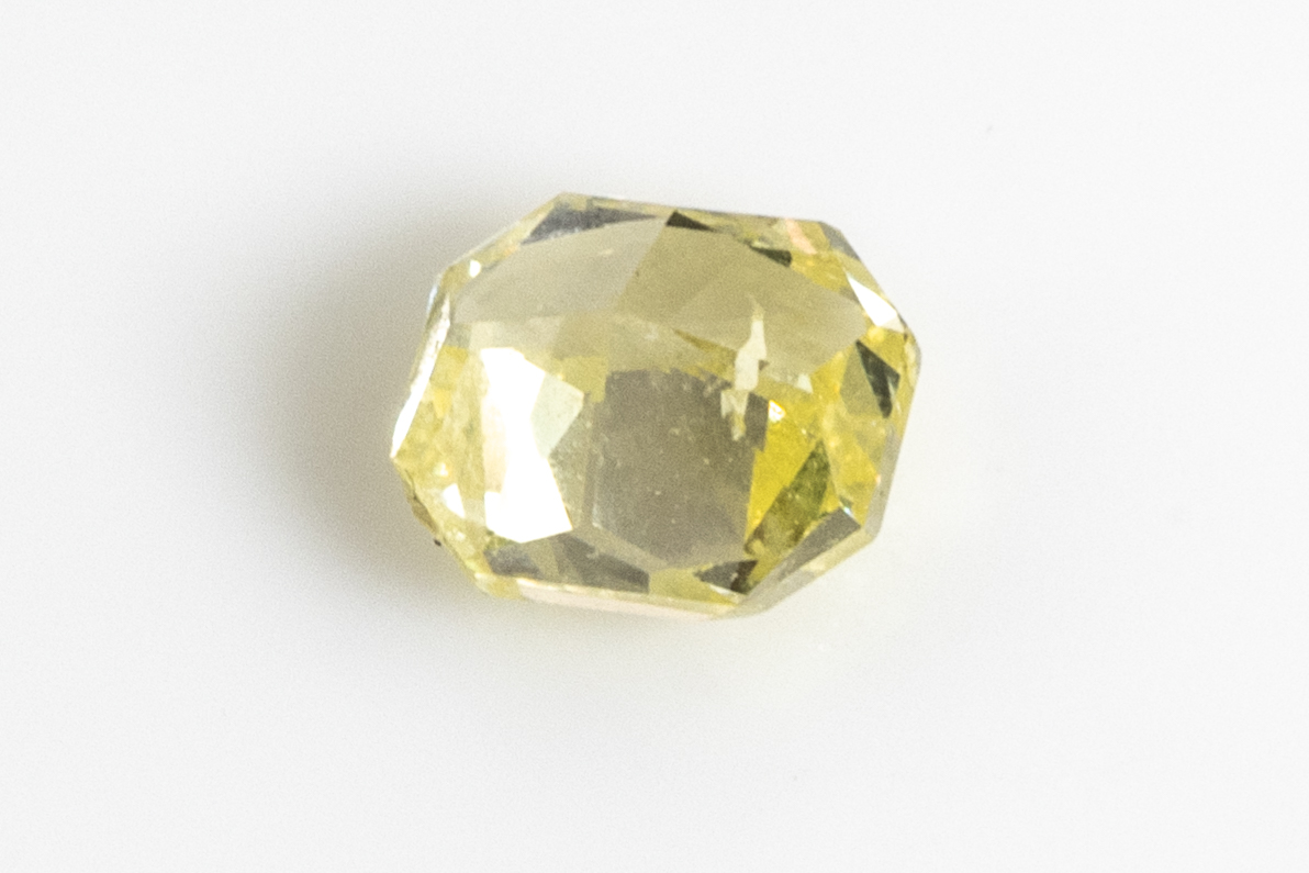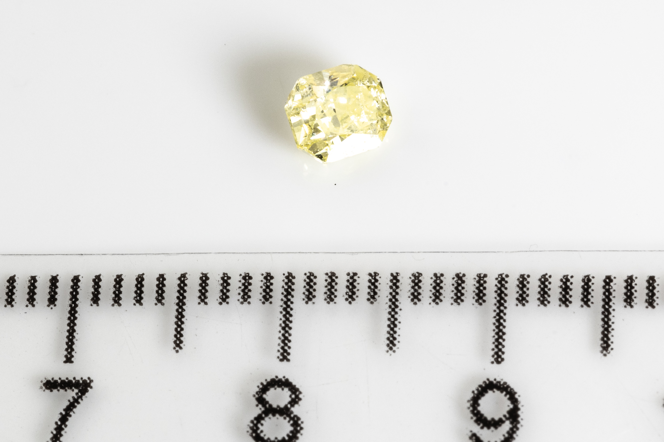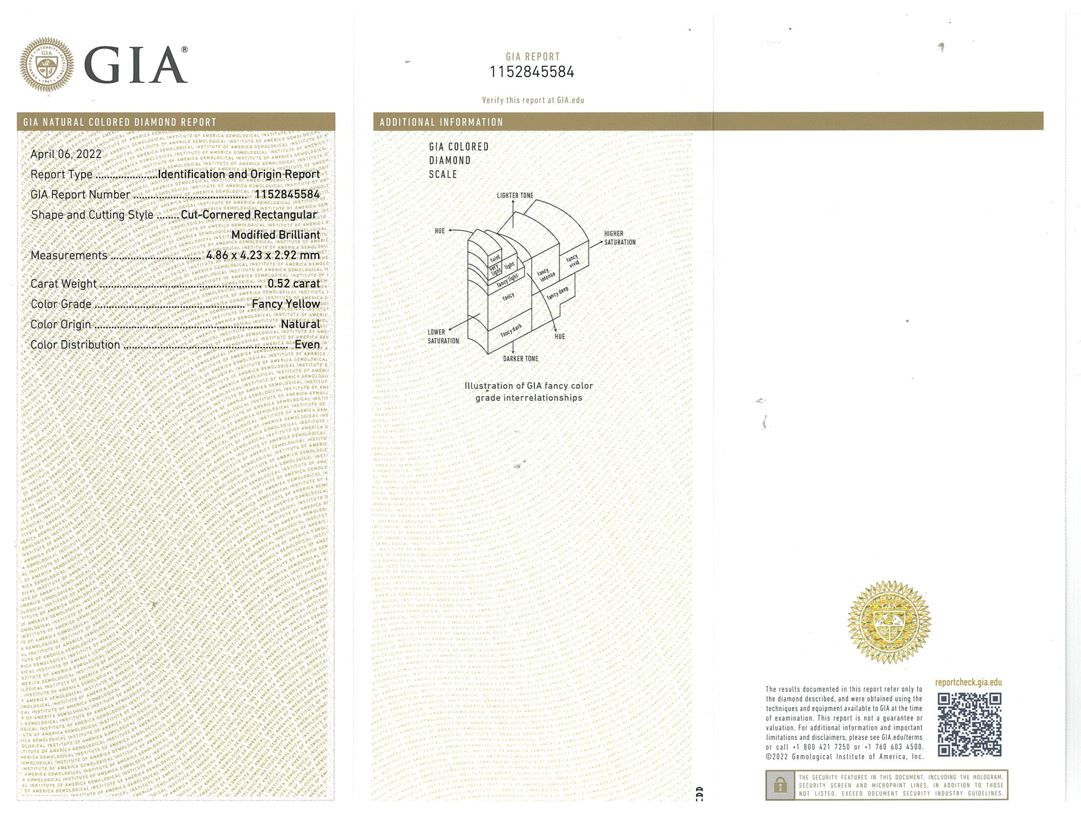 A loose radiant cut Diamond of 0.52ct (with GIA report graded as Natural Fancy Yellow Even #1152845584). FSA estimated clarity grade: P1-P2 (New)