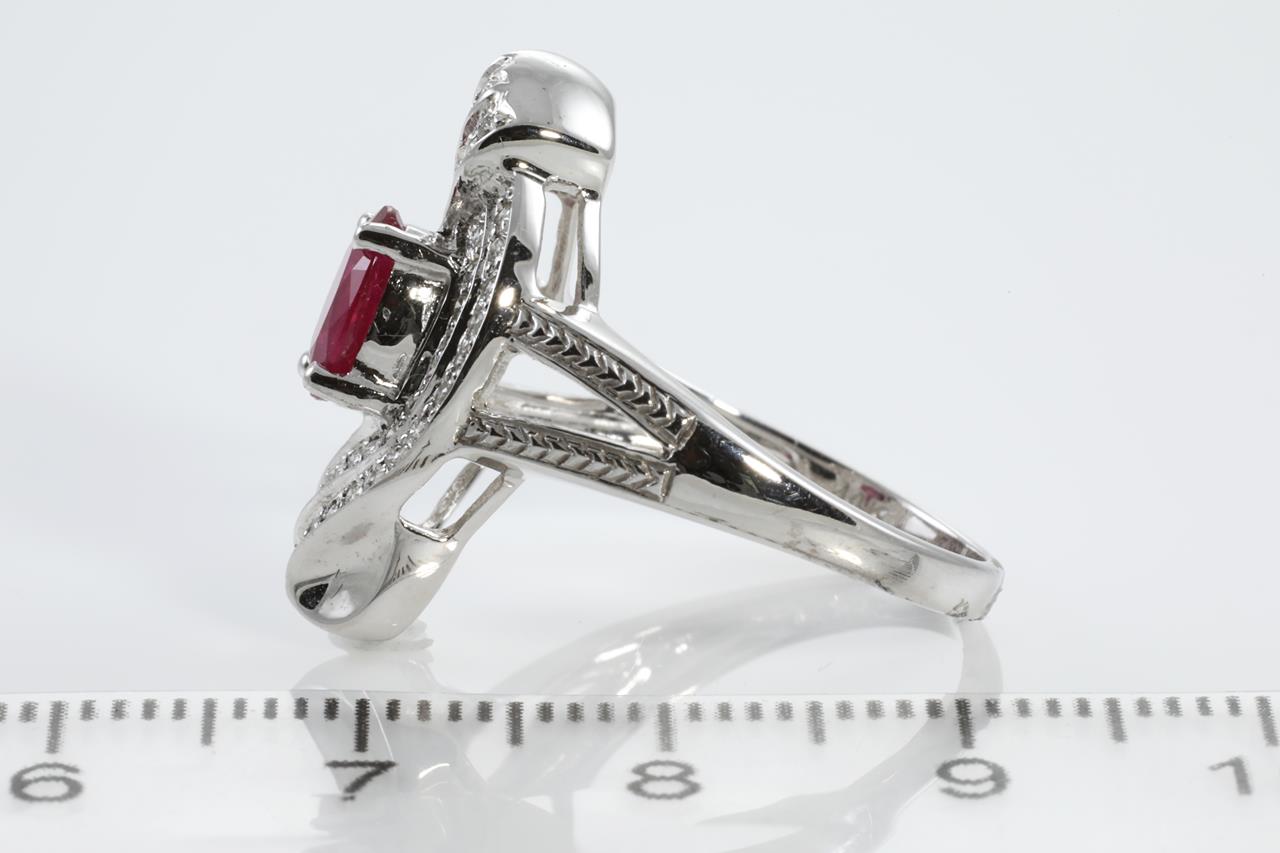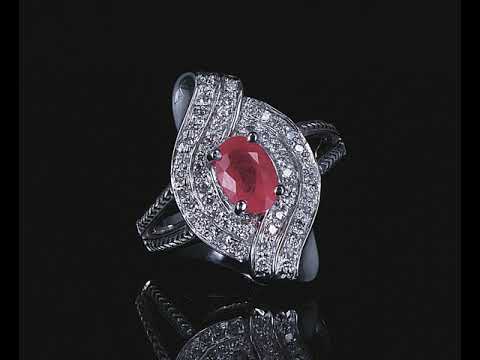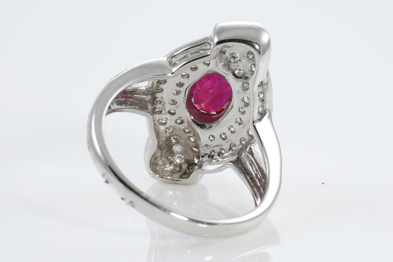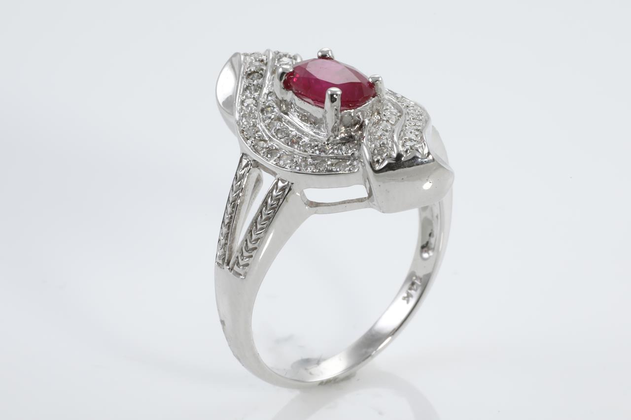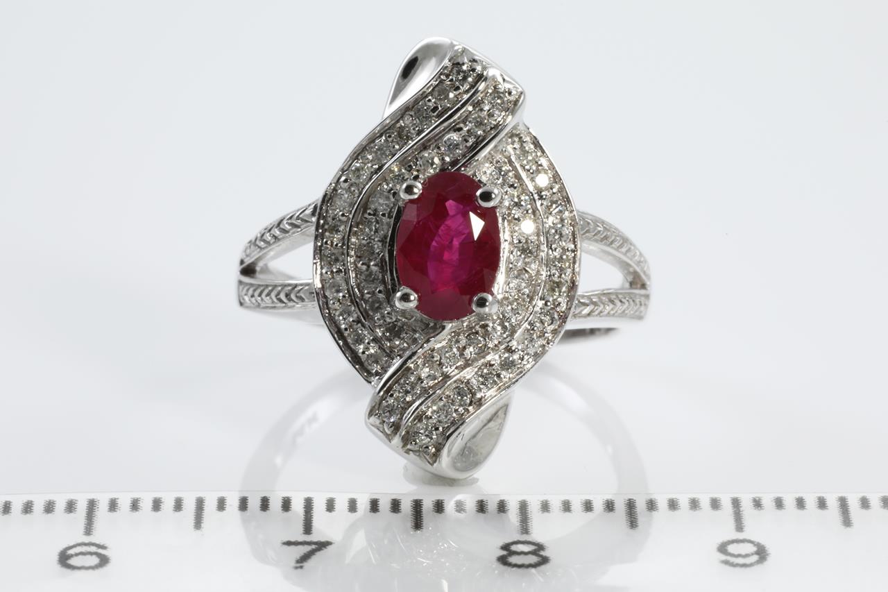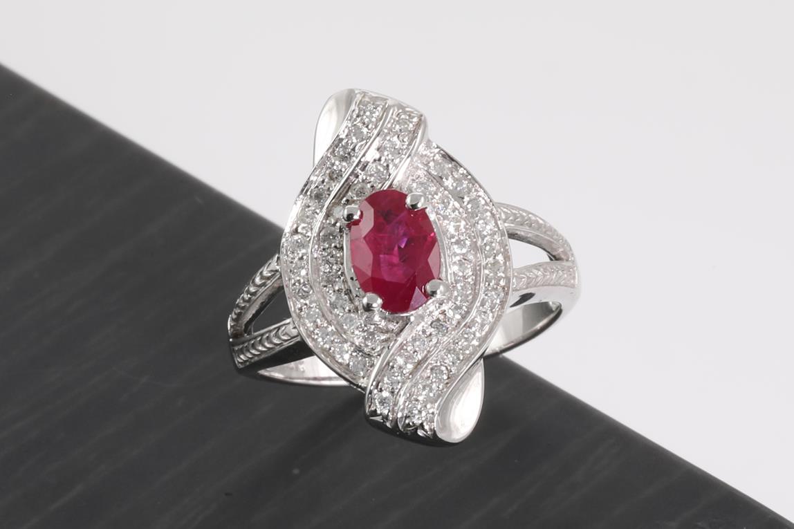 Ruby and Diamond ring with oval shape Ruby of 0.52ct and Diamonds totalling 0.28cts. 14ct White gold. Ring size N. Weight 4.5g. (As New)