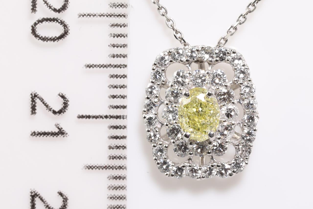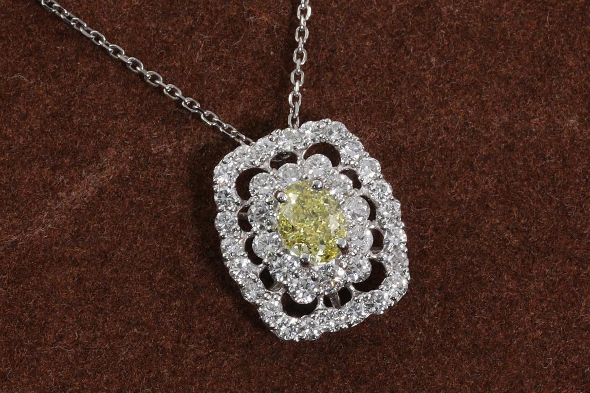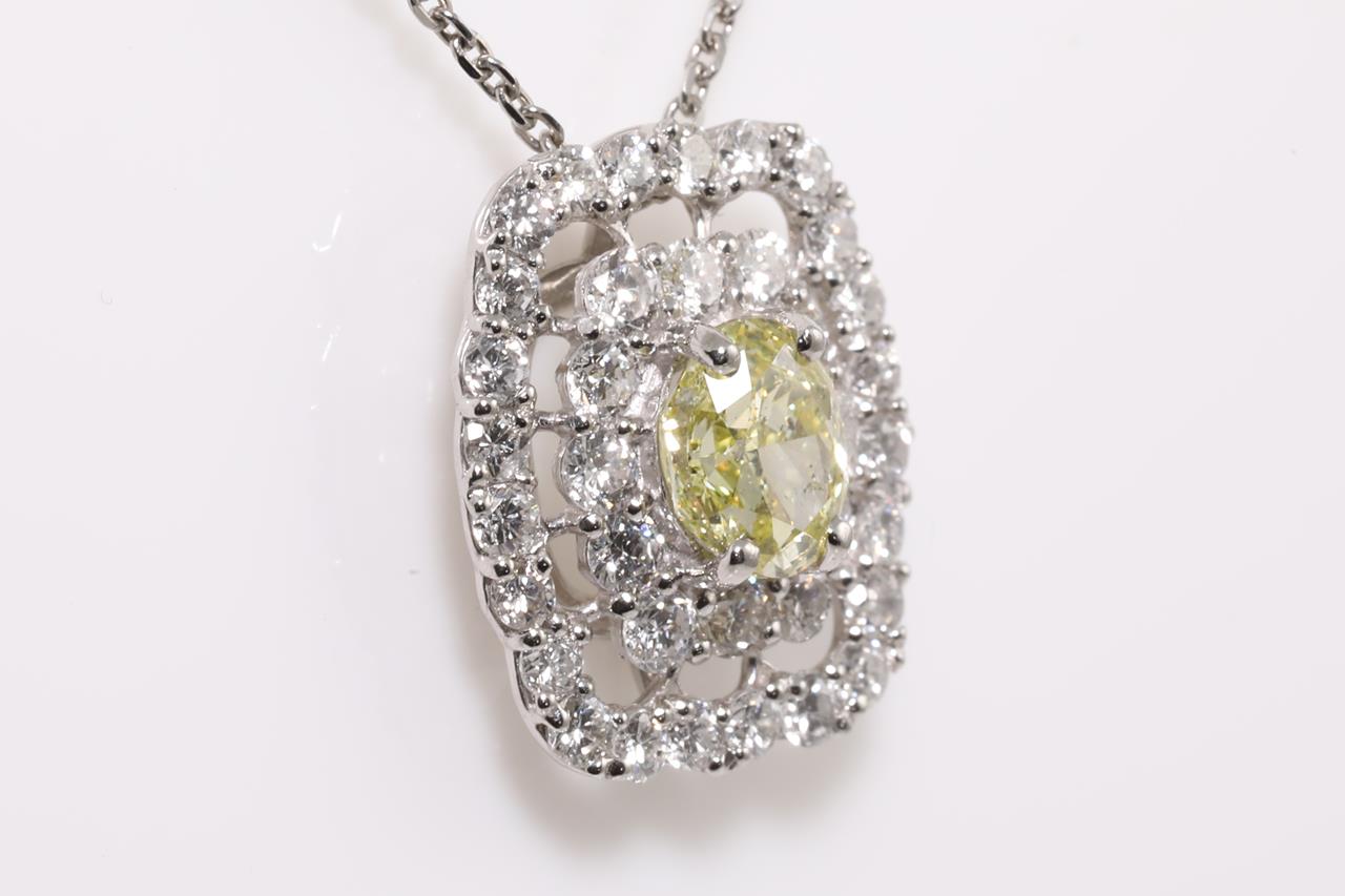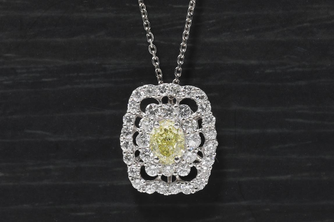Diamond pendant with an oval Diamond of 0.52ct (Estimated grading: Natural Fancy Intense Yellow SI2) and white Diamonds totalling 0.70cts (Estimated grading: G-H SI-P1). Platinum with adjustable 45cm chain. Weight: 3.5g. (Pre-owned)