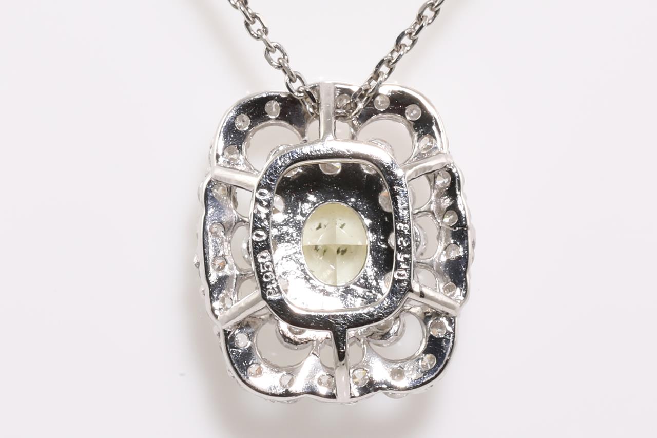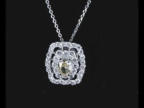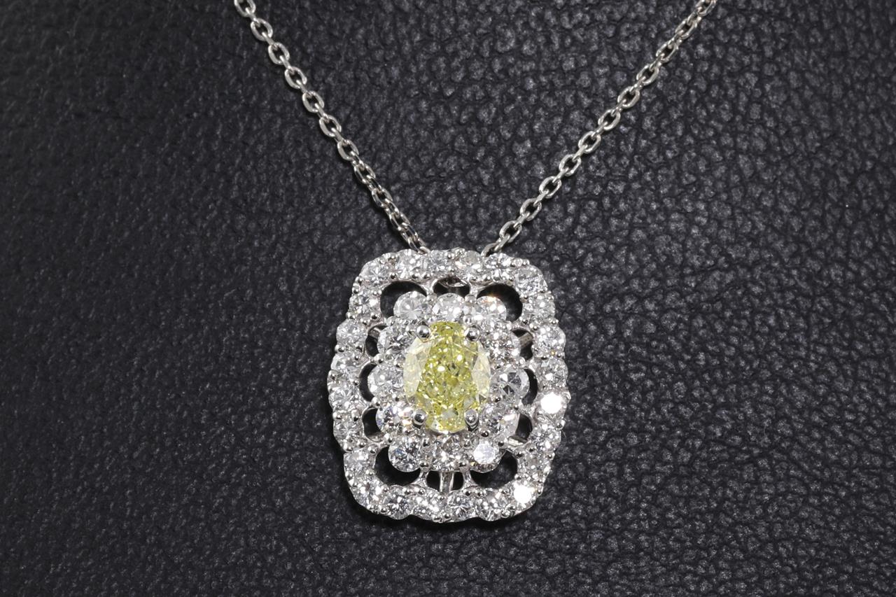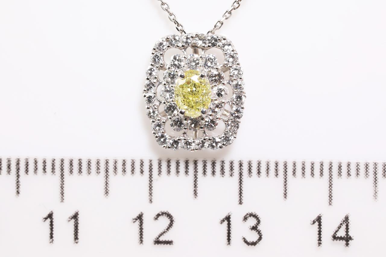 Diamond pendant with an oval Diamond of 0.52ct (Estimated grading: Natural Fancy Intense Yellow SI2) and white Diamonds totalling 0.70cts (Estimated grading: G-H SI-P1). Platinum with adjustable 45cm chain. Weight: 3.5g. (Pre-owned)