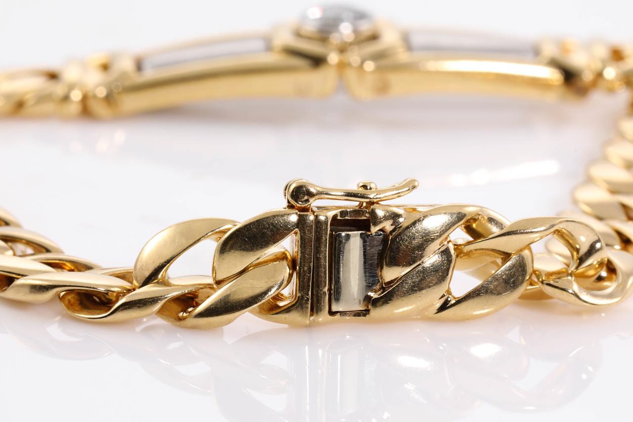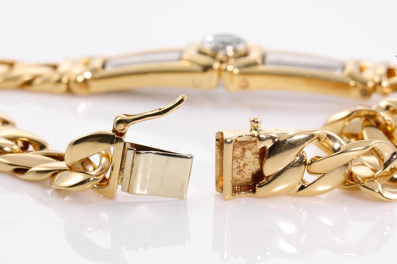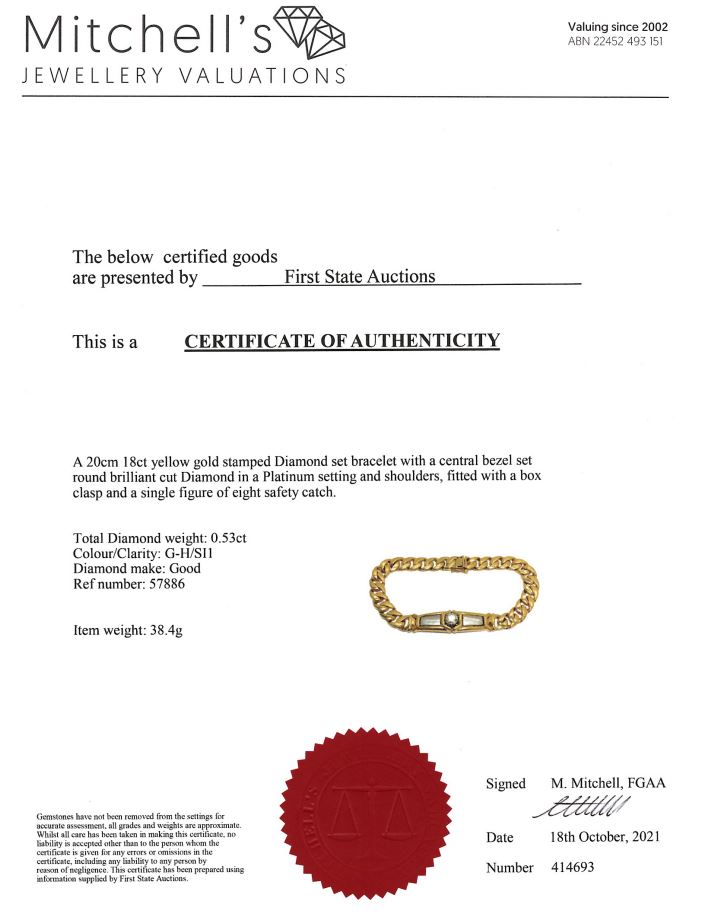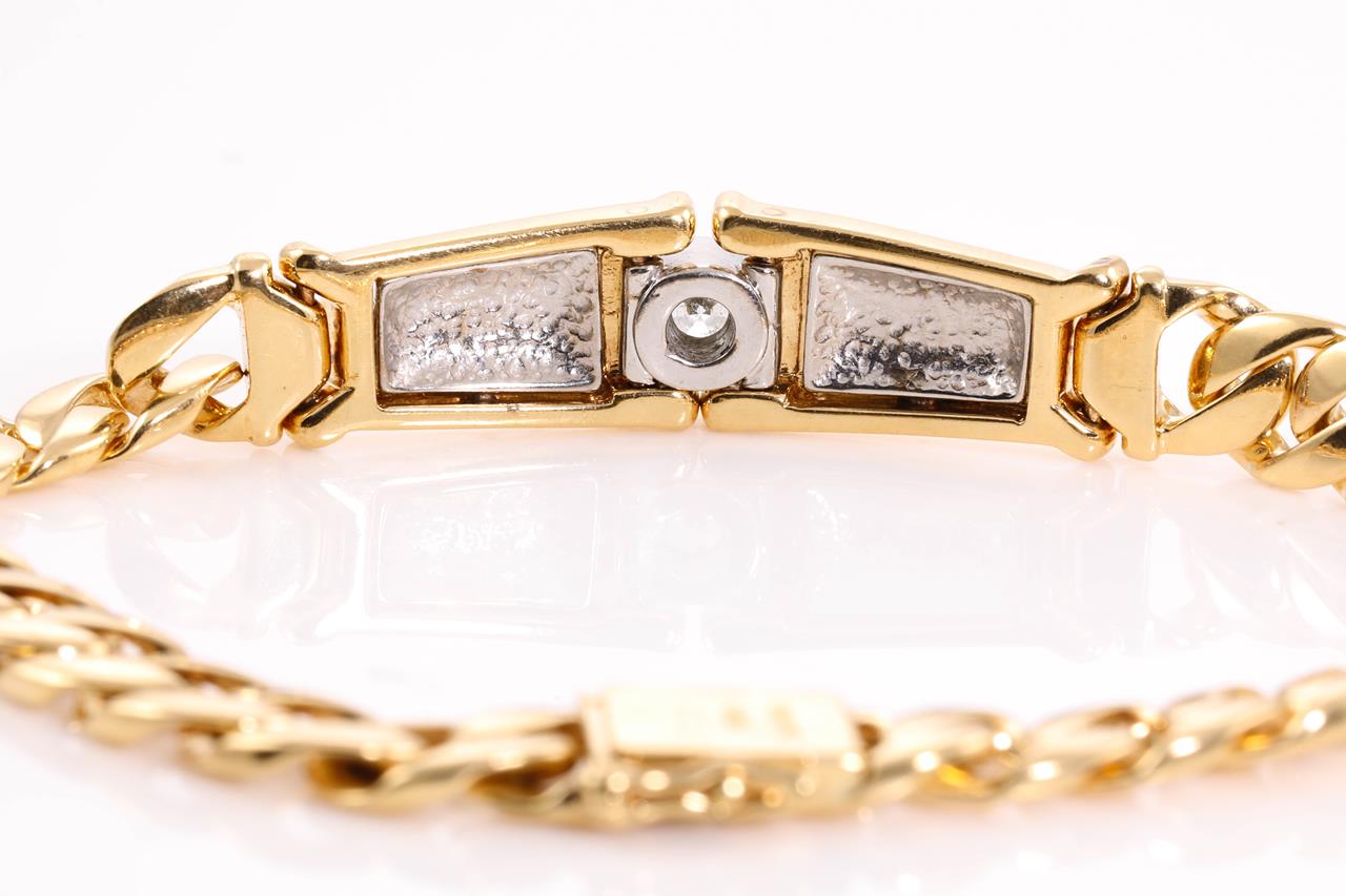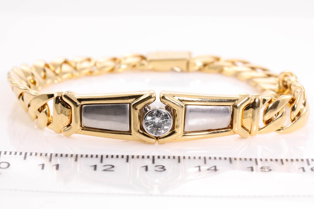 Diamond bracelet with a round Diamond of 0.53ct (Estimated grading: G-H SI1). 18ct yellow gold & platinum. Weight: 38.4g. Length: 20cm. With certificate #414693. (Pre-owned)