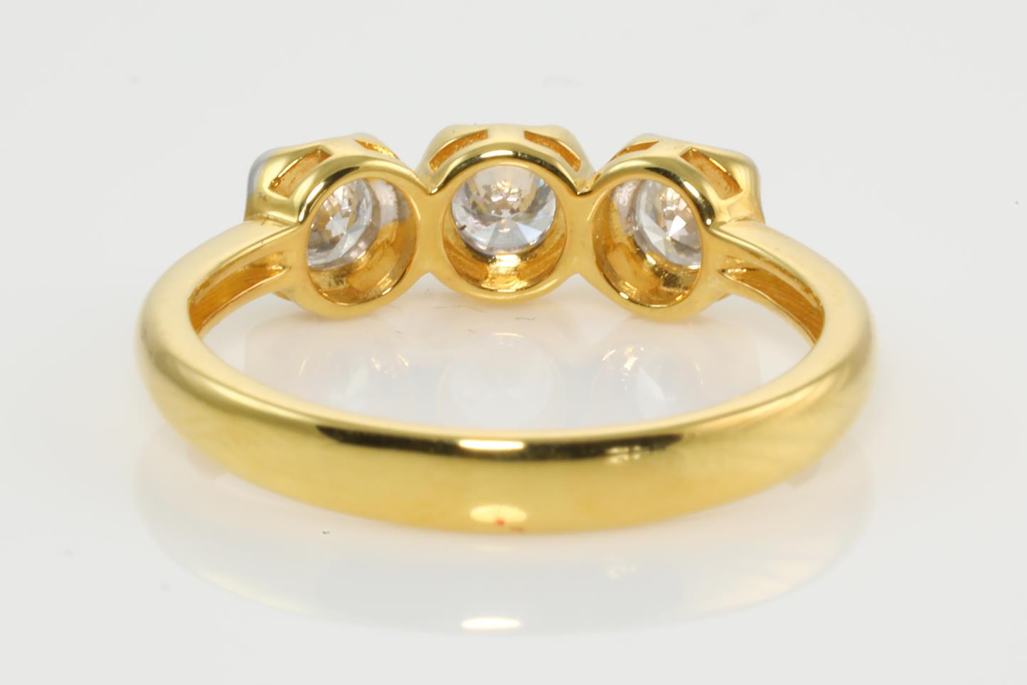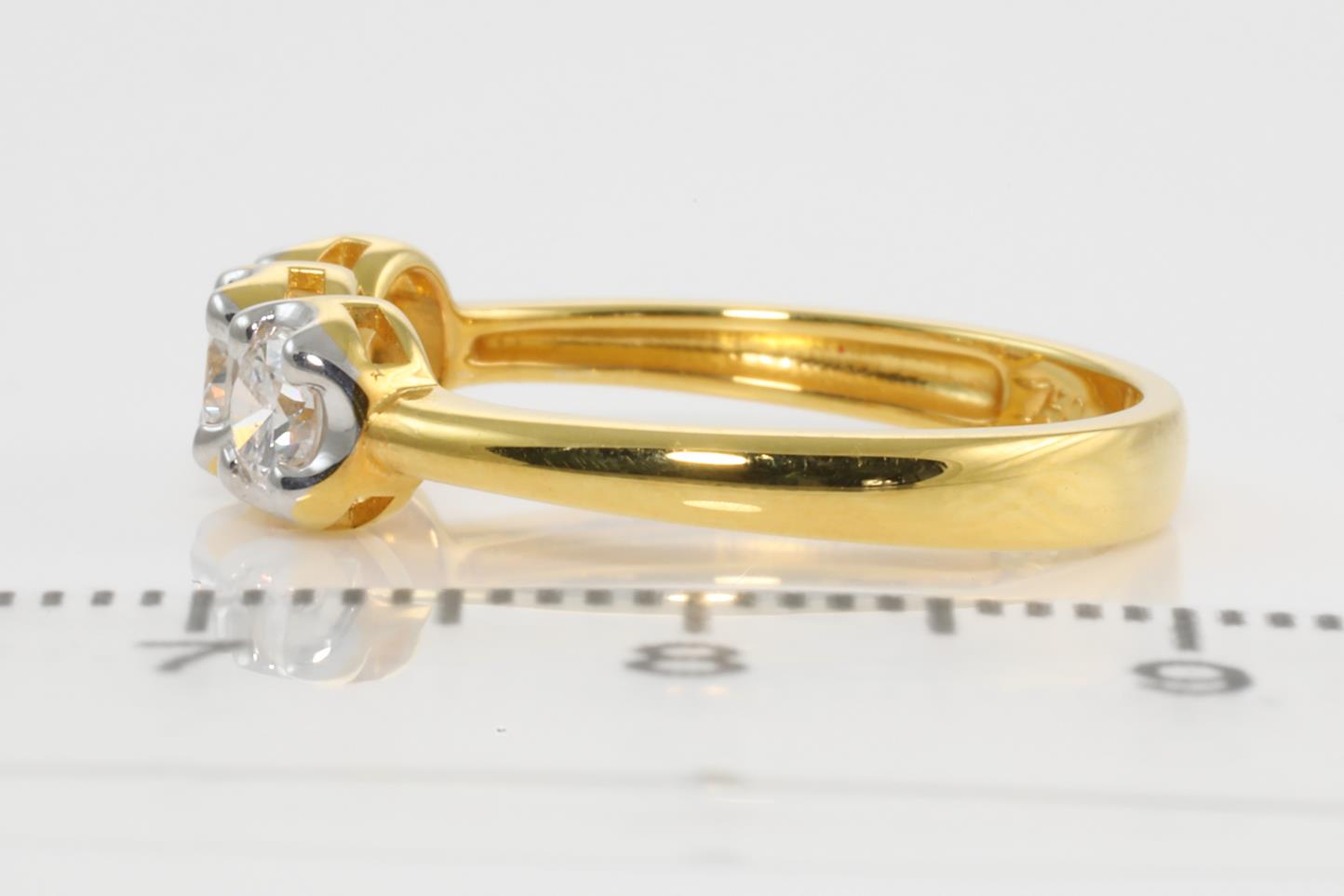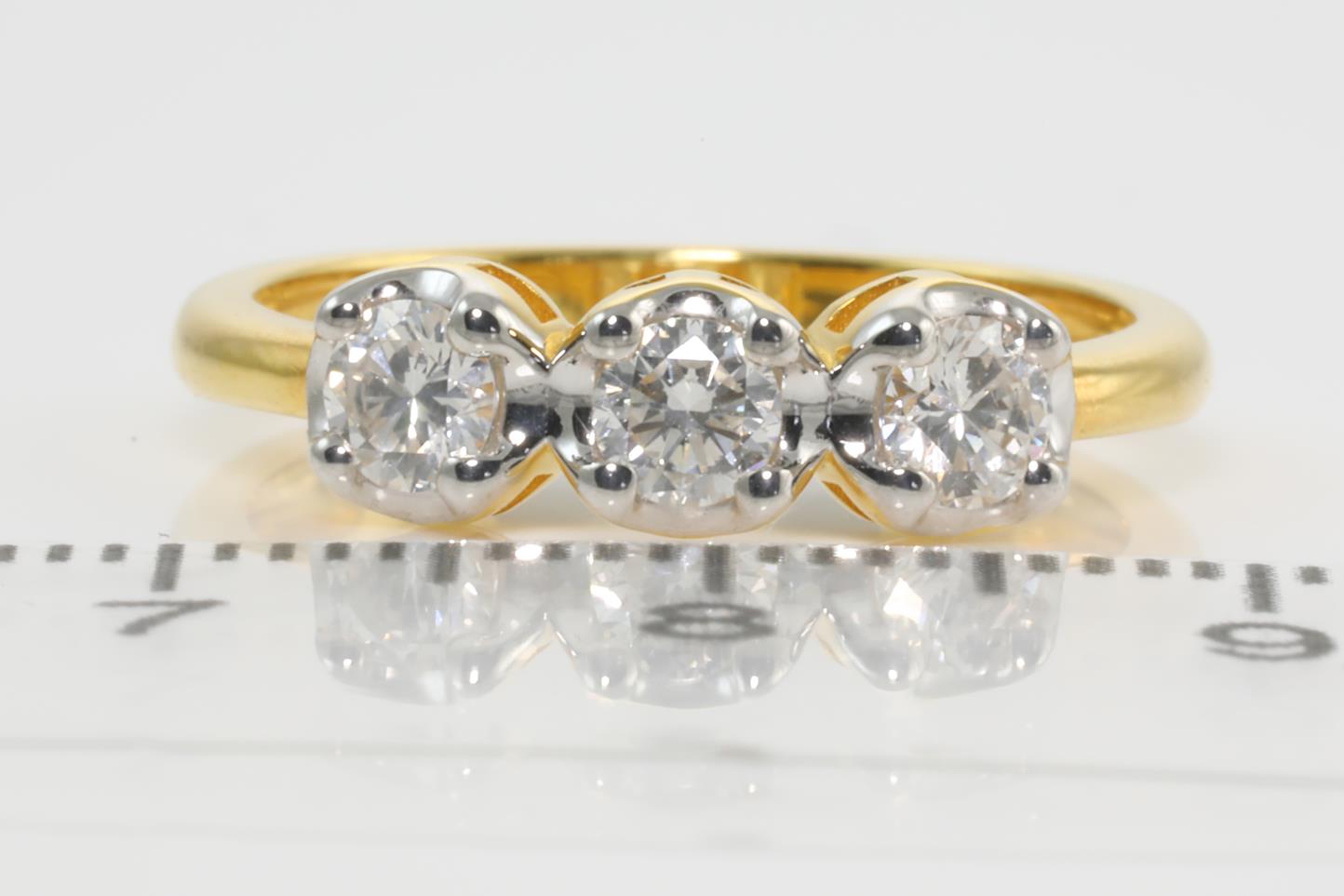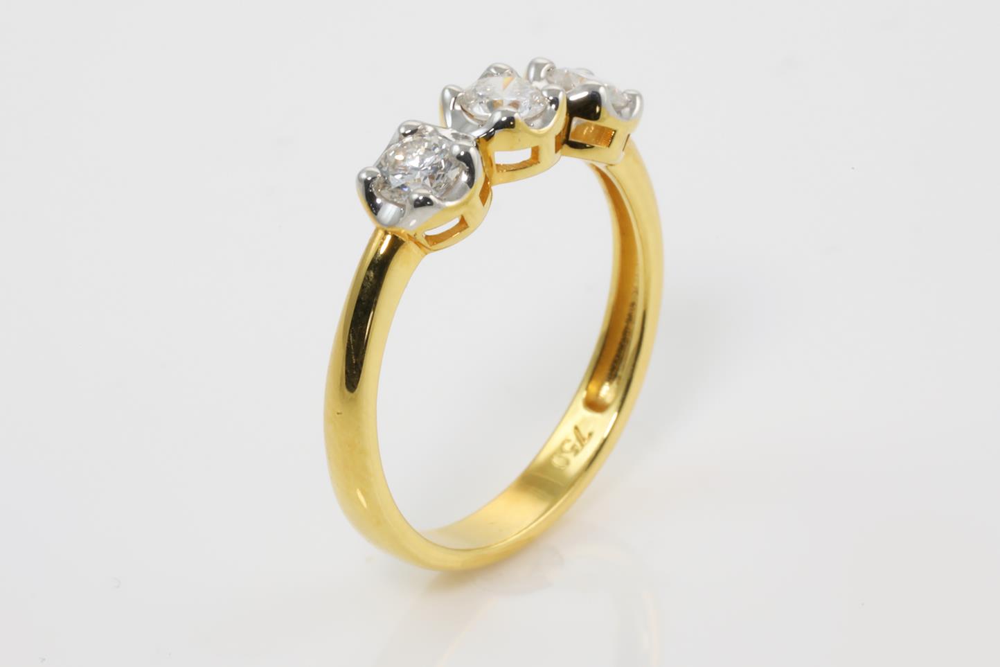 Diamond ring with 3 round Diamonds totalling 0.53cts (Estimated grading:H SI). 18ct yellow gold. Ring size M. Weight: 2.9g (As New)
