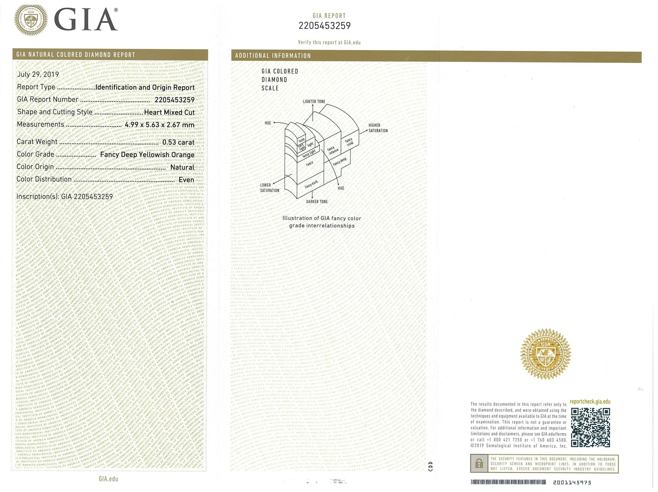 A loose heart shape Diamond of 0.53ct (with GIA report graded as Natural Fancy Deep Yellowish Orange Even #2205453259 - FSA estimated clarity grade: P1-2). (New)