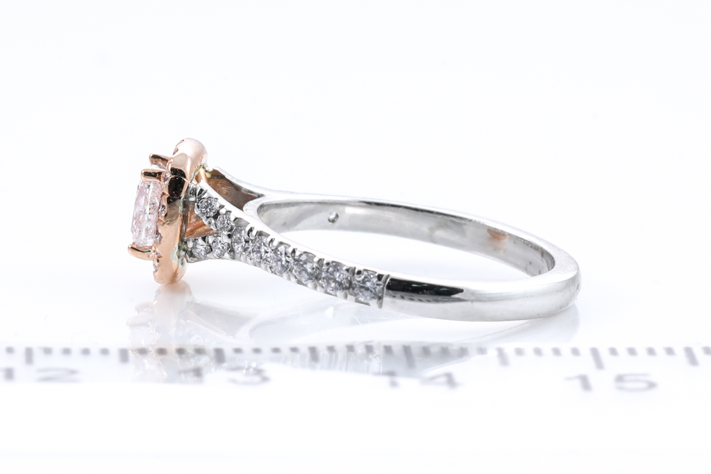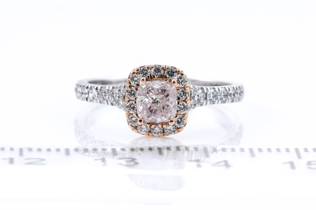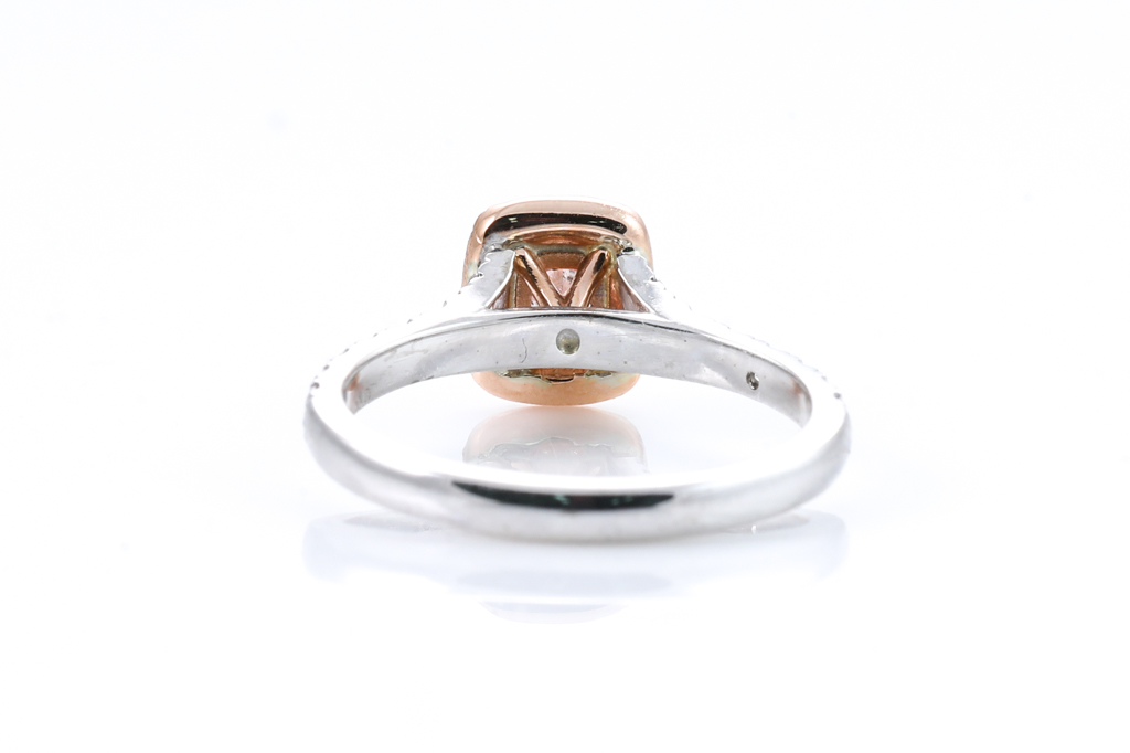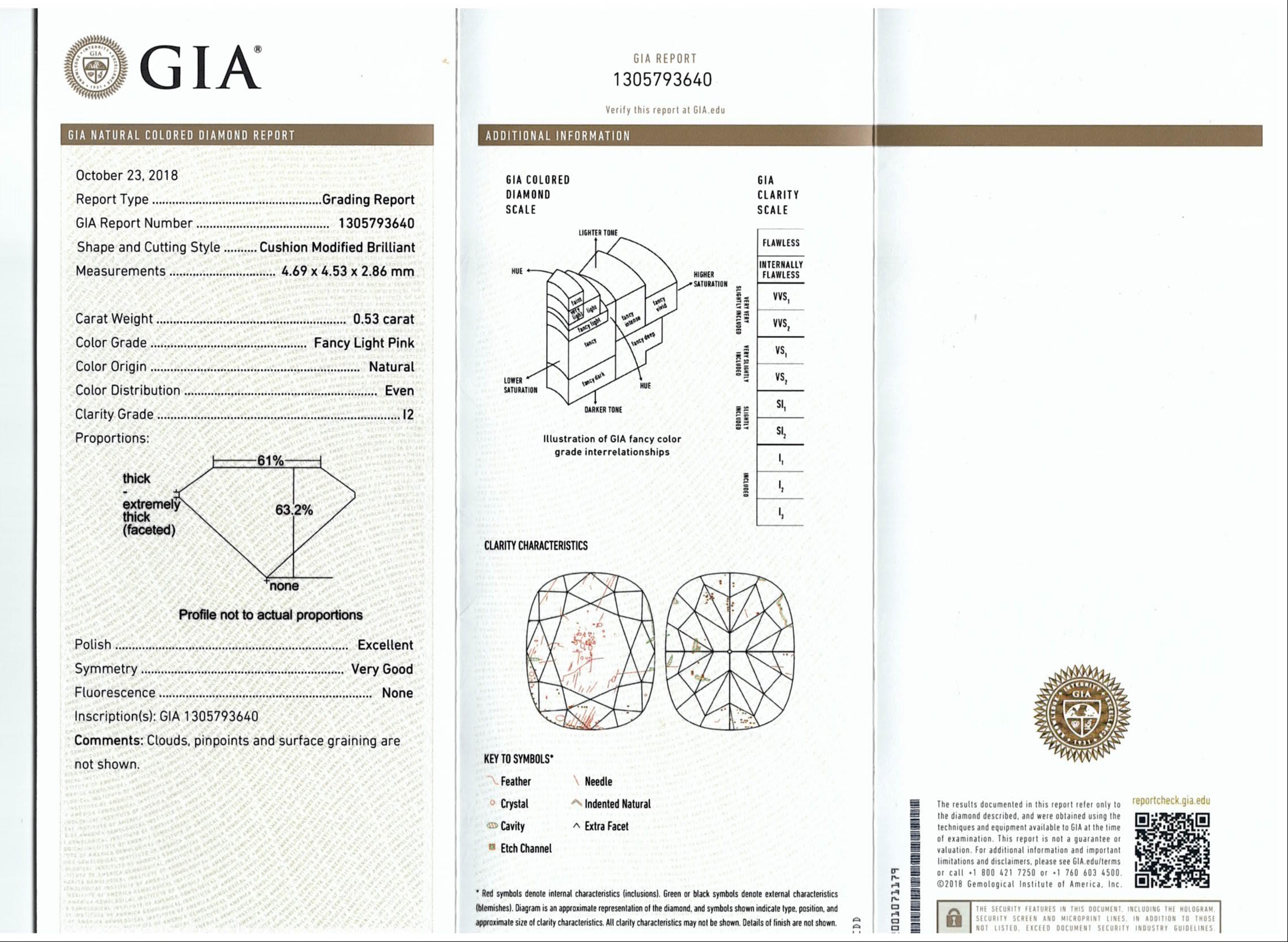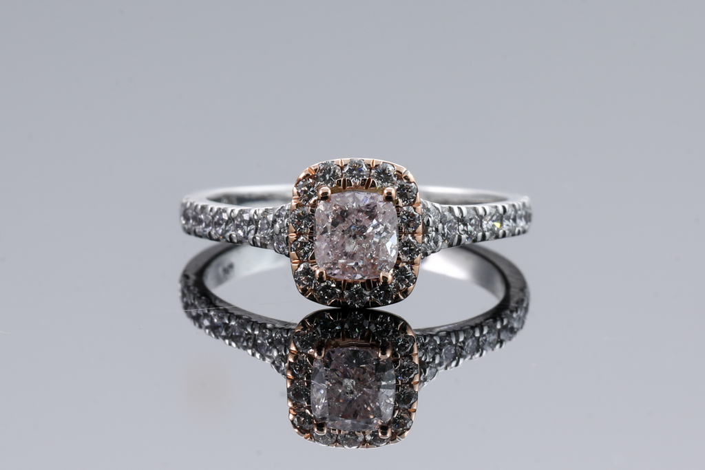 Diamond ring with centre cushion cut Diamond of 0.53ct (with GIA report graded as Natural Fancy Light Pink Even P2#1305793640, FSA estimated clarity grade: P2) and round Diamonds totalling 0.41cts (Estimate grading: G-H VS-SI). 18ct white and rose gold. Ring Size K1/2. Weight 3.5g. (New)