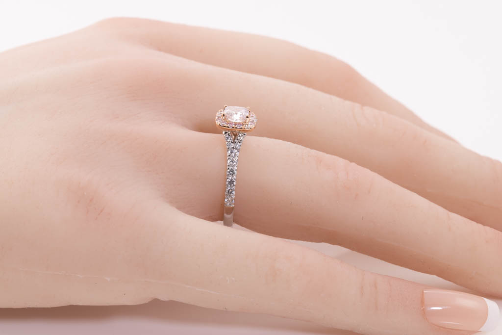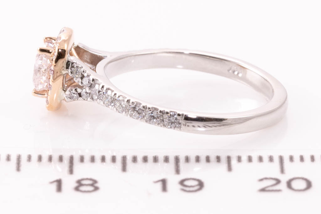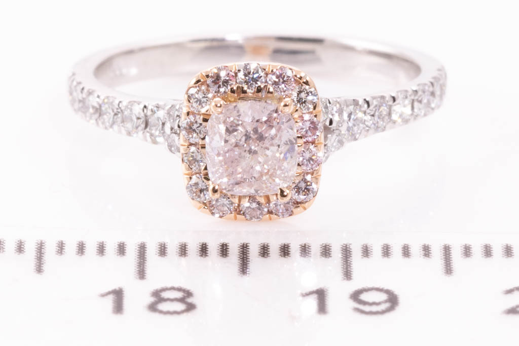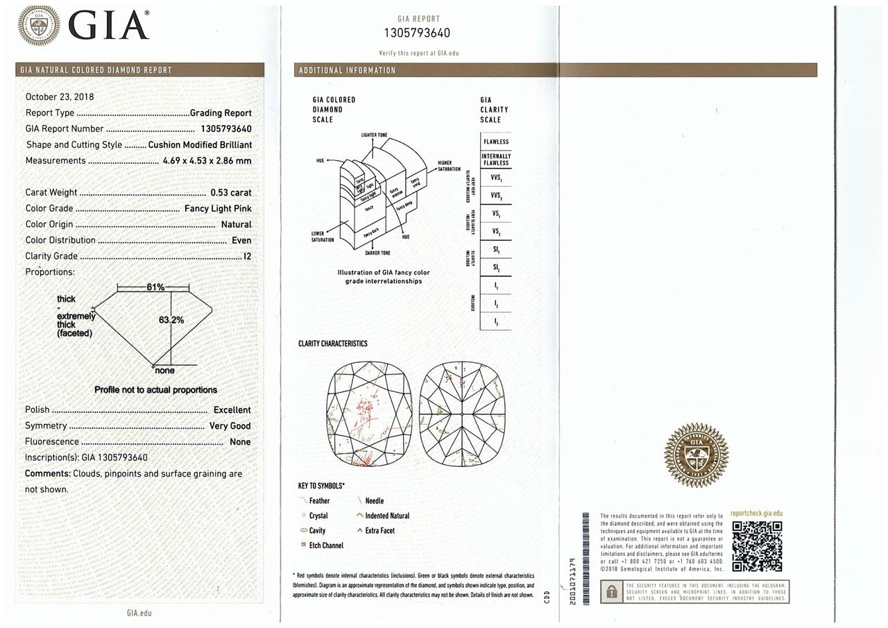 Diamond ring with centre cushion cut Diamond of 0.53ct (with GIA report graded as Natural Fancy Light Pink Even P2 #1305793640) and round Diamonds totalling 0.41cts (Estimate grading: G-H VS-SI). 18ct white and rose gold. Ring Size K1/2. Weight 3.5g. (Pre-owned)