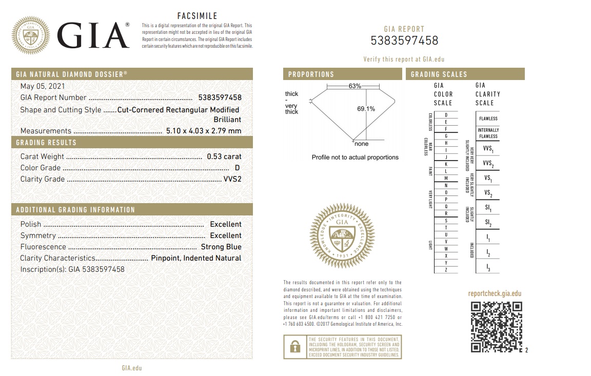 A loose radiant cut (cut-cornered rectangular modified brilliant) Diamond of 0.53ct (With GIA summary report graded as D VVS2 #5383597458). (New)