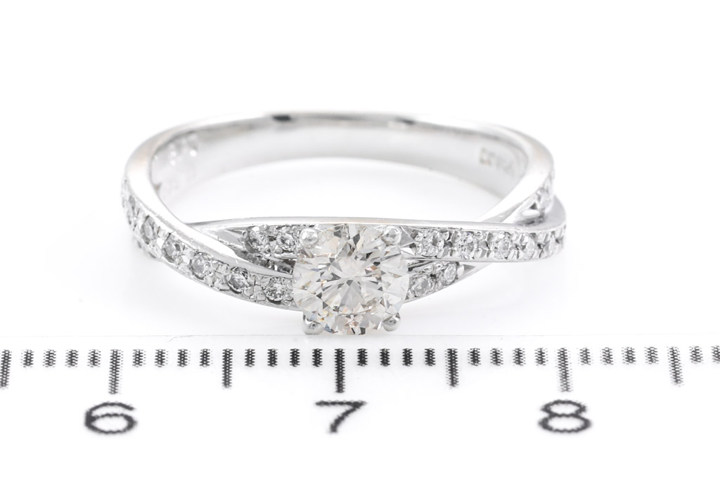 Diamond ring with centre round Diamond of 0.54ct (Estimated grading: TTLB SI2) and remaining round Diamonds totalling 0.18cts. Platinum. Ring size M. Weight: 5.0g (Pre-owned)