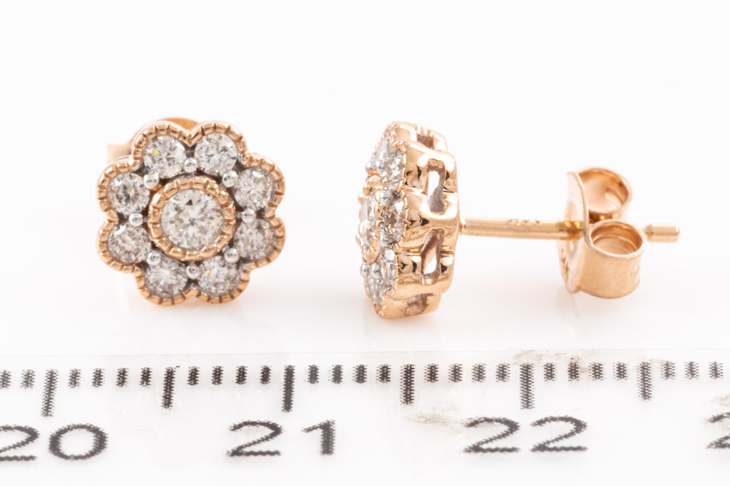 Diamond earrings with 18 round diamonds totalling 0.54cts. (Estimated grading: H SI). 14ct rose gold with rhodium plated claws. Weight: 2g. (New)