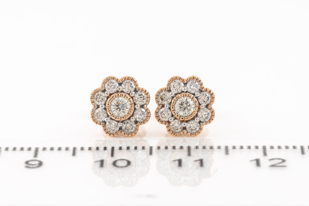 Diamond earrings with 18 round diamonds totalling 0.54cts. (Estimated grading: H SI). 14ct rose gold. Weight: 2.1g. (New)