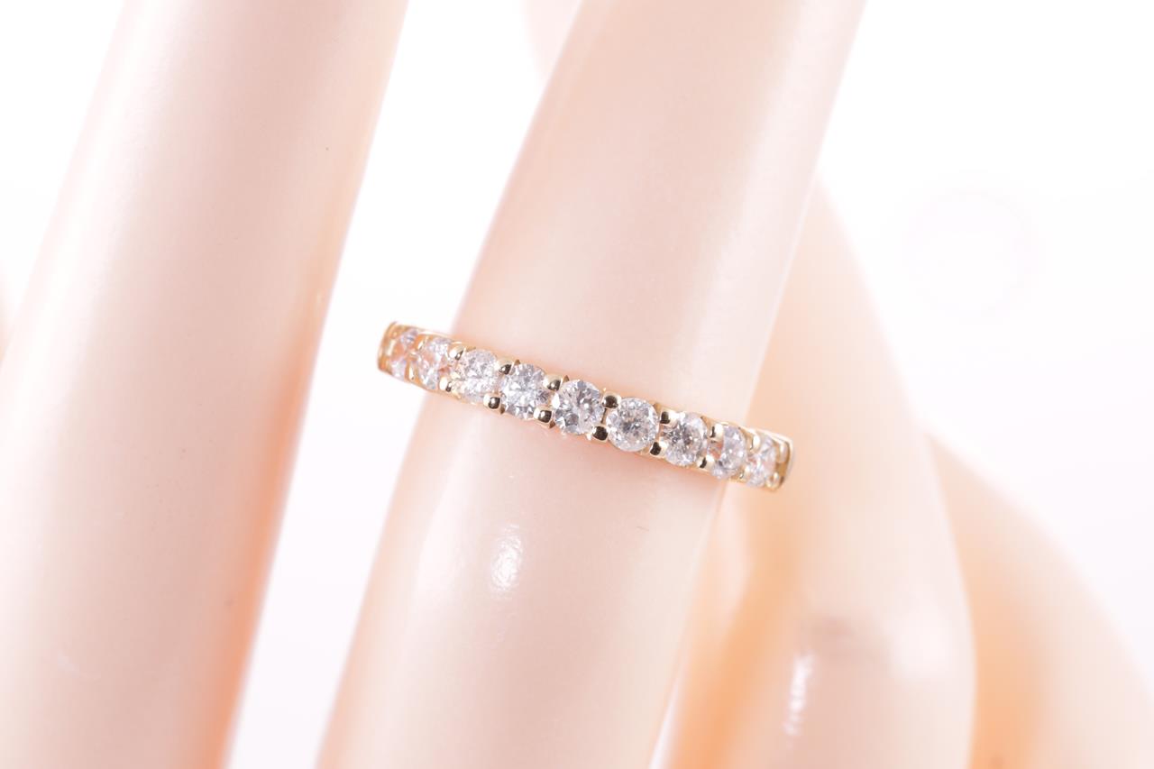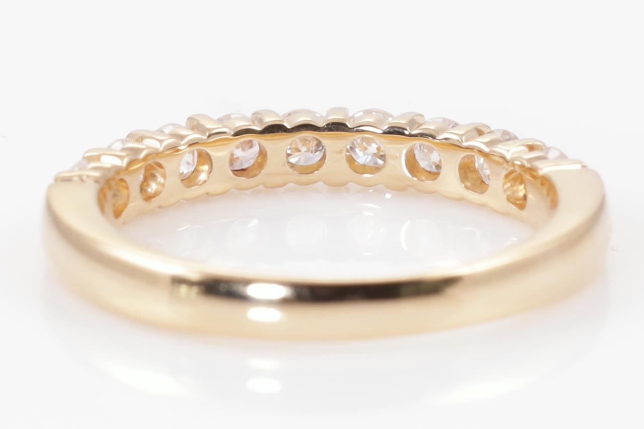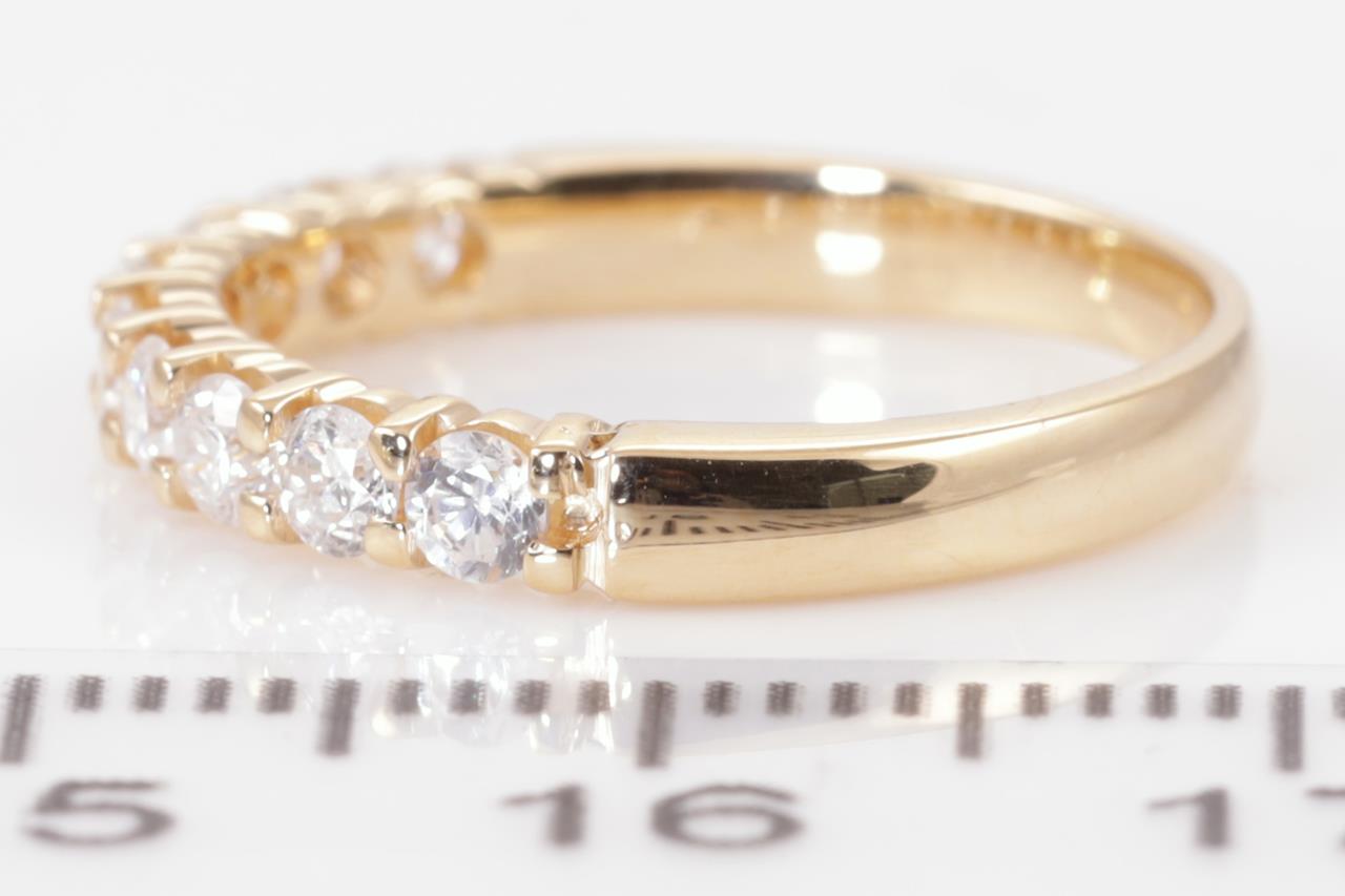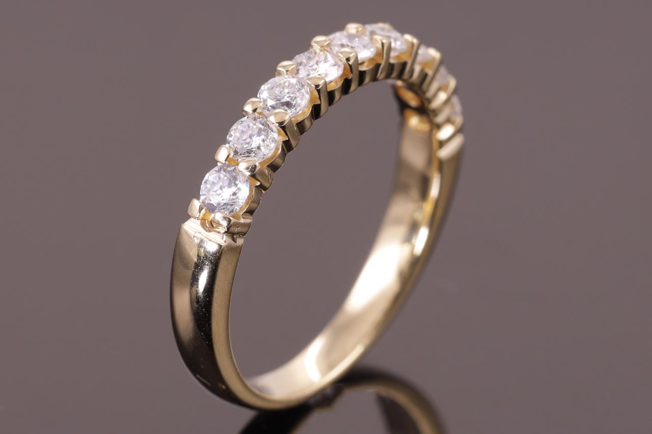 Diamond ring with 9 round Diamonds totalling 0.54cts (Estimated grading: G SI-P1). 18ct yellow gold. Ring size J1/2 - can be resized up by a maximum of 3 sizes, down ring ring clip. Weight: 2.6g. (Pre-owned)