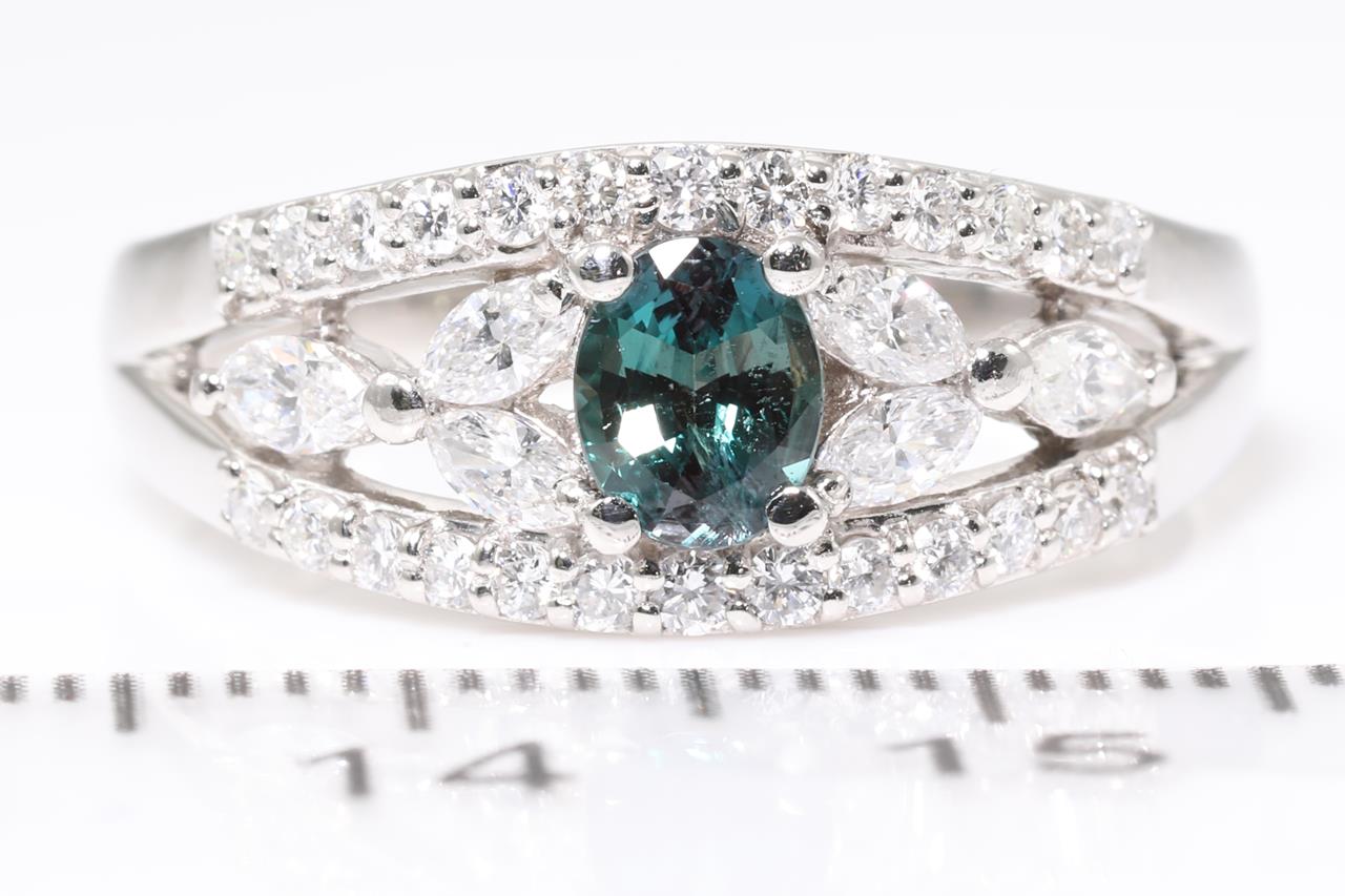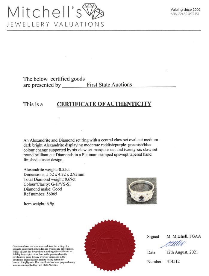 Alexandrite and Diamond ring with an oval Alexandrite of 0.55ct (Colour change from reddish/purple to greenish/blue) and Diamonds totalling 0.69cts (Estimated grading: G-H VS-SI). Platinum. Ring size P1/2. Weight: 6.9g. With certificate #414512. (As New)