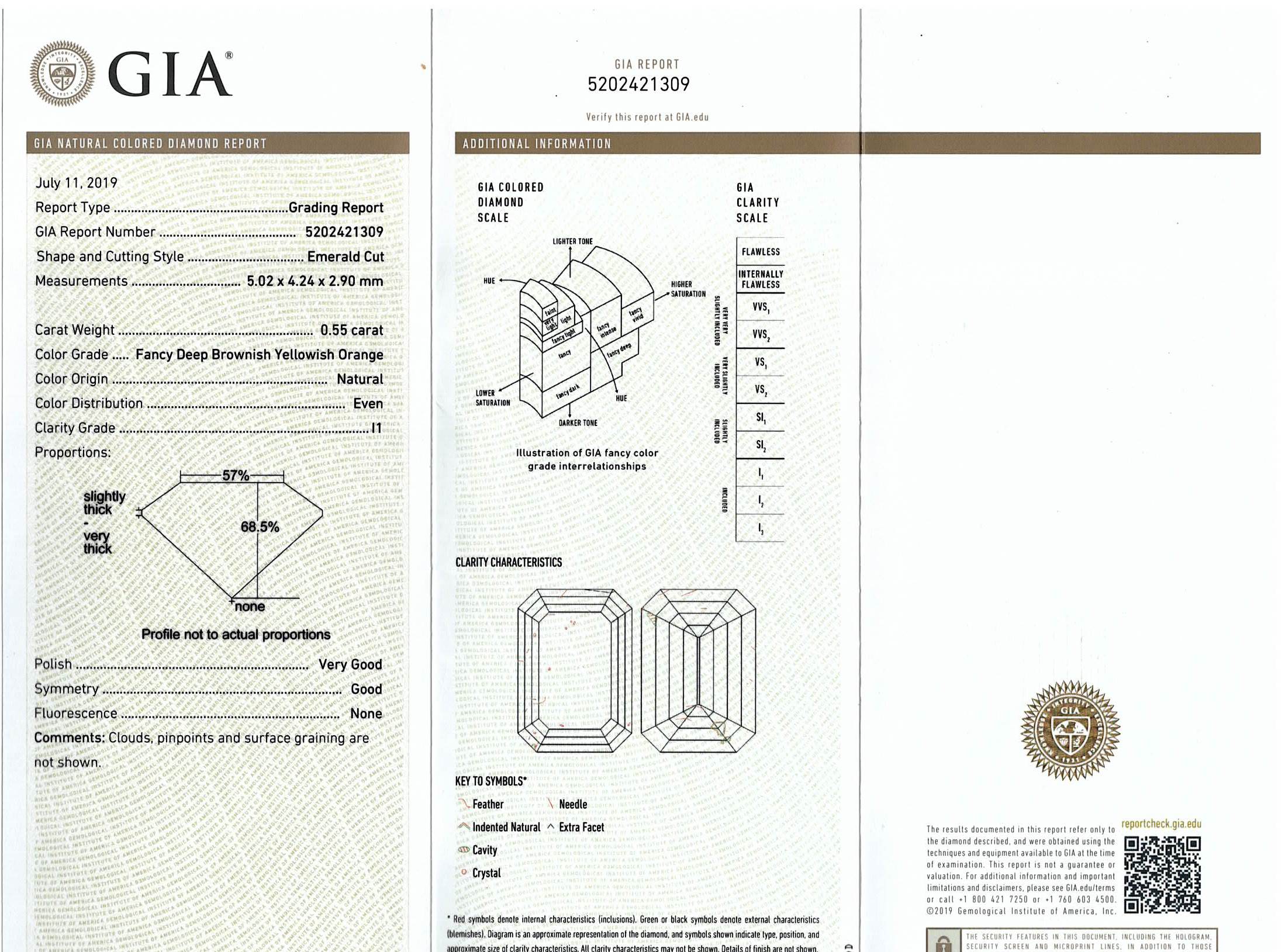 A loose emerald cut Diamond of 0.55ct (with GIA report graded as Natural Fancy Deep Brownish Yellowish Orange Even P1 #5202421309). (New)