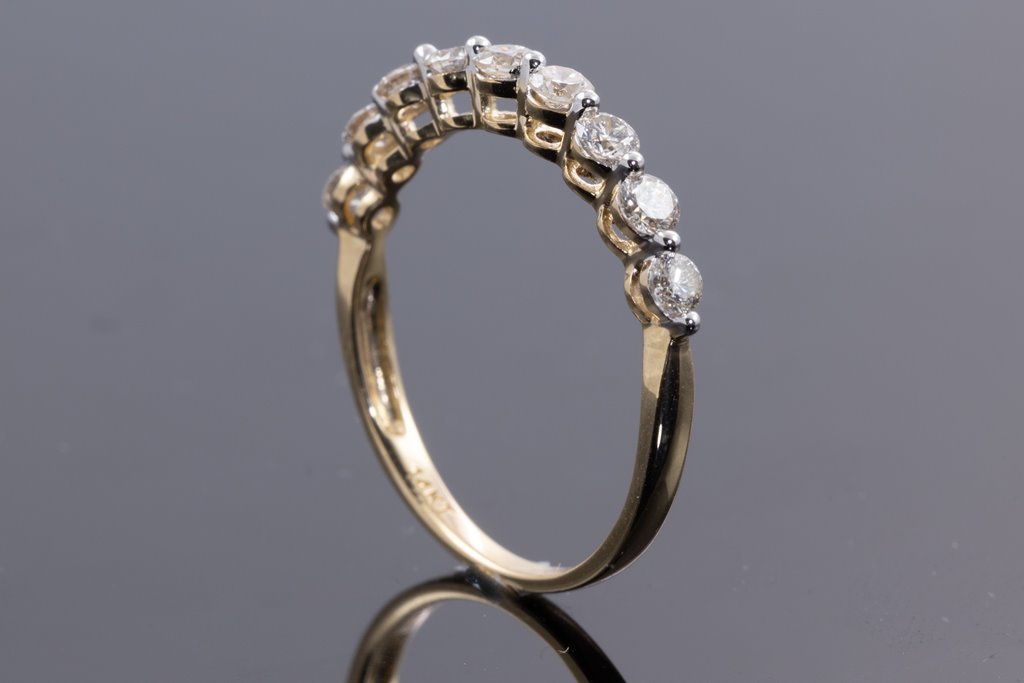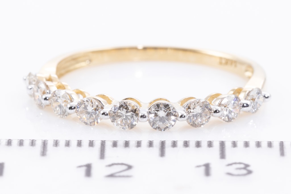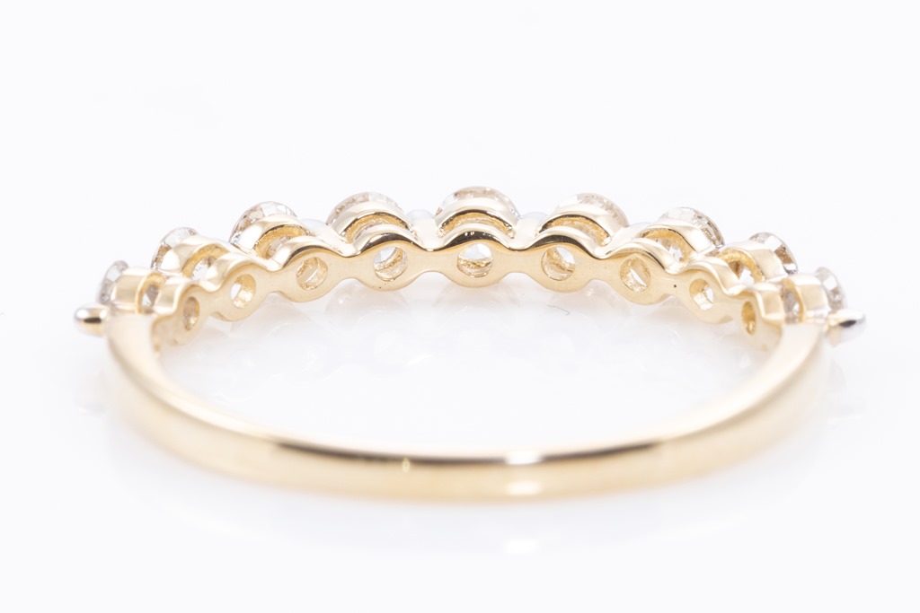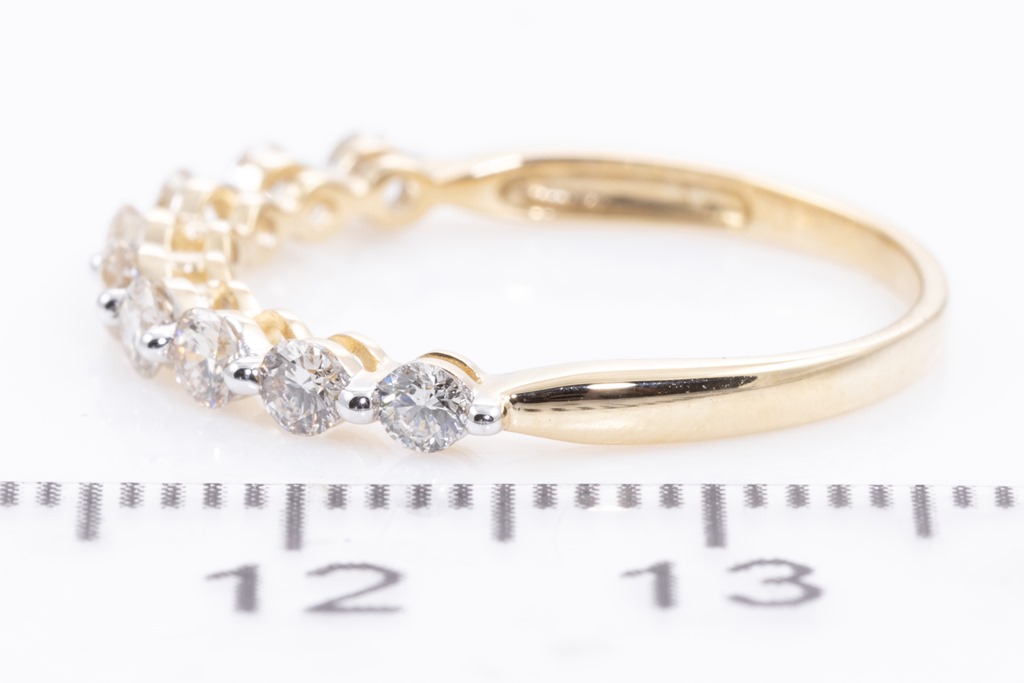 Diamond eternity ring with 9 round Diamonds totalling 0.55cts (Estimated grading: H SI). 14ct yellow gold. Ring size M1/2 - ring resizing is not recommended. Weight: 1.4g. (New)