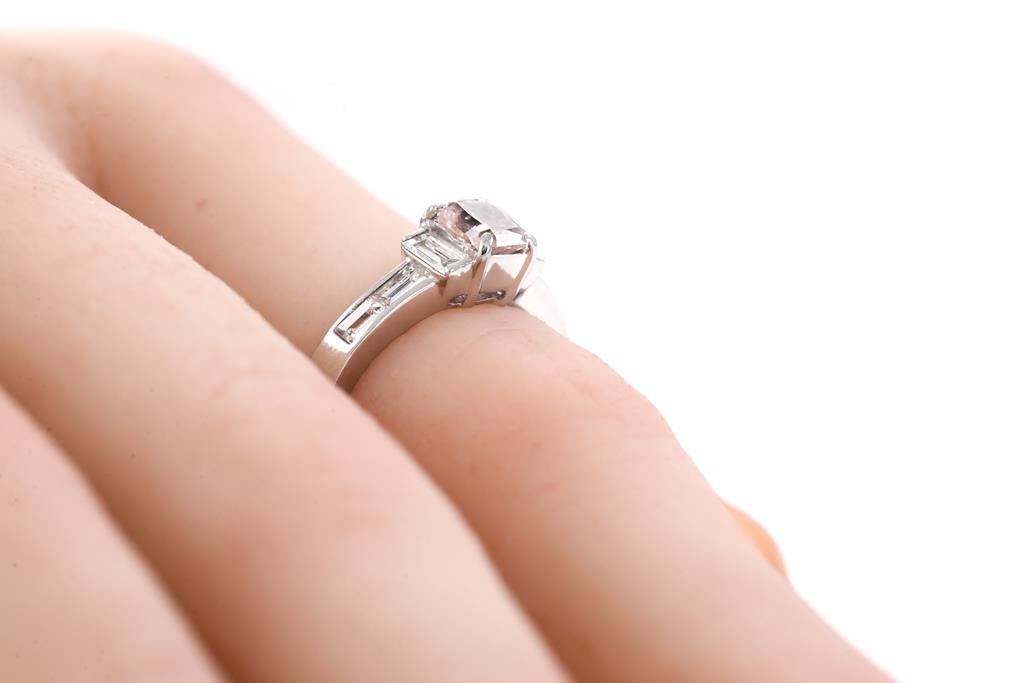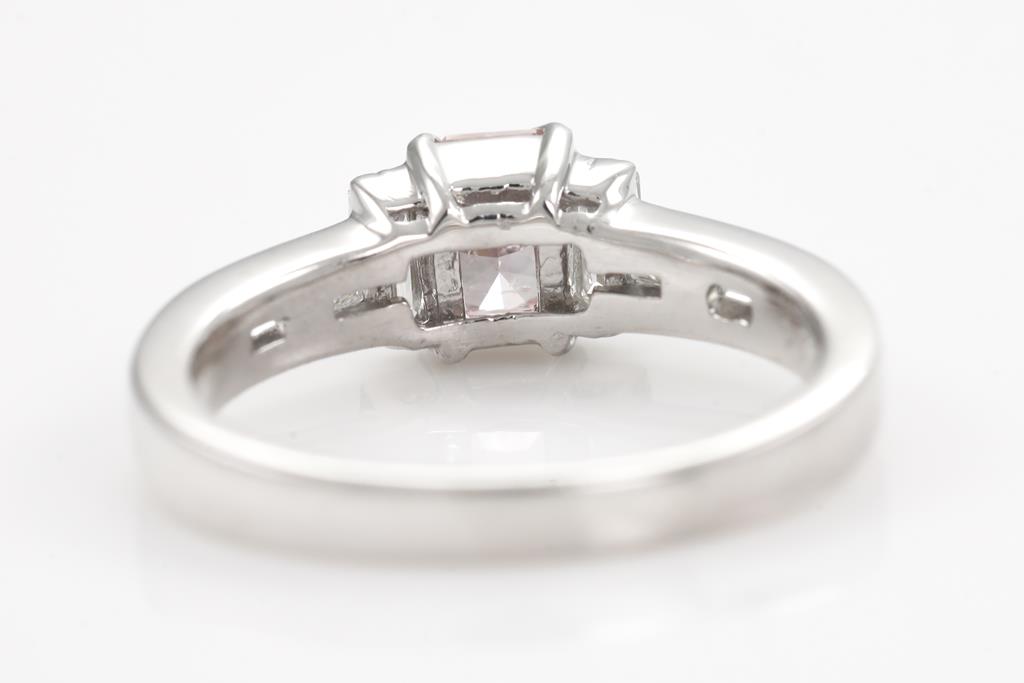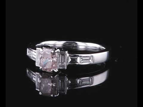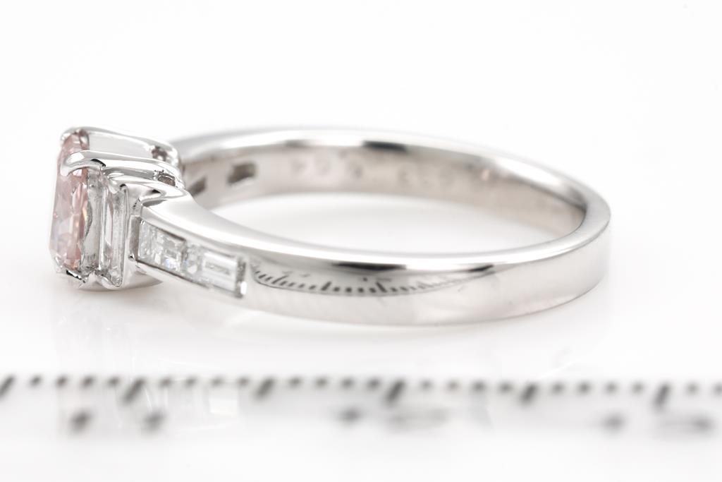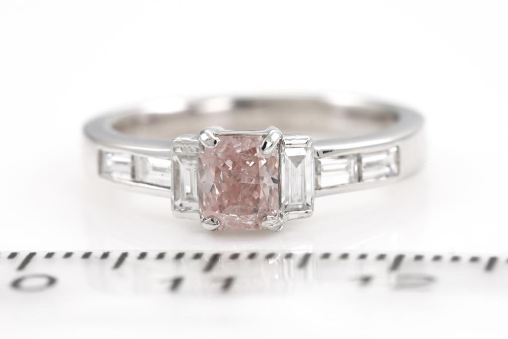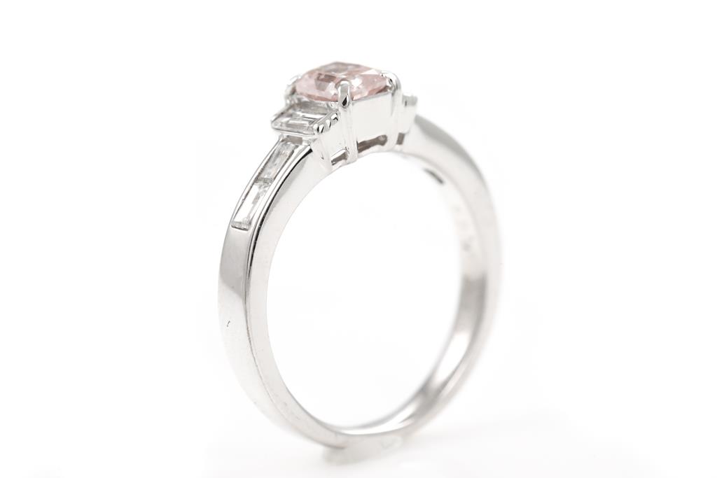 Diamond ring with centre radiant cut Diamond of 0.55ct (with GIA report graded as Natural Fancy Orangy Pink Even #5172354248) and baguette cut Diamonds totalling 0.64cts (Estimated grading: G VS). Platinum. Weight 5.0g (new)