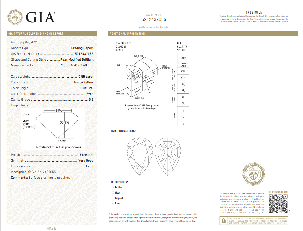 A loose Pear Shape Diamond of 0.55ct (with GIA report graded as Natural Fancy Yellow Even SI2 #5212437055). (New)