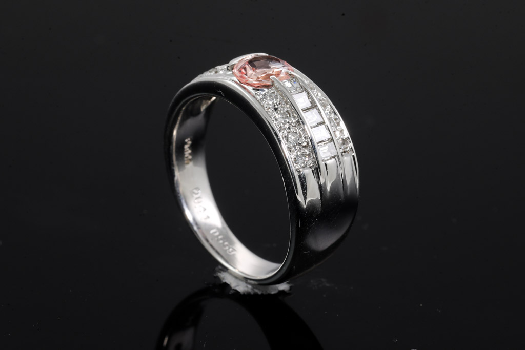 Sapphire and Diamond ring with oval shape Padparadscha Sapphire of 0.55ct and round & baguette cut Diamonds totalling 0.41cts (Estimated grading: G-H VS-SI). Platinum. Ring size L. Weight: 8.6g. (Pre-owned)