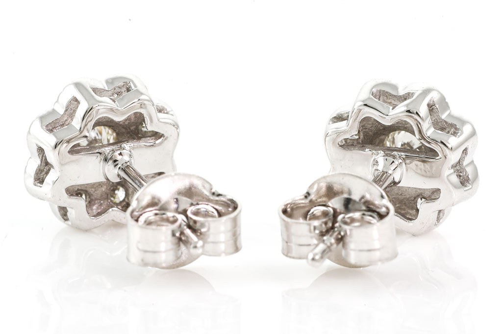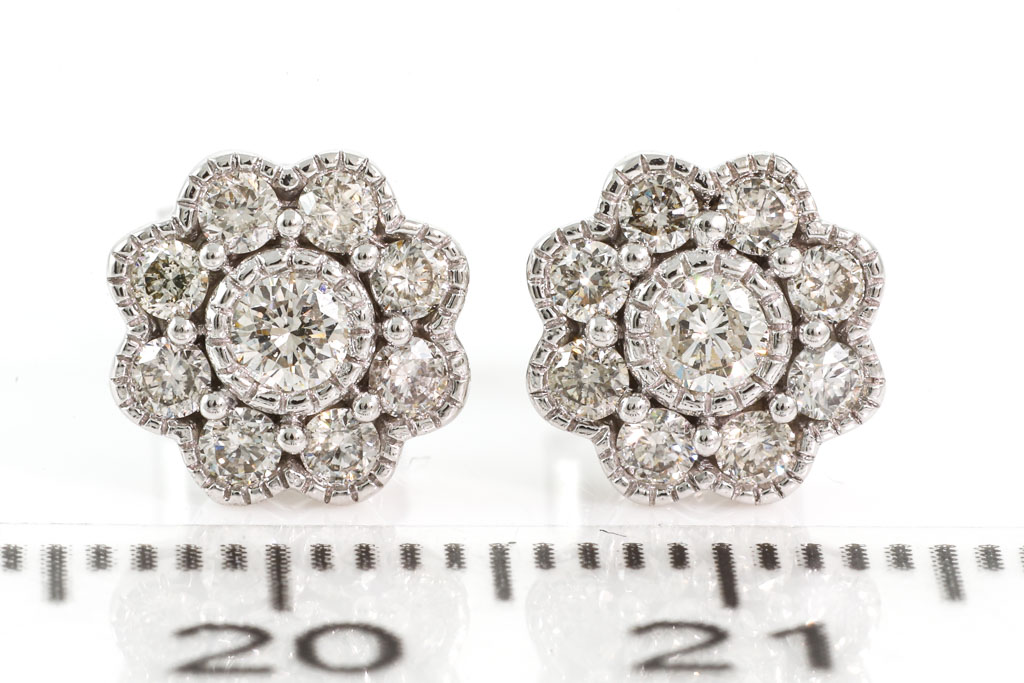 Diamond cluster earrings with 18 round Diamonds totalling 0.56cts. (Estimated grading: H SI). 14ct white gold. Weight: 2.1g. (New)