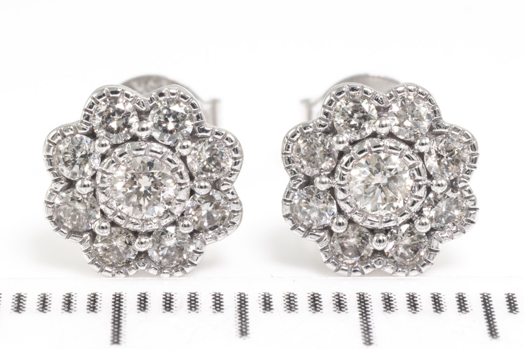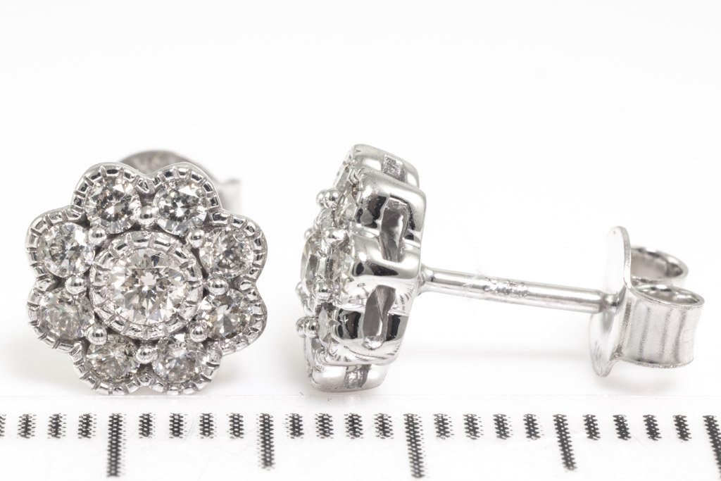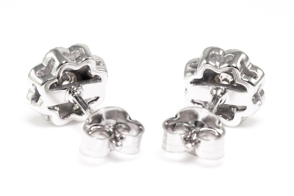 Diamond earrings with 18 round Diamonds totalling 0.56cts. (Estimated grading: H SI). 14ct white gold. Weight: 2.1g. (New)