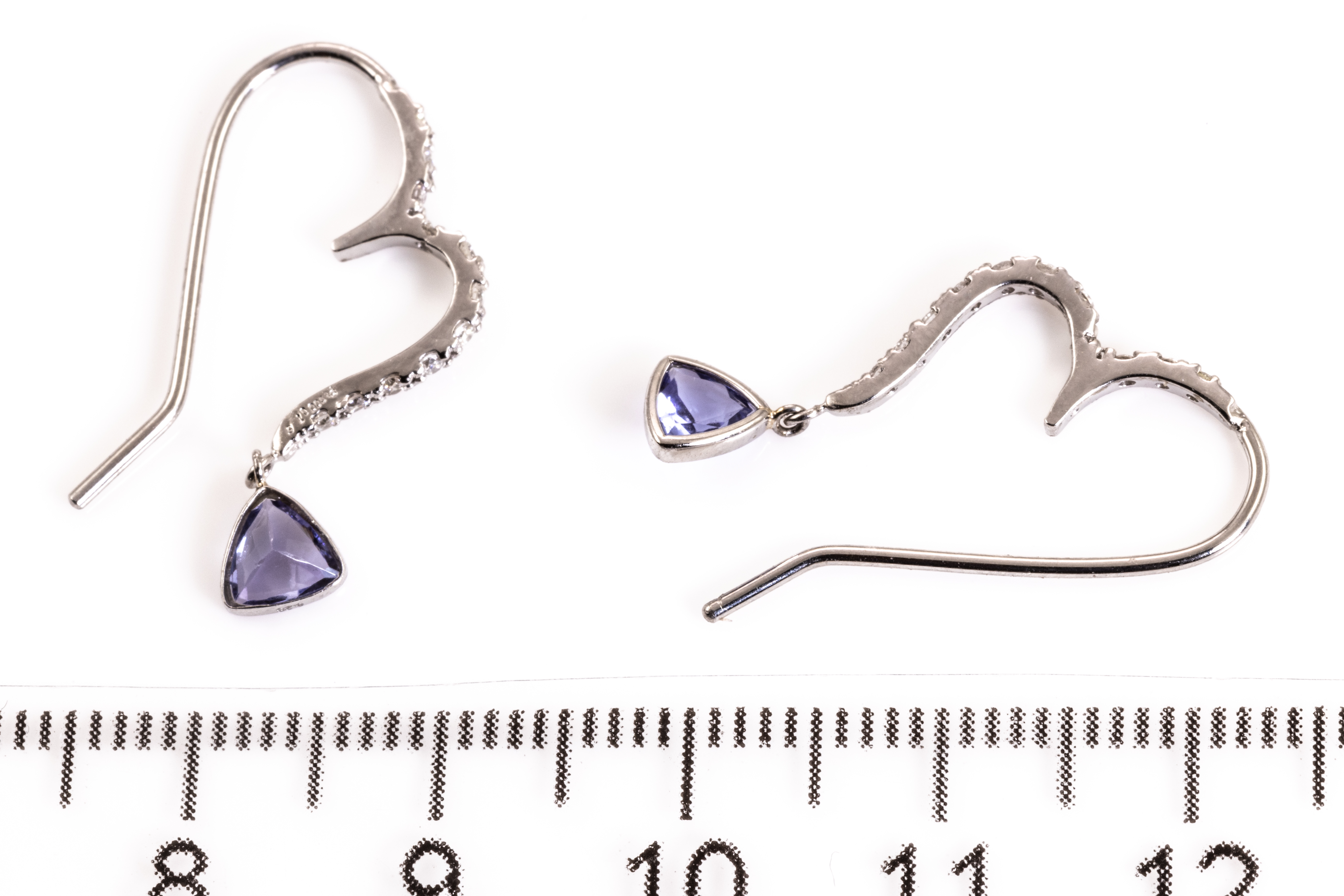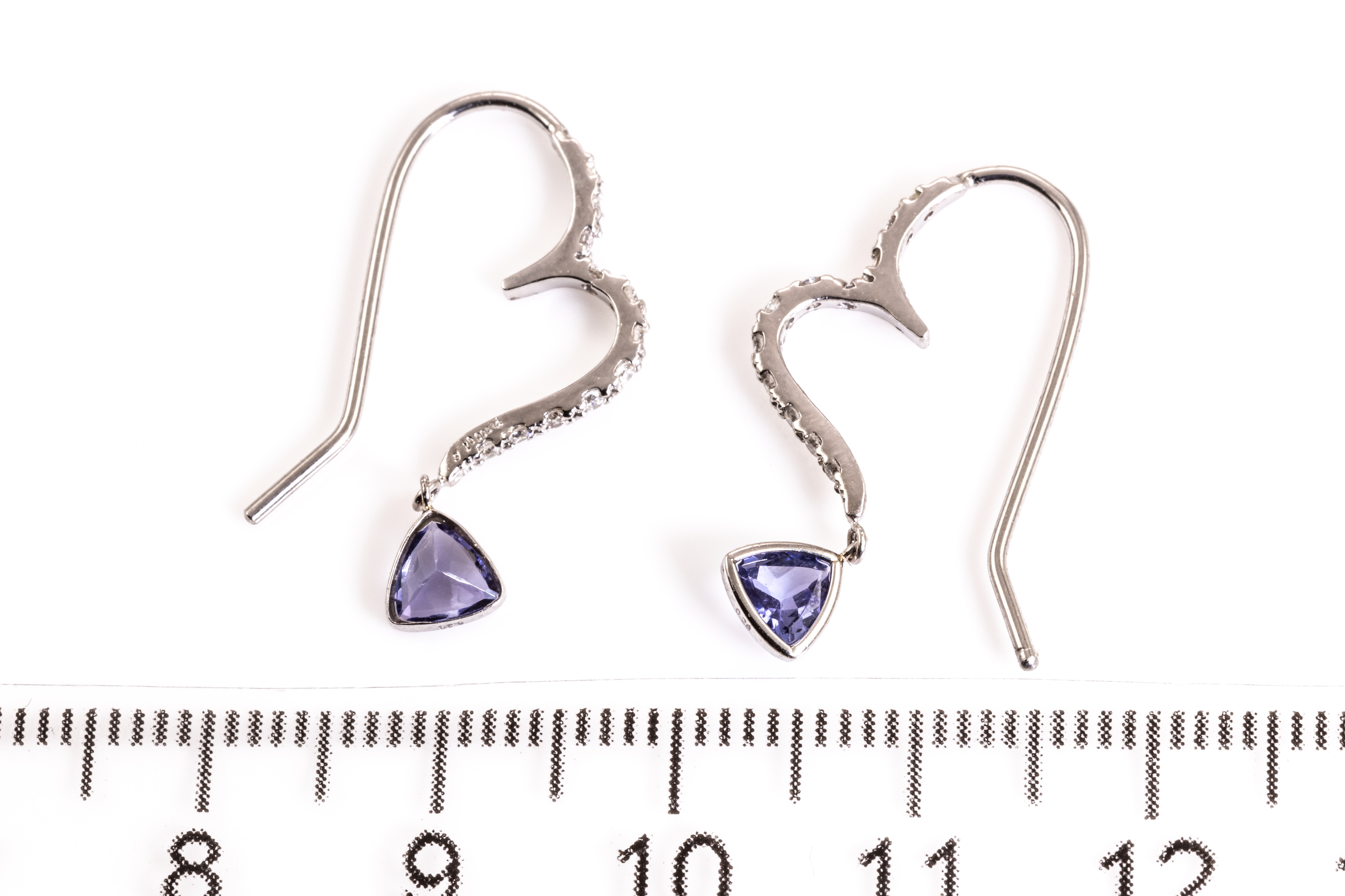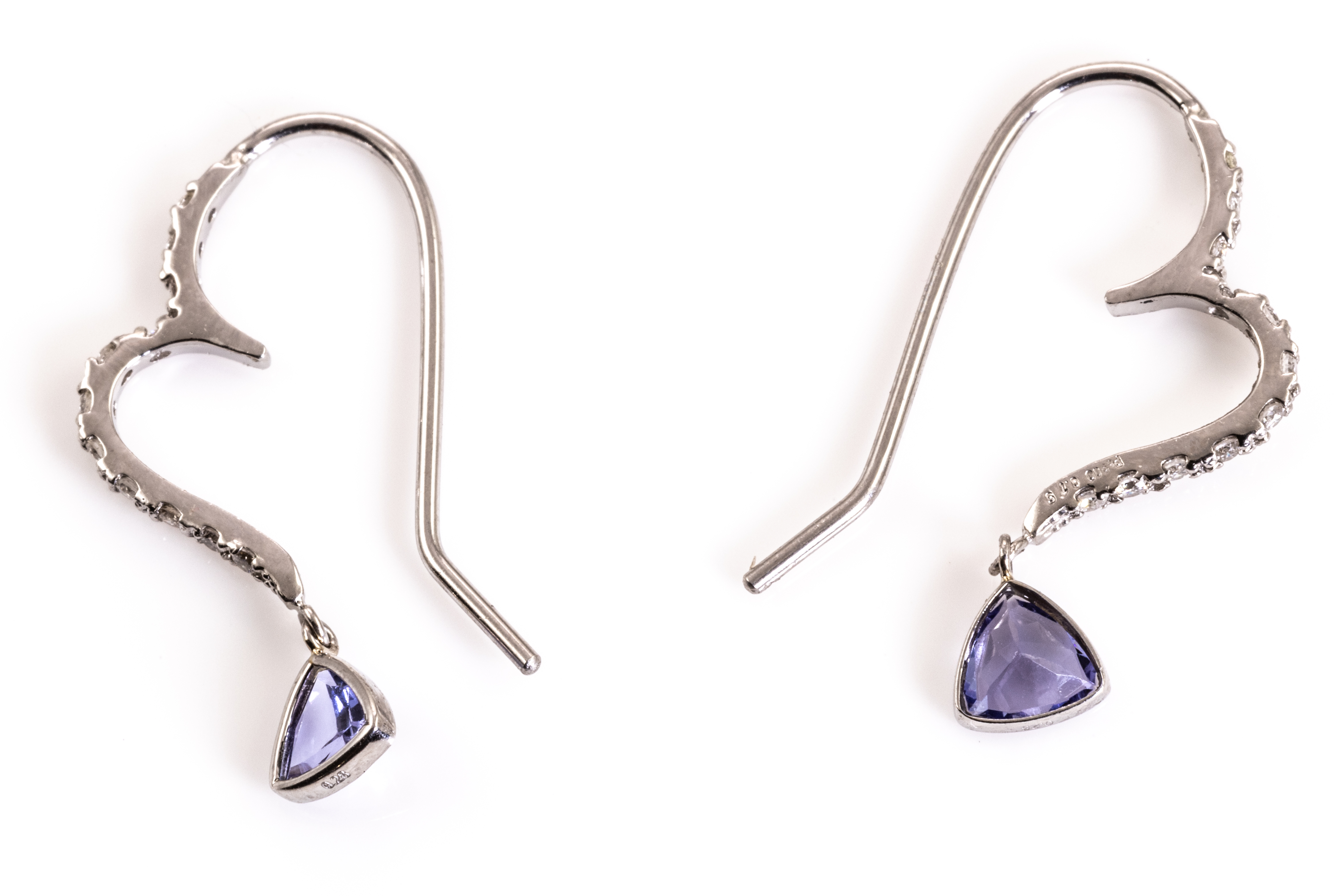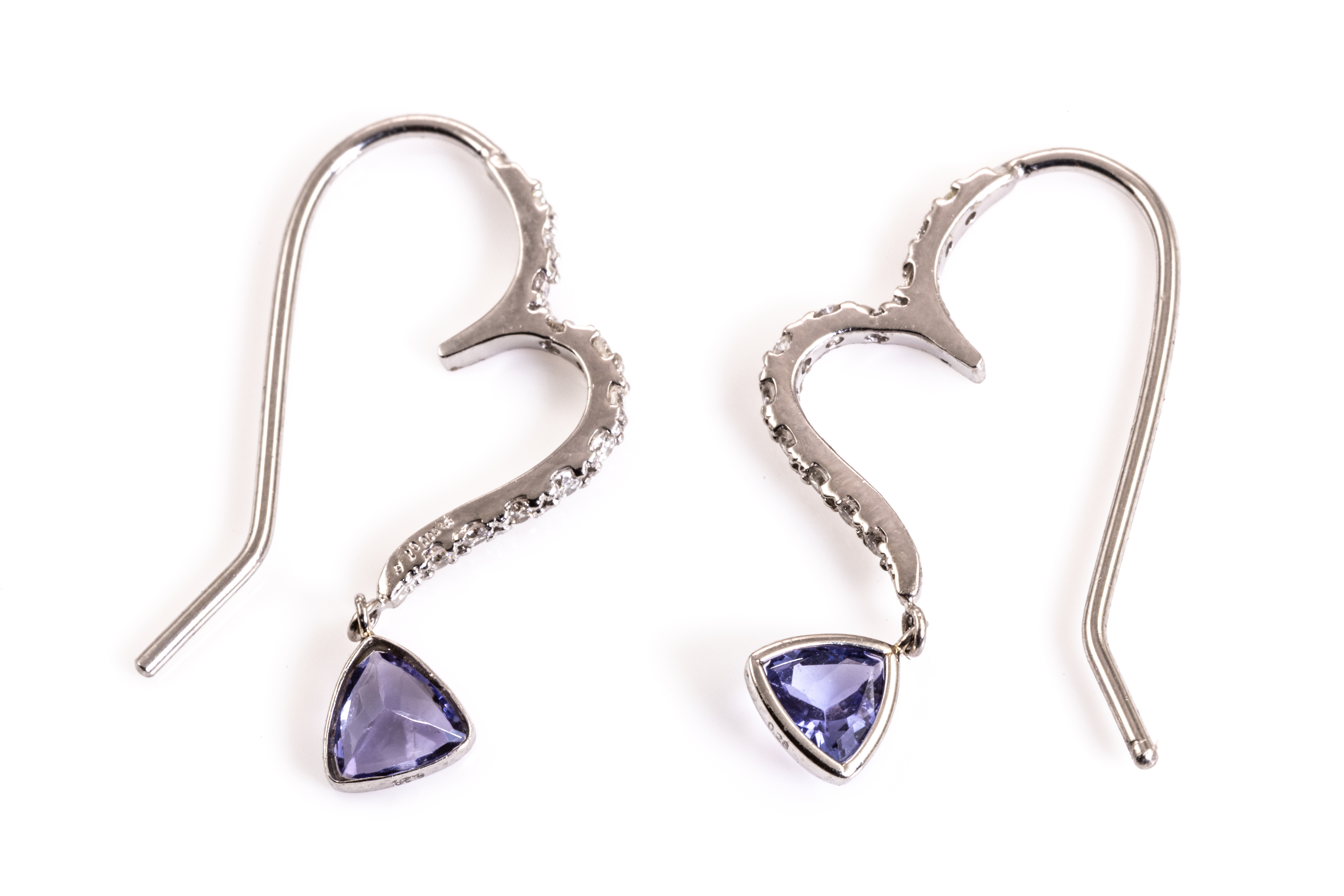 Tanzanite and Diamond shepherd hook earrings in a heart shape with triliant cut Tanzanites totalling 0.56cts and round Diamonds totalling 0.30cts (Estimated grading: H-J P1). Platinum. Weight: 1.9g. (Pre-owned)