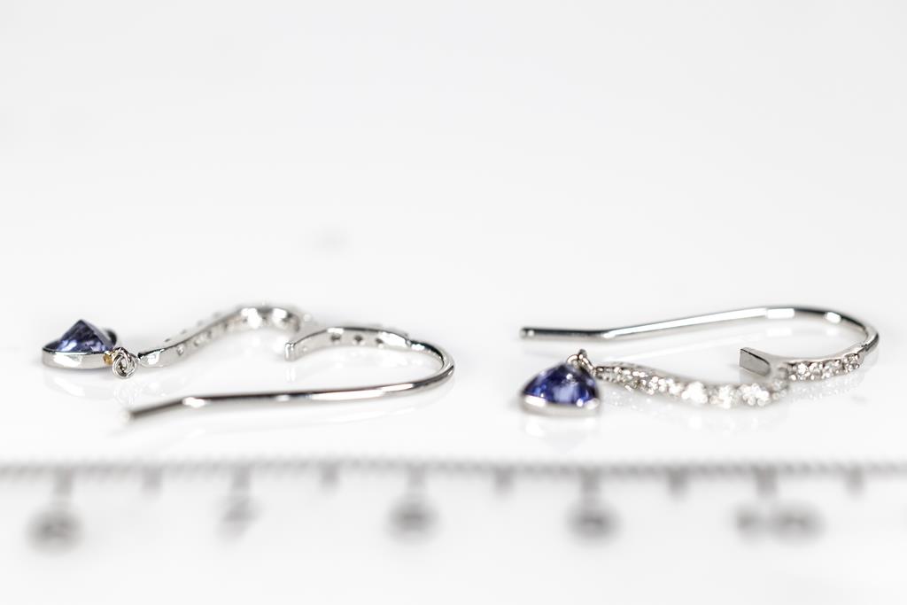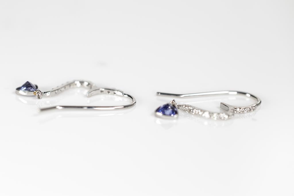 Tanzanite and Diamond earrings with triliant cut Tanzanites totalling 0.56cts and round Diamonds totalling 0.30cts (Estimated grading: I-K P1). Platinum. Weight: 1.9g. (Pre-owned)