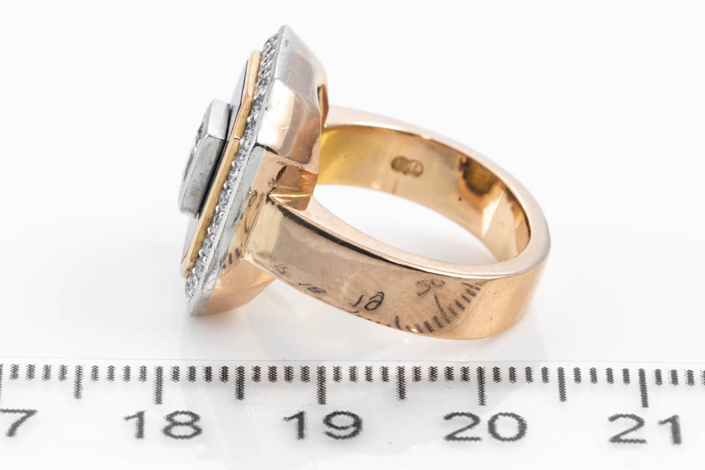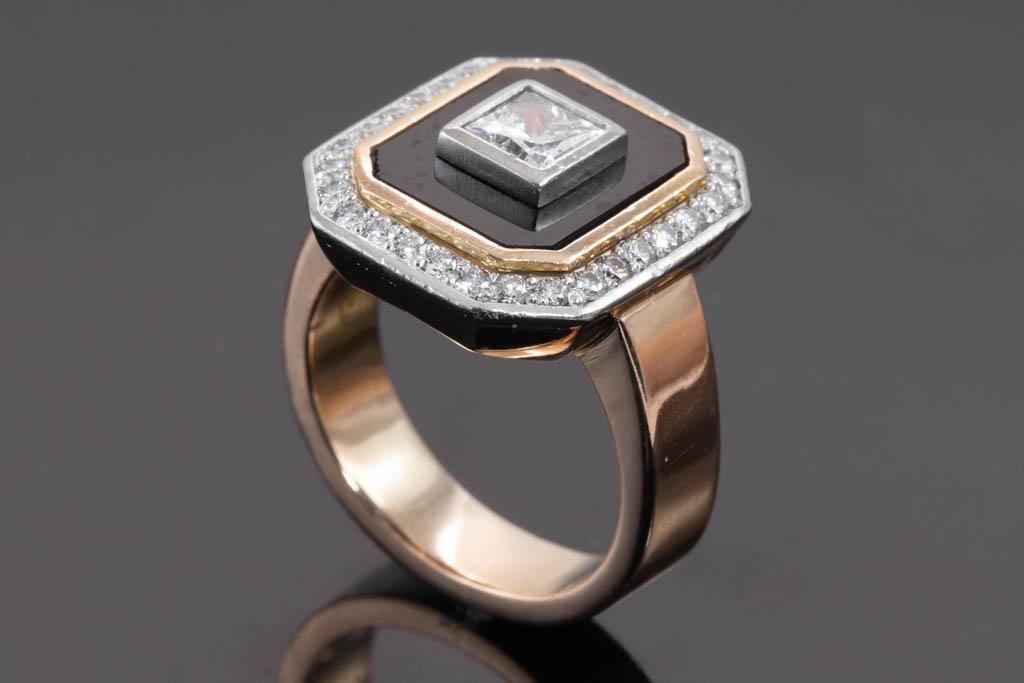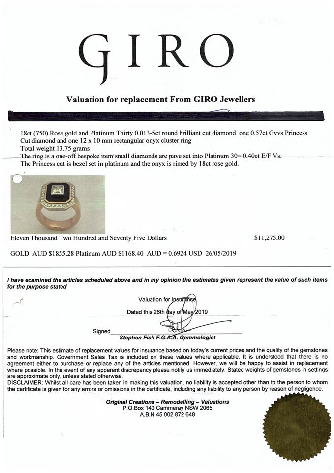 Diamond and rectangular Onyx cluster ring with princess cut Diamond of 0.57ct (Estimated grading: G VVS) and surrounding round Diamonds totalling 0.40cts (Estimated grading: E-F VS). Platinum and 18ct rose gold. Ring size J. Weight: 13.3g. With Valuation Certificate dated 26 May 2019. (Pre-owned)