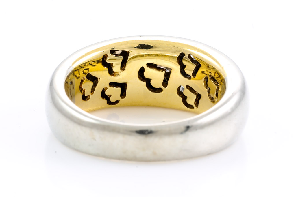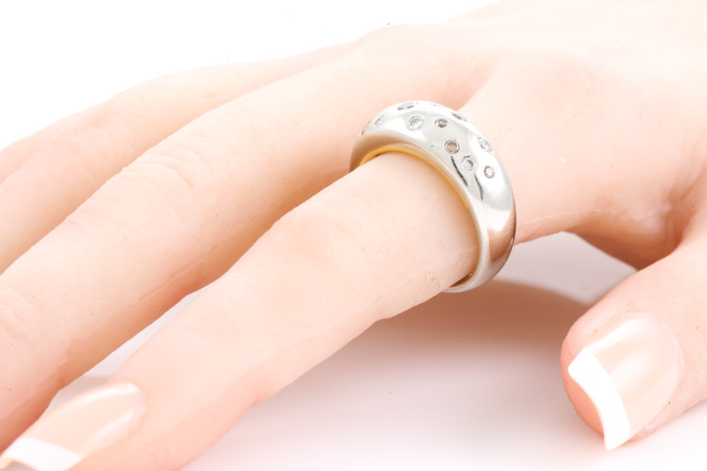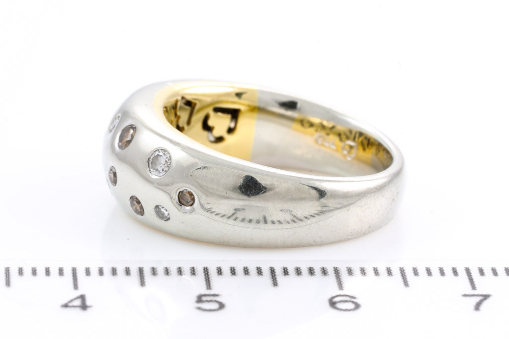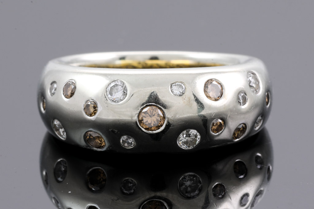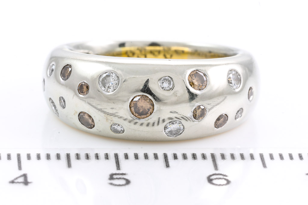 Diamond dress ring with round cut Diamonds totalling approximately 0.57cts (Estimated grading Champagne & G-H SI-P1). 18ct white and yellow gold. Ring size N - resizing not recommended. Weight 12.3g. (Pre-owned)