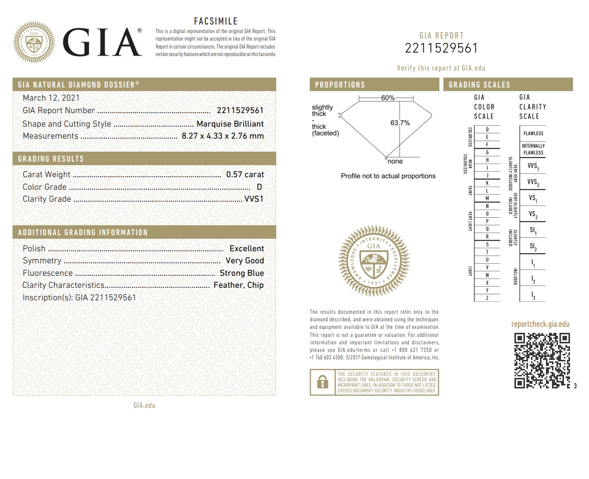 A loose marquise cut Diamond of 0.57ct (With GIA summary report graded as D VVS1 #2211529561). (New)