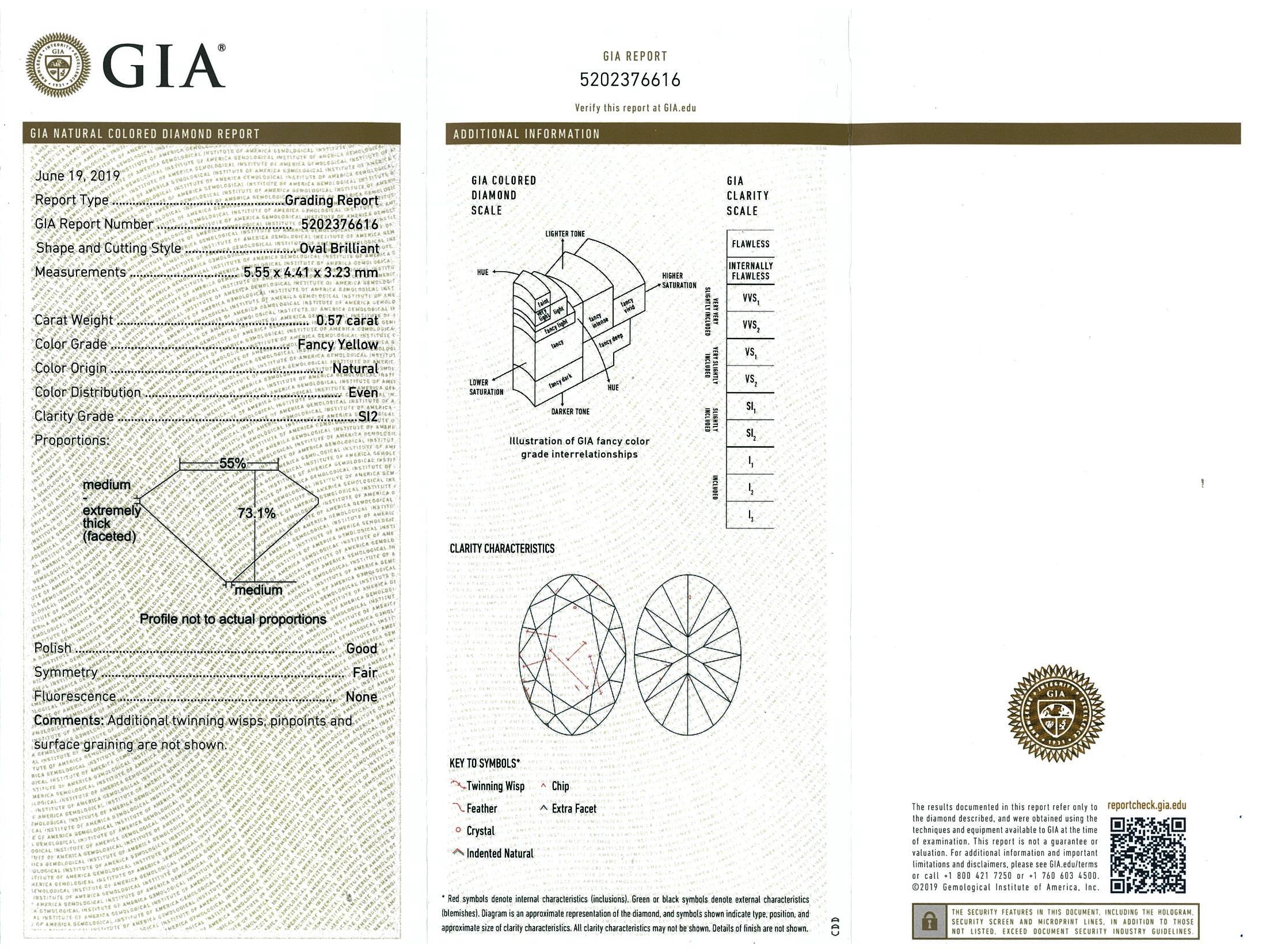A loose oval cut Fancy Yellow Diamond of 0.57ct. (With GIA report graded as Fancy Yellow SI2 #5202376616). Size 5.55 x 4.41 x 3.23mm. (As New)