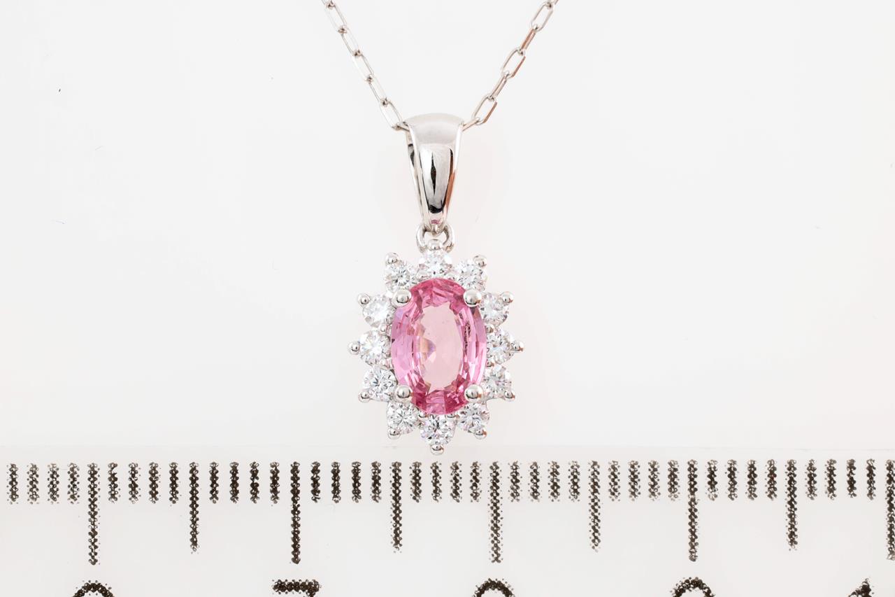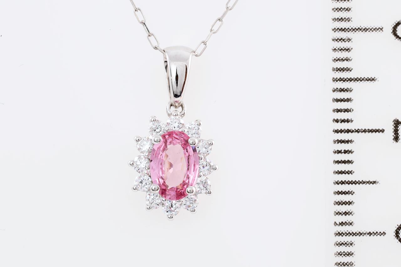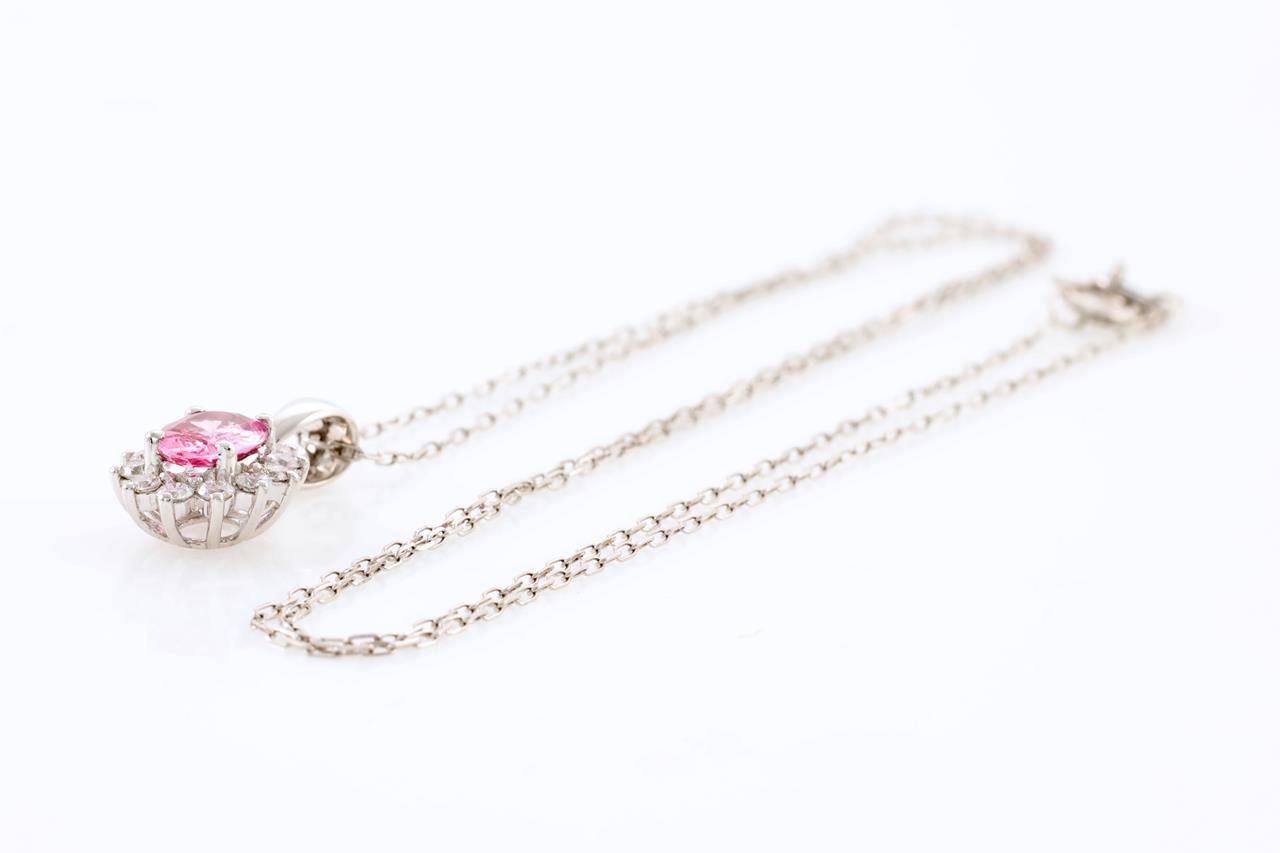 Spinel and Diamond pendant with oval pink Spinel of 0.57cts and round Diamonds totalling 0.23cts. 14ct white gold with 14ct gold 45cm chain. Weight: 1.6g (As New)